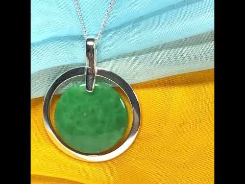 A beautiful round shaped green jade necklace within a halo circle setting made in sterling silver, with a single circle shaped jade stone in a smooth outer setting