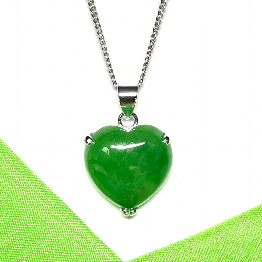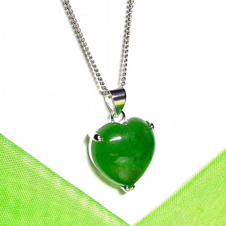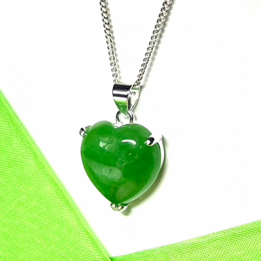 Real green jade pendant necklace that is heart shaped ns is crafted from solid sterling silver