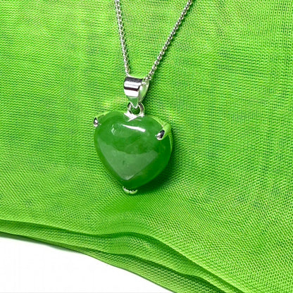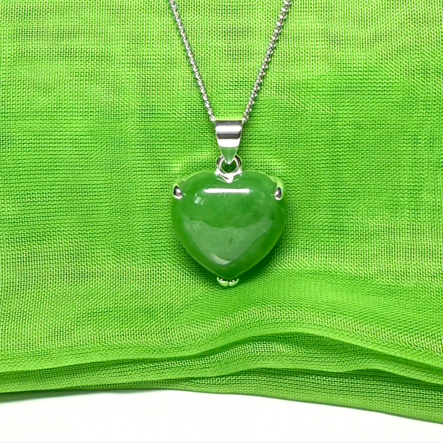 A beautiful heart shaped green jade necklace in sterling silver, with a single heart shaped jade stone in a claw setting