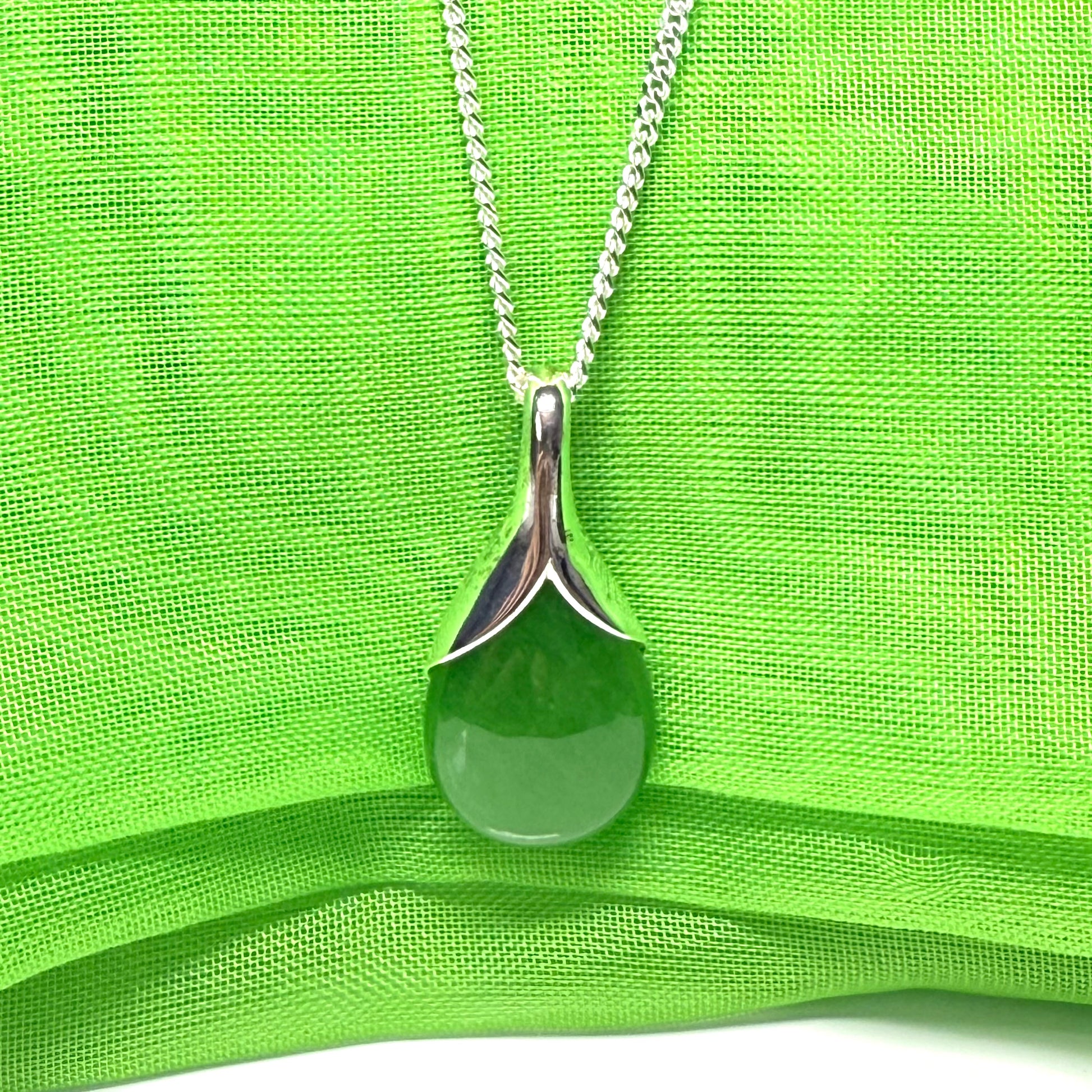 A teardrop silver necklace with green jade, a beautiful green pear shaped real green jade necklace pendant made in sterling silver