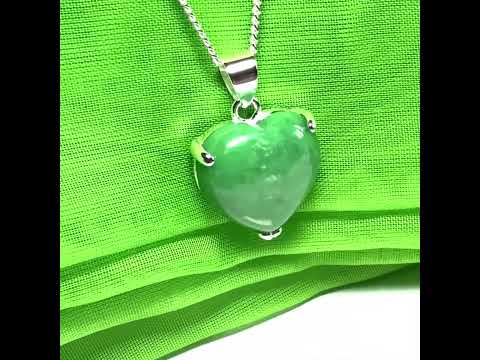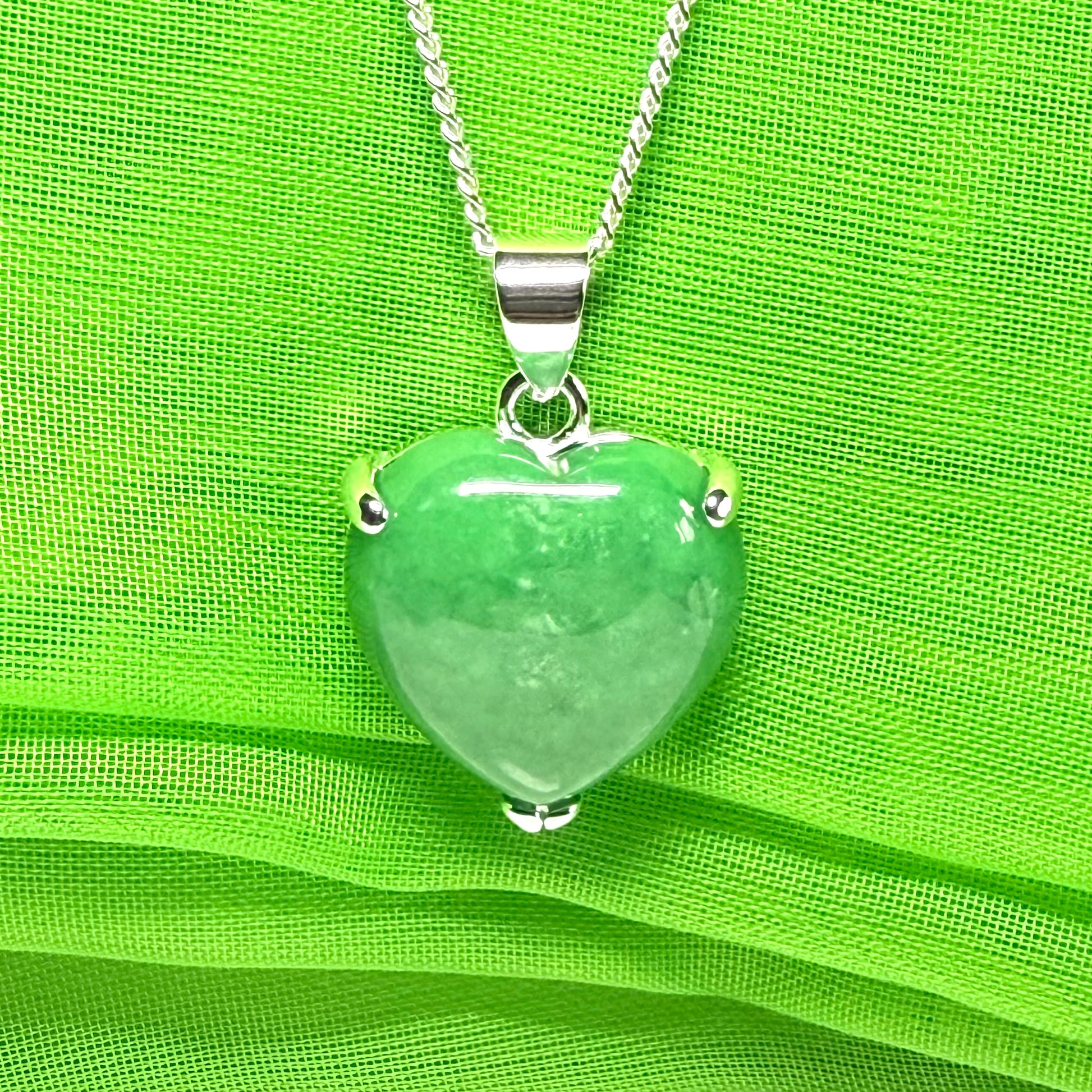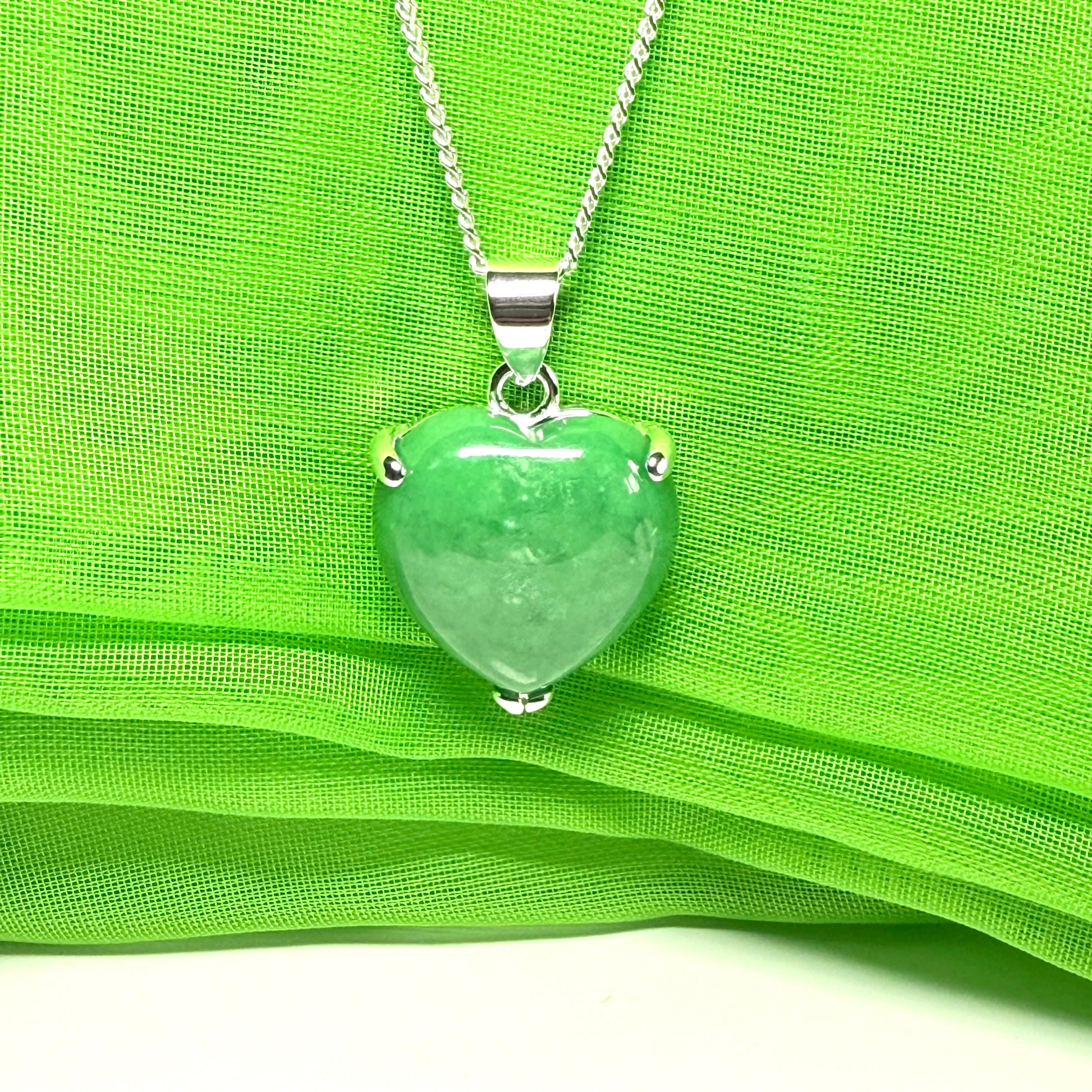 A beautiful heart shaped green jade necklace in sterling silver, with a single heart shaped jade stone in a claw setting