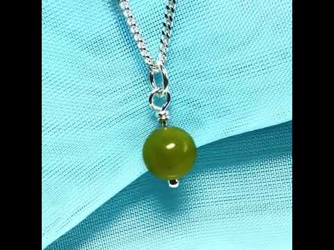 A beautiful small round light green real gypsum necklace pendant, in a ball shaped green real gypsum stone, made in sterling silver, with a single ball shaped real gypsum stone hanging from a simple setting, including a solid sterling silver curb chain