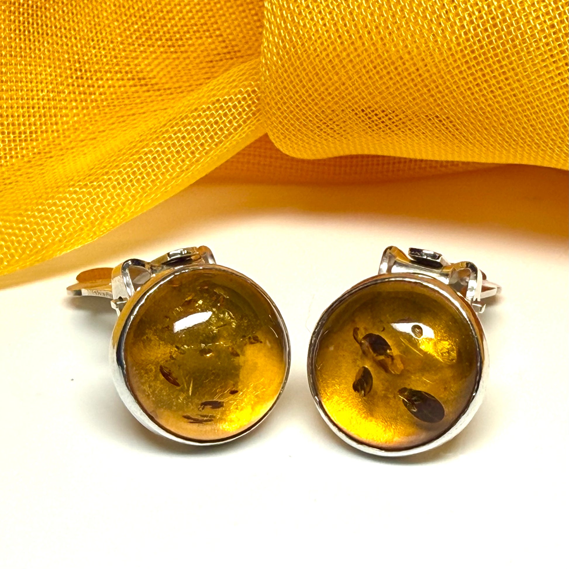 Real amber clip on earrings round sterling silver