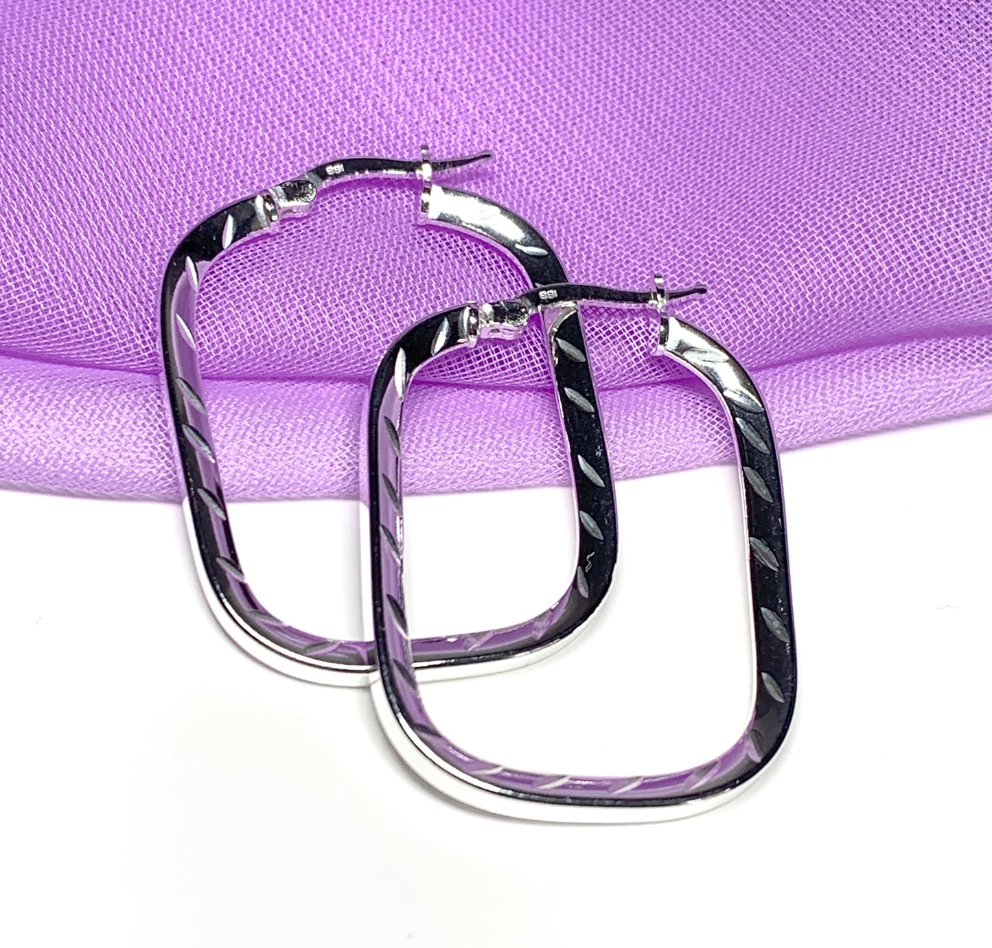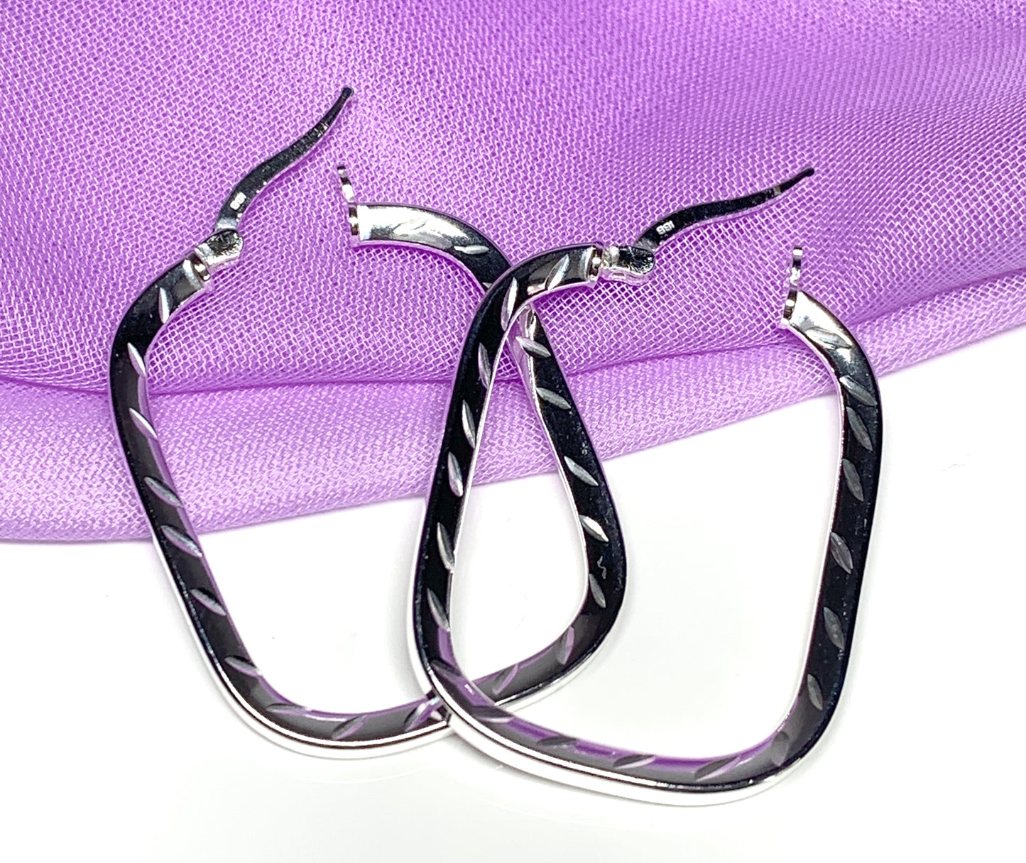 A pair of diamond cut fancy patterned sterling silver square shaped hoop earrings, a little bit unusual and different to the standard round hoop earring shape