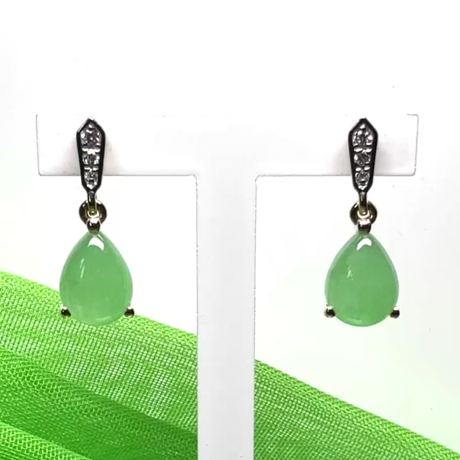 Having a pear shaped or teardrop shaped green real jade stone and three round shaped real white naturally mined diamond stones set above it in each earring