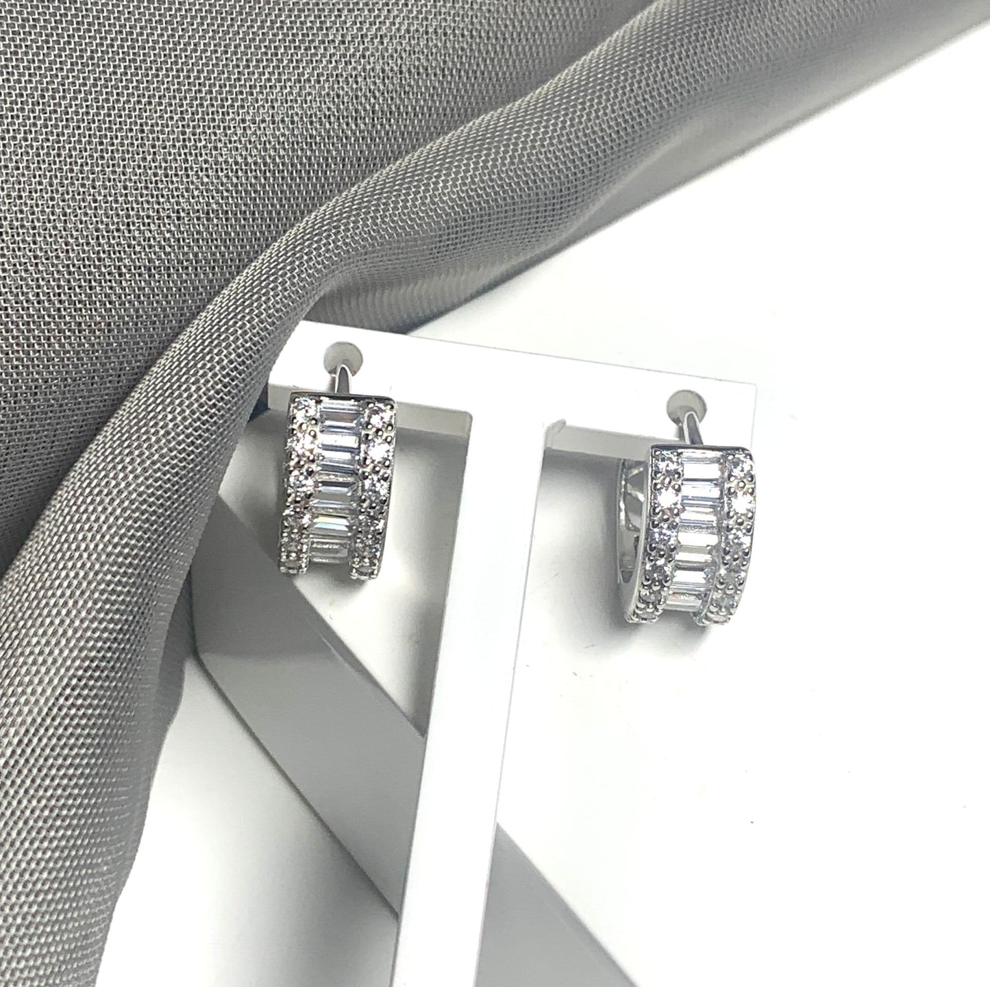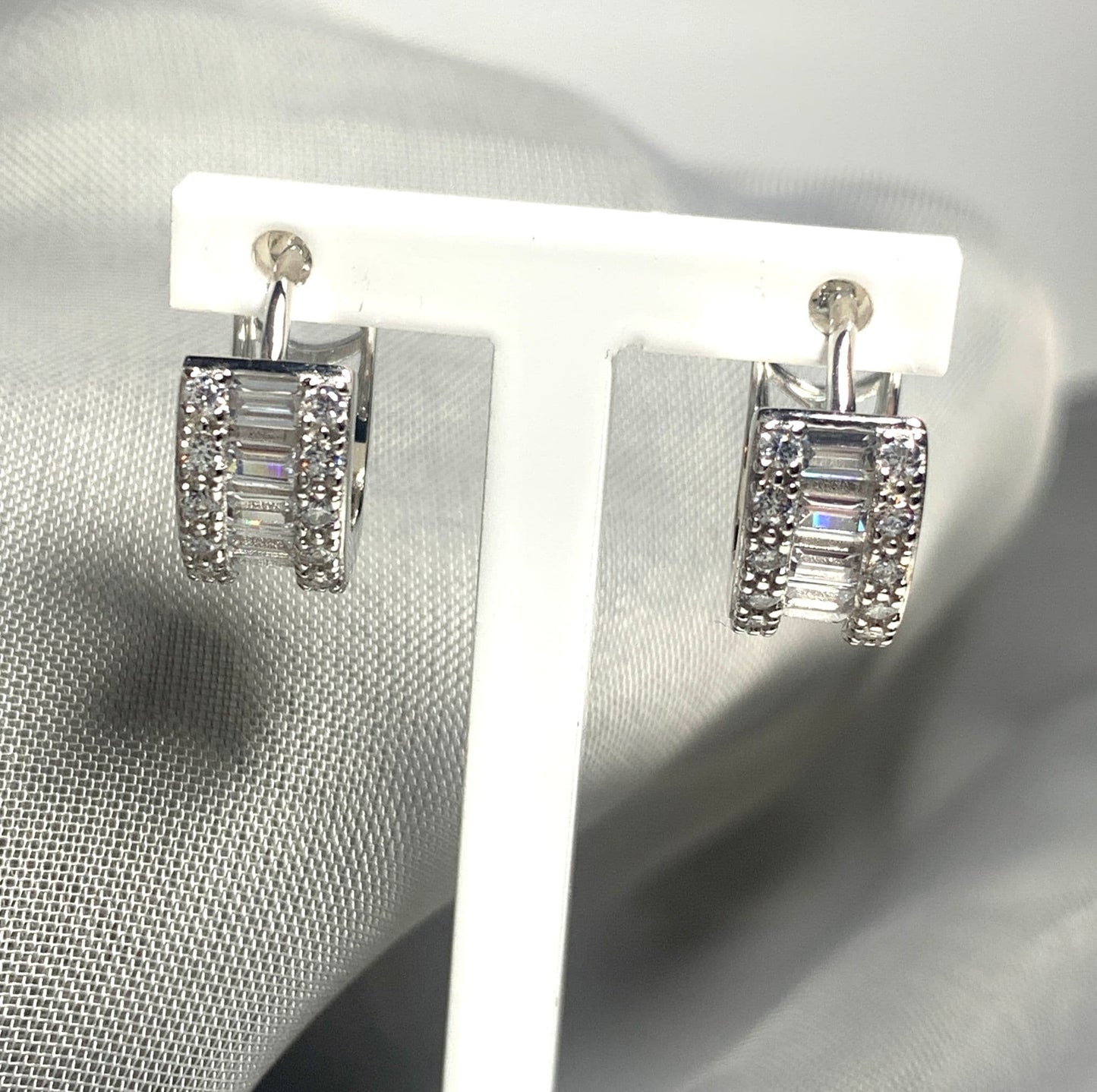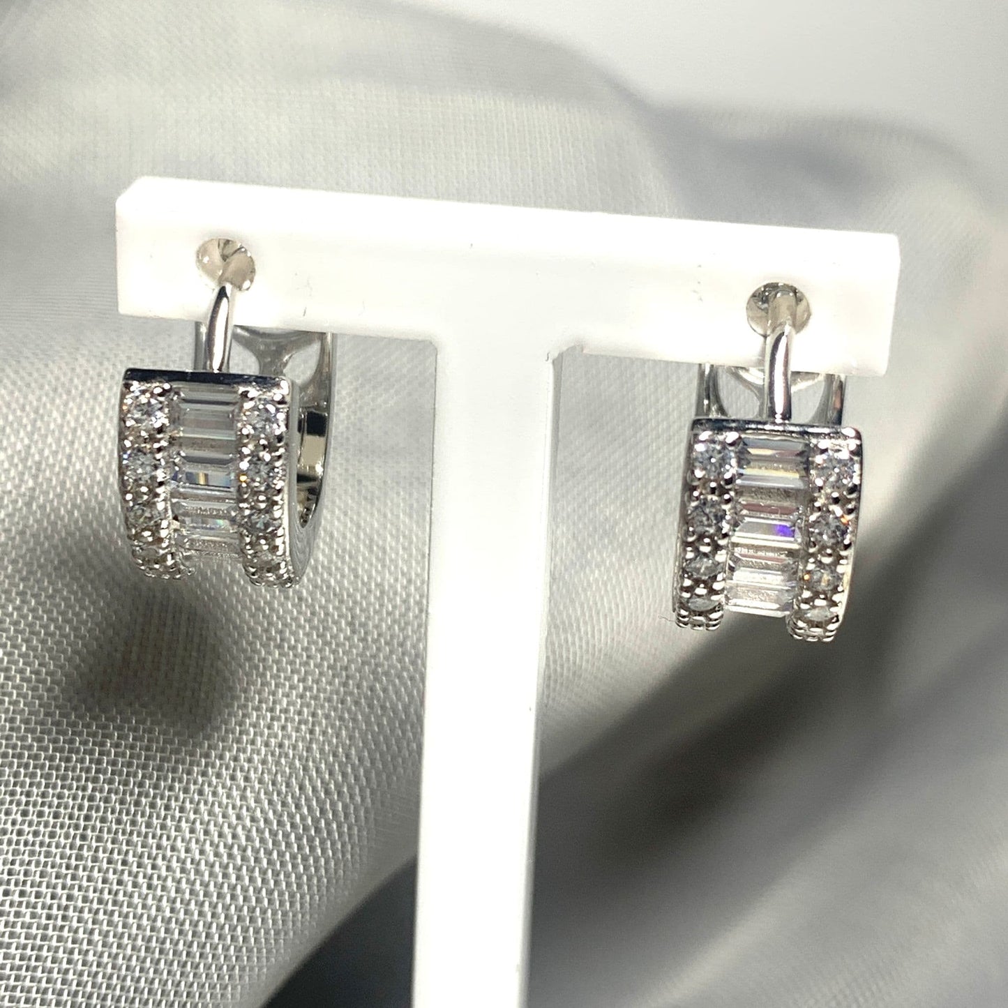 A lovely fancy pair of stone set huggie earrings, made in sterling silver, round in shape, with baguette cut and round cut cubic zirconia stones set into the hoop earrings, measuring 14 mm and having a lovely swirl pattern on them and are a perfect gift for an anniversary present, a birthday present or even a treat for yourself, coming complete with a lovely presentation box and with free delivery to the UK,