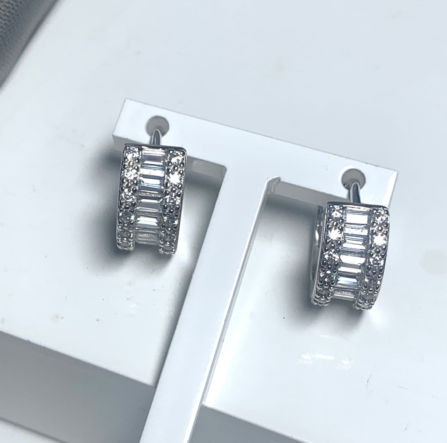 A very sparkly pair of huggie hoop earrings with round and baguette cut stones