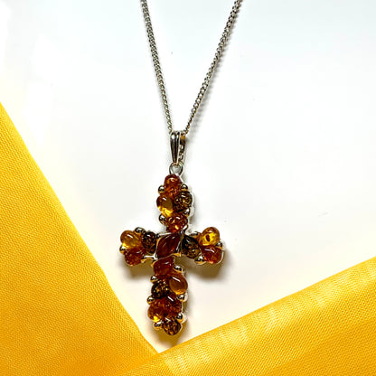 Orange coloured dark and light real amber sterling silver cross shaped necklace