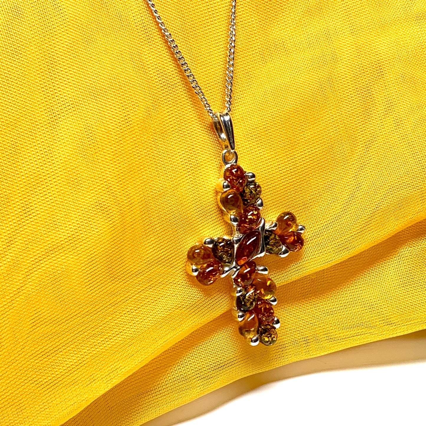 A stunningly beautiful real amber cross fancy shaped necklace pendant crafted in solid sterling