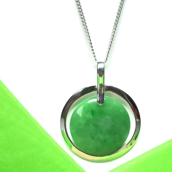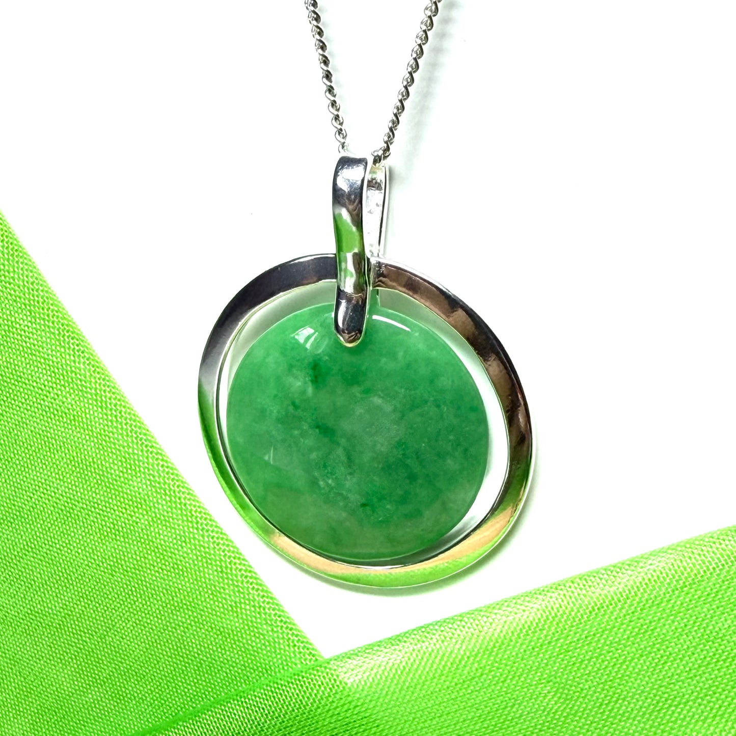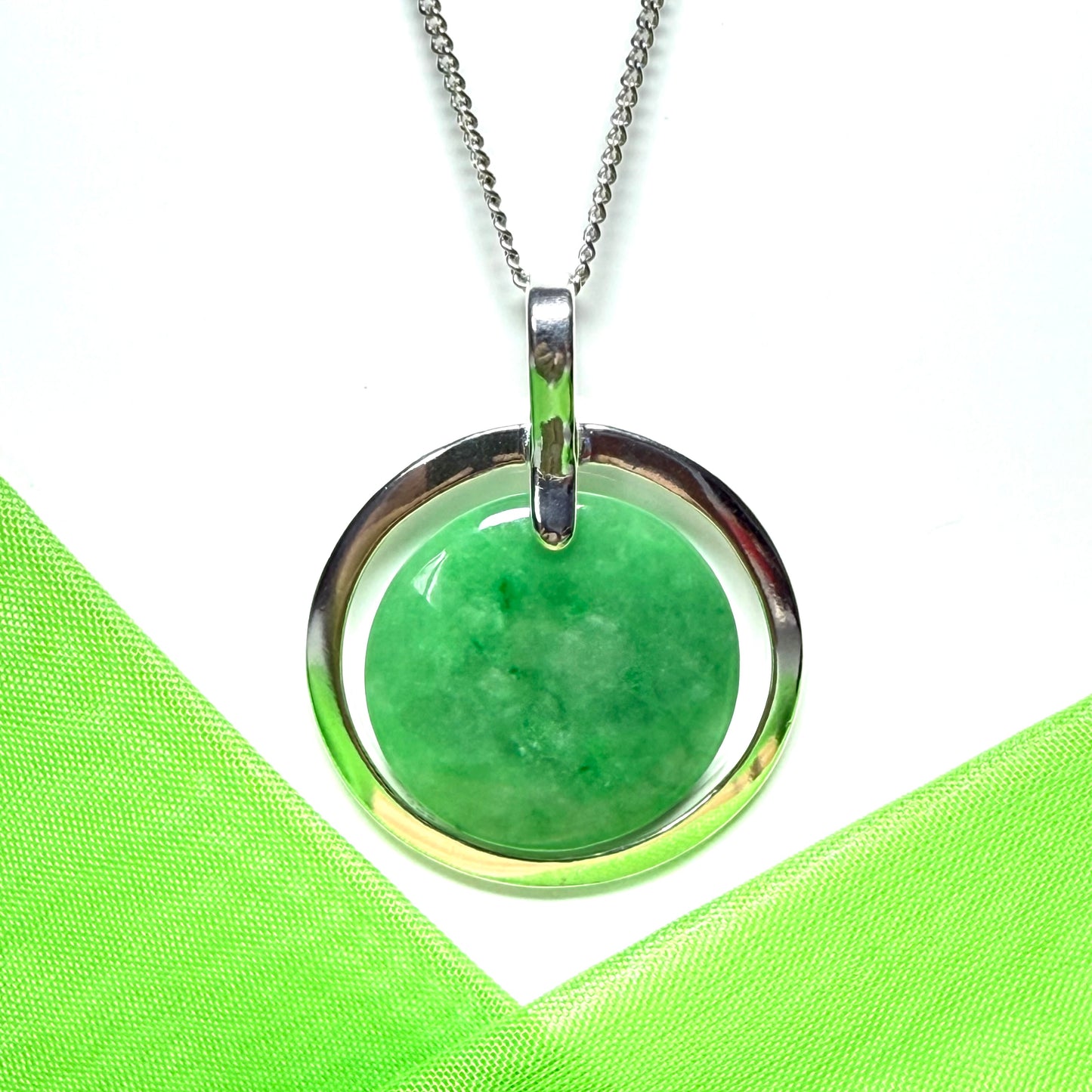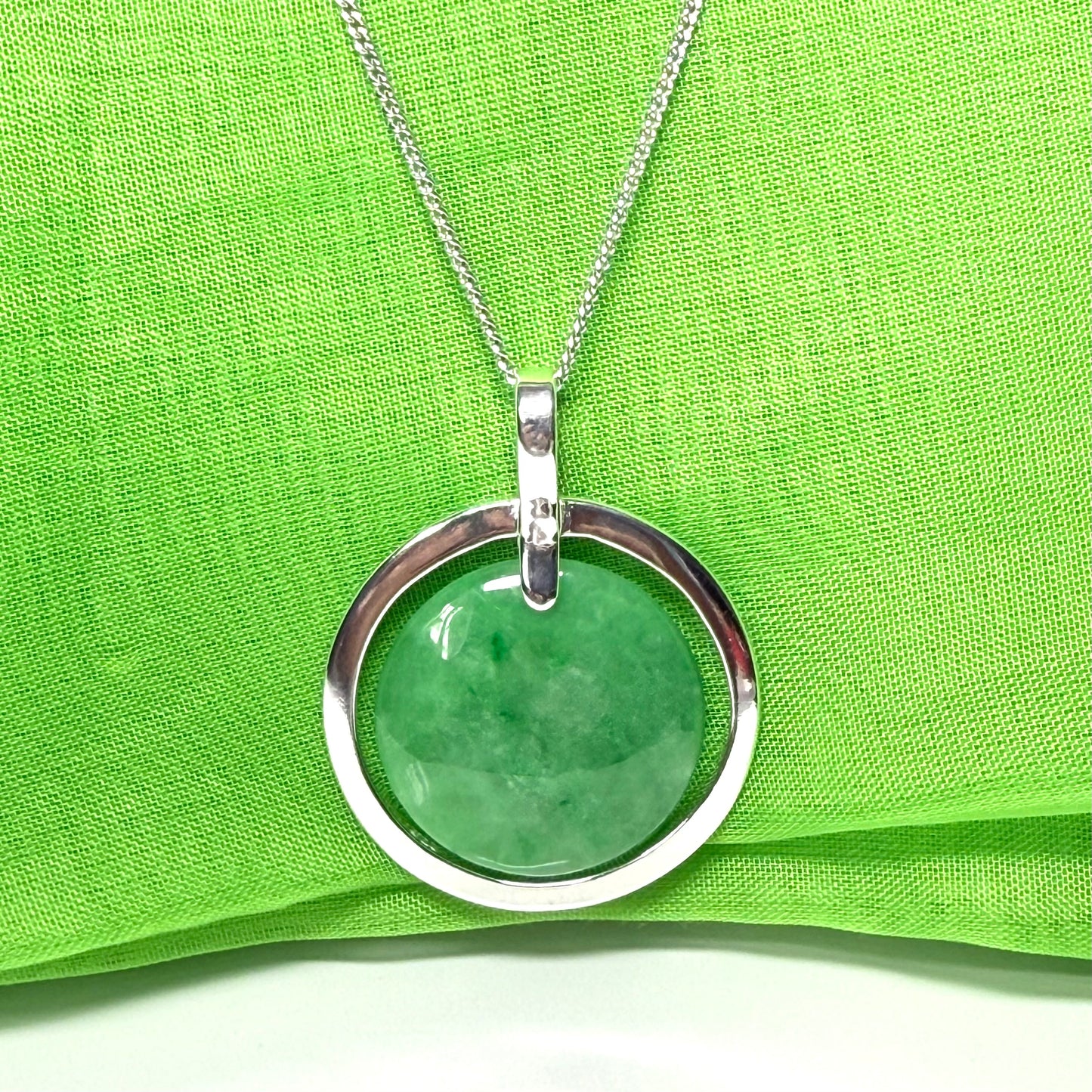 A beautiful round shaped green real jade necklace within a halo circle setting made in sterling silver, with a single circle shaped jade stone in a smooth outer setting