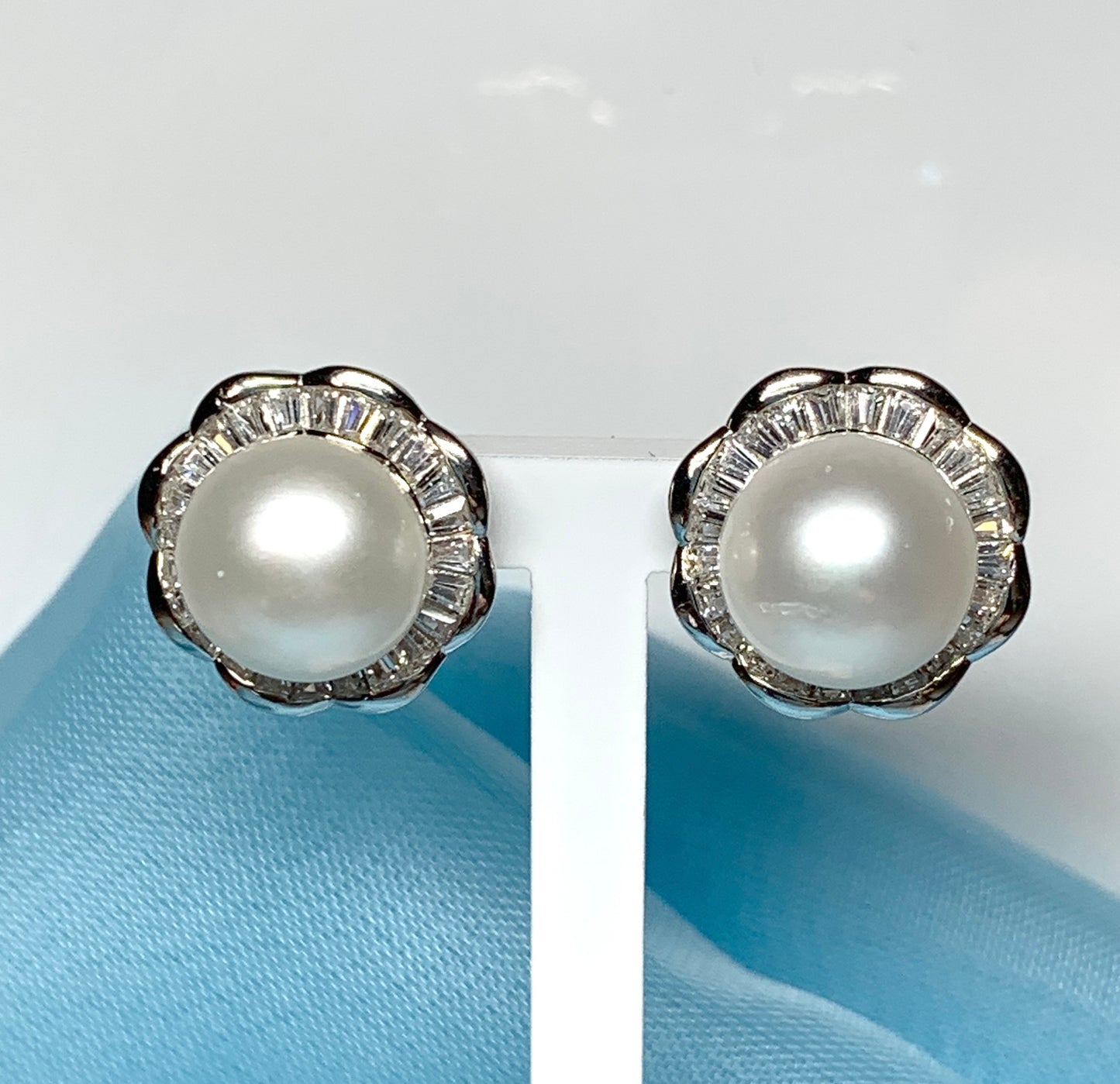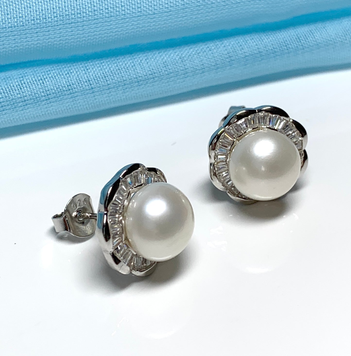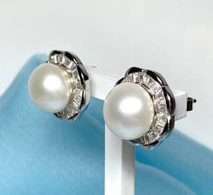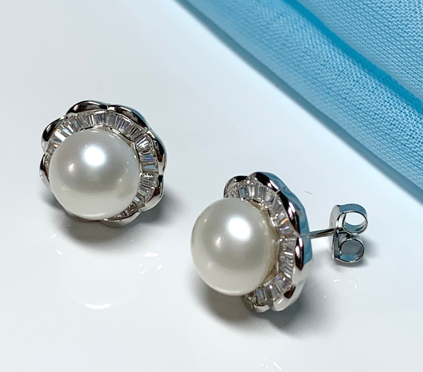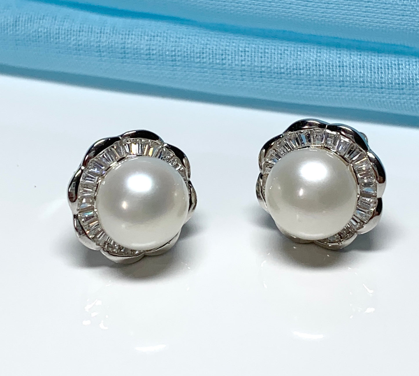 A gorgeous large round shaped pair of sterling silver real freshwater cultured pearl stud earrings with graduated baguette cut cubic zirconia stones surrounding it