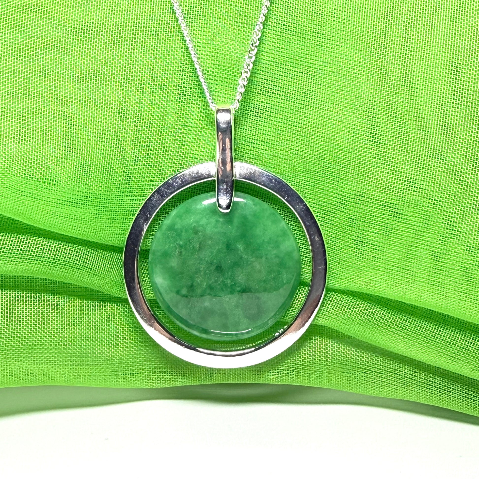 A beautiful round shaped dark green jade necklace within a halo circle setting made in sterling silver, with a single circle shaped jade stone in a smooth outer setting, including a solid sterling silver curb chain