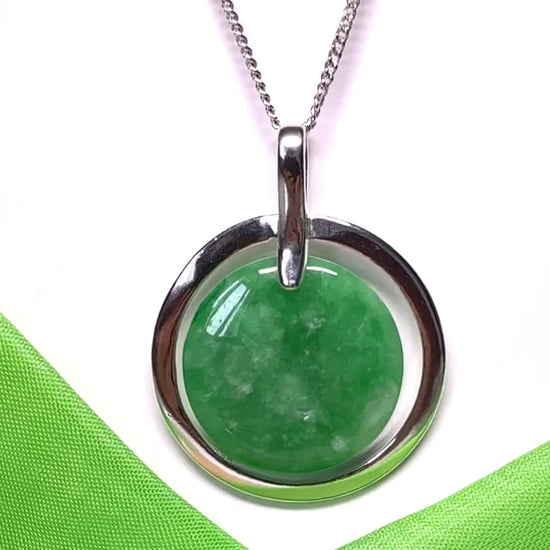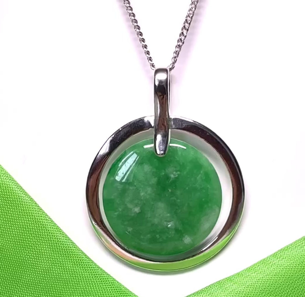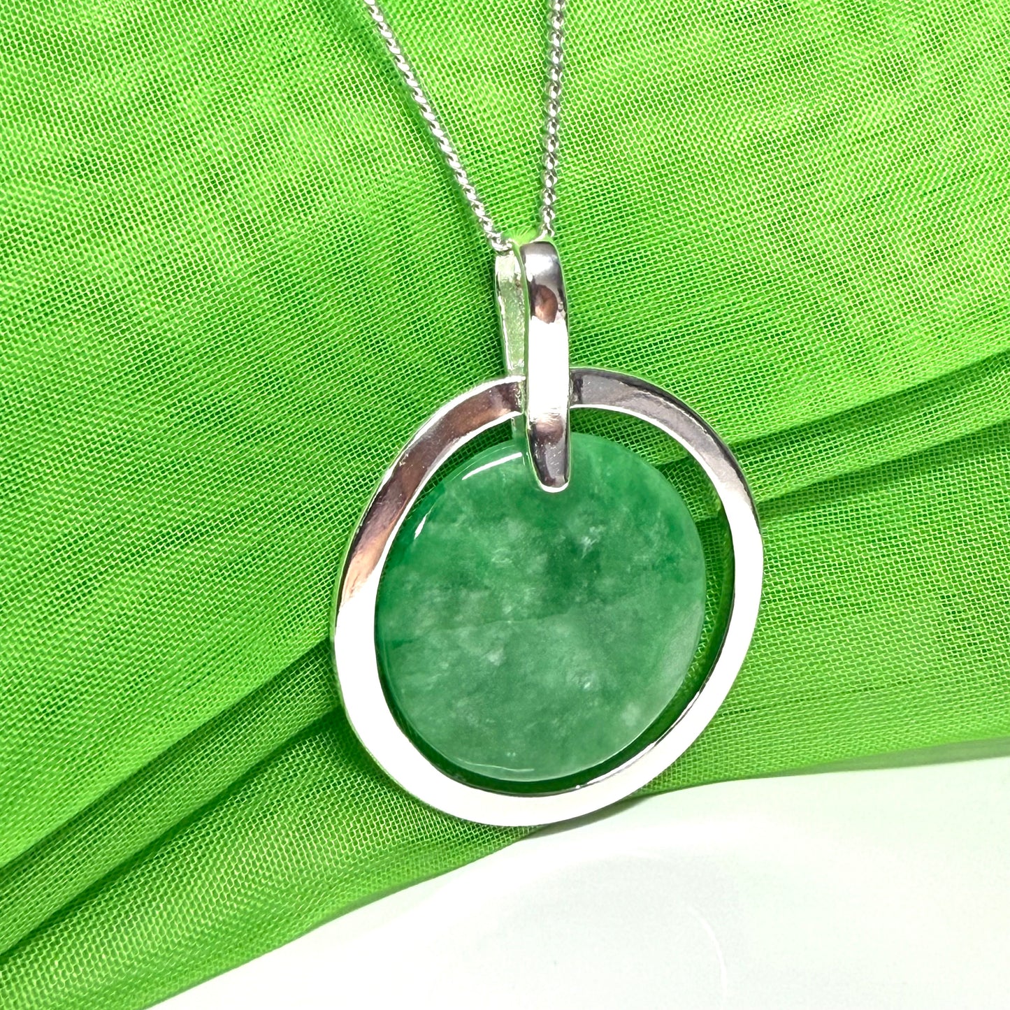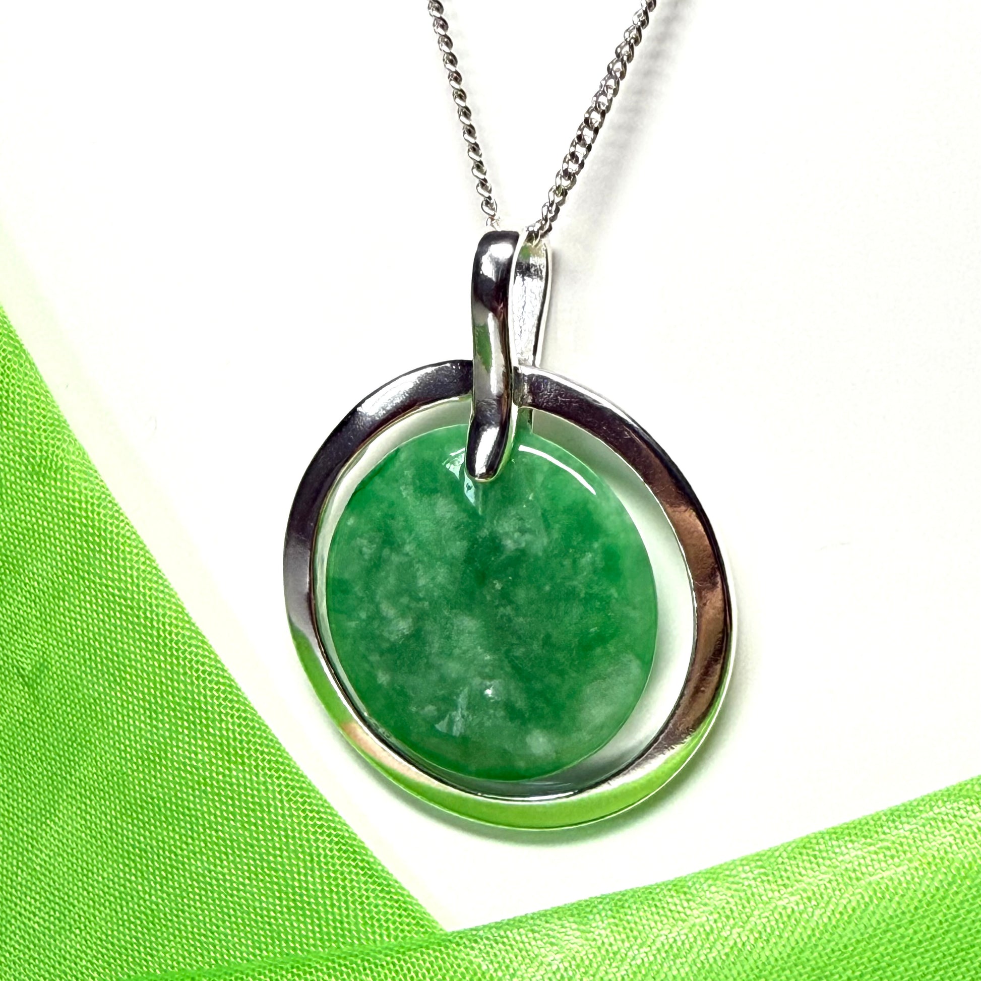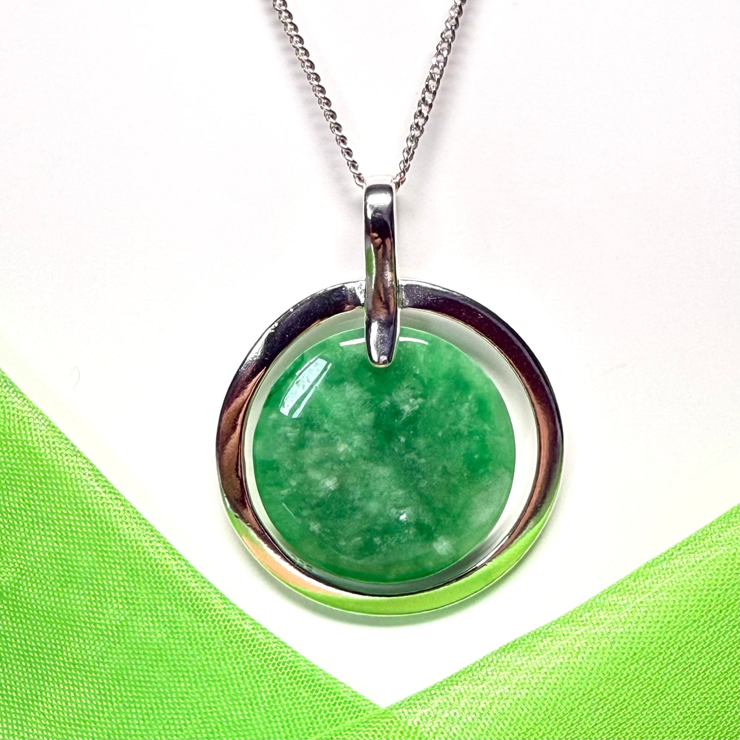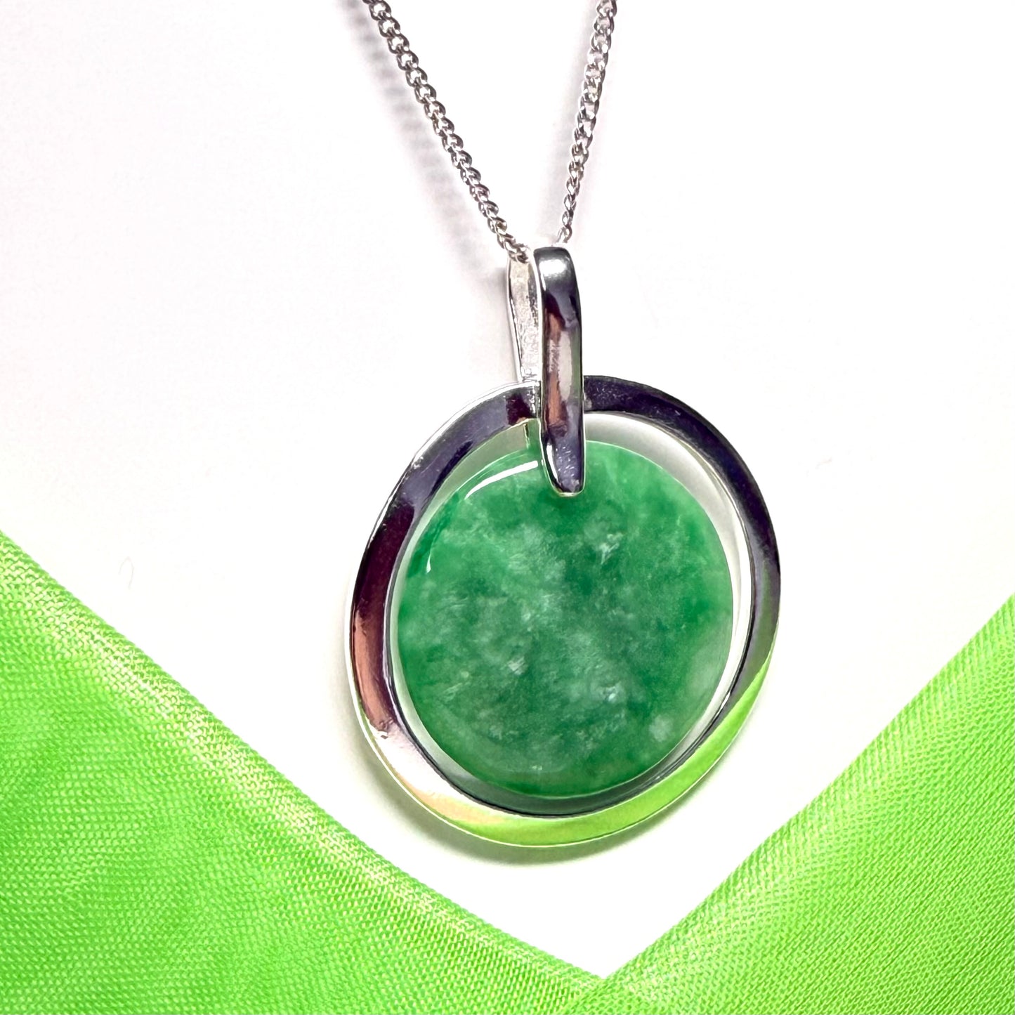 A beautiful round shaped green jade necklace within a halo circle setting made in sterling silver, with a single circle shaped jade stone in a smooth outer setting