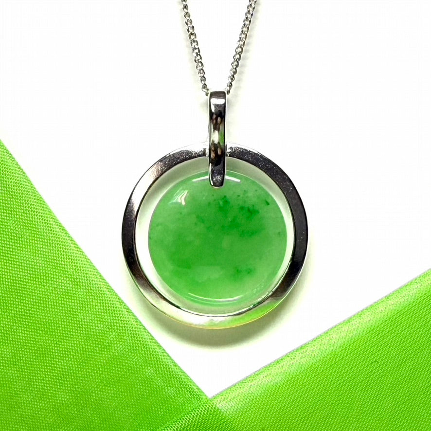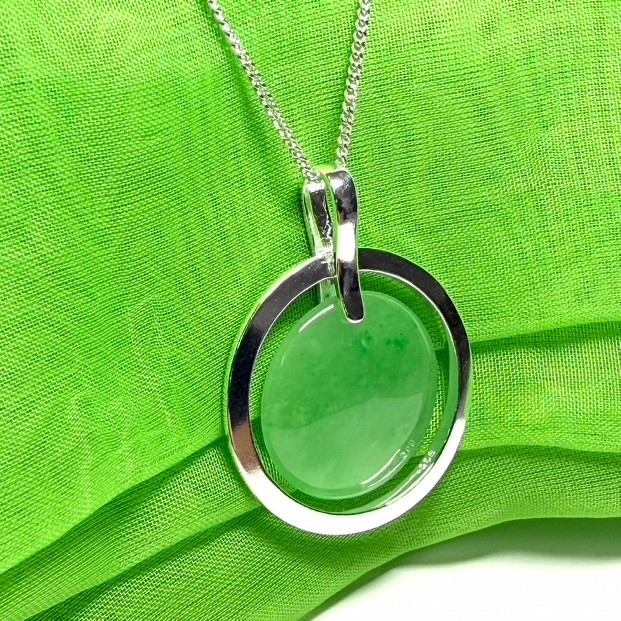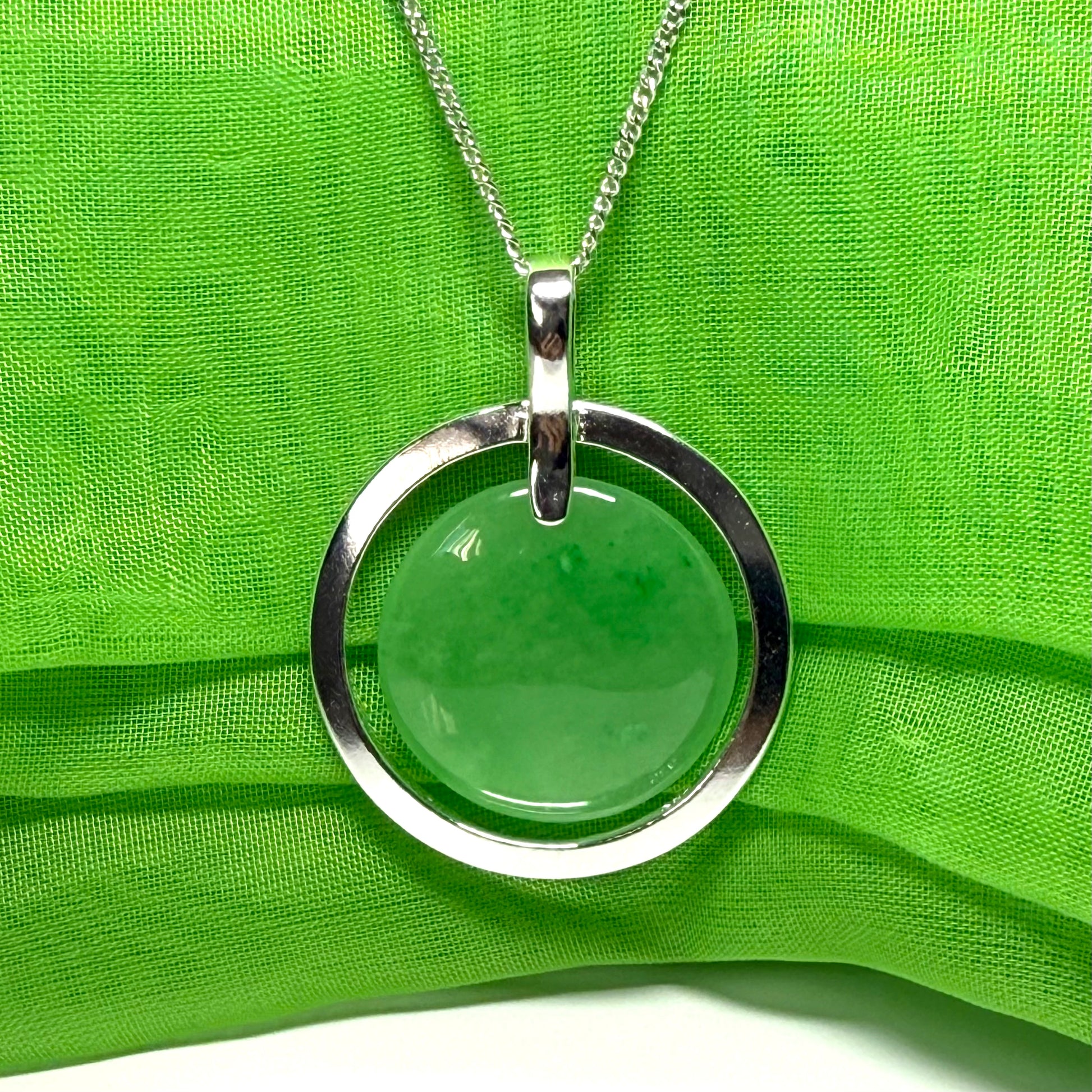 A beautiful round shaped green jade necklace within a halo circle setting made in sterling silver, with a single circle shaped jade stone in a smooth outer setting, including a solid sterling silver curb chain