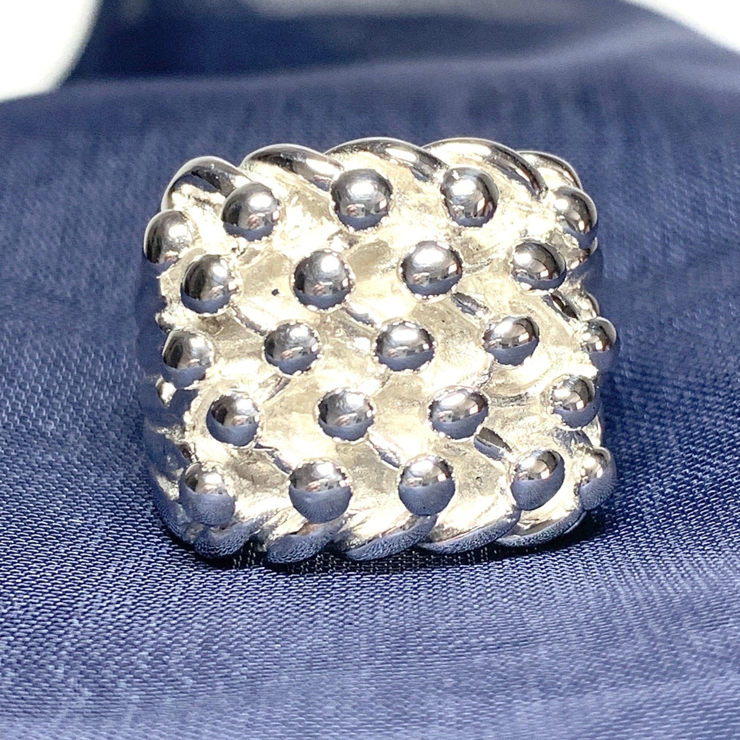 Made in shimmering 925 sterling silver with a striking piece look to the ring, having four rows in the knot and shot pattern to the keeper design