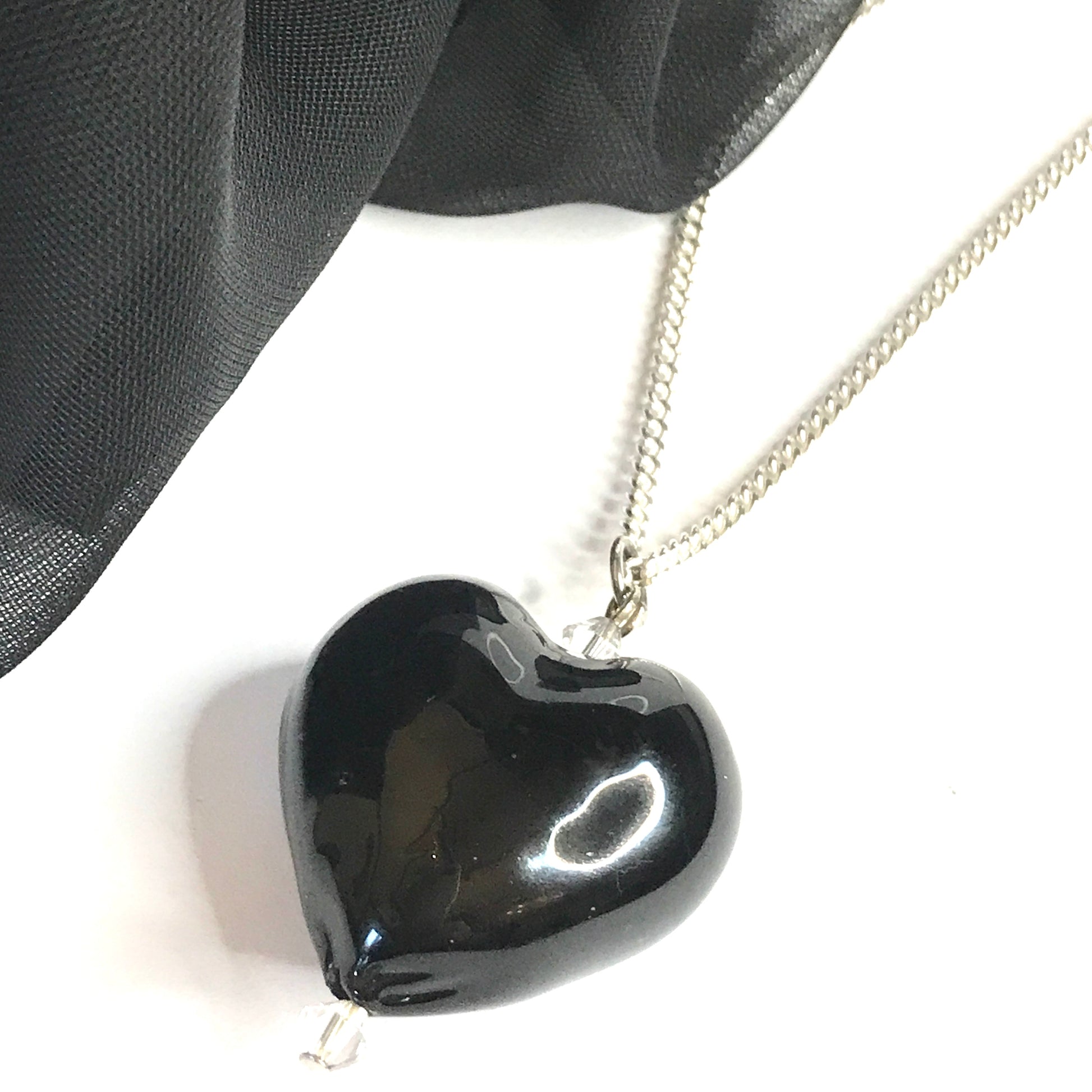 A beautiful handmade heart shaped black real Murano glass necklace, that has been created using Genuine Murano glass, on a solid sterling silver chain