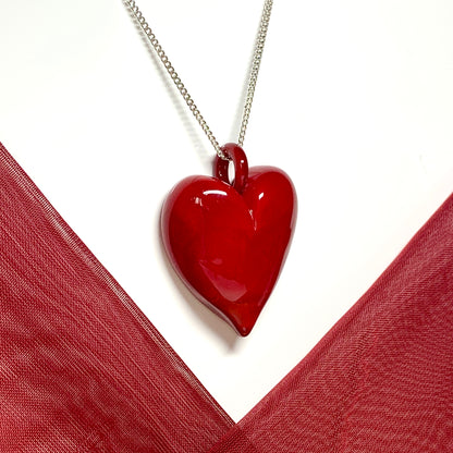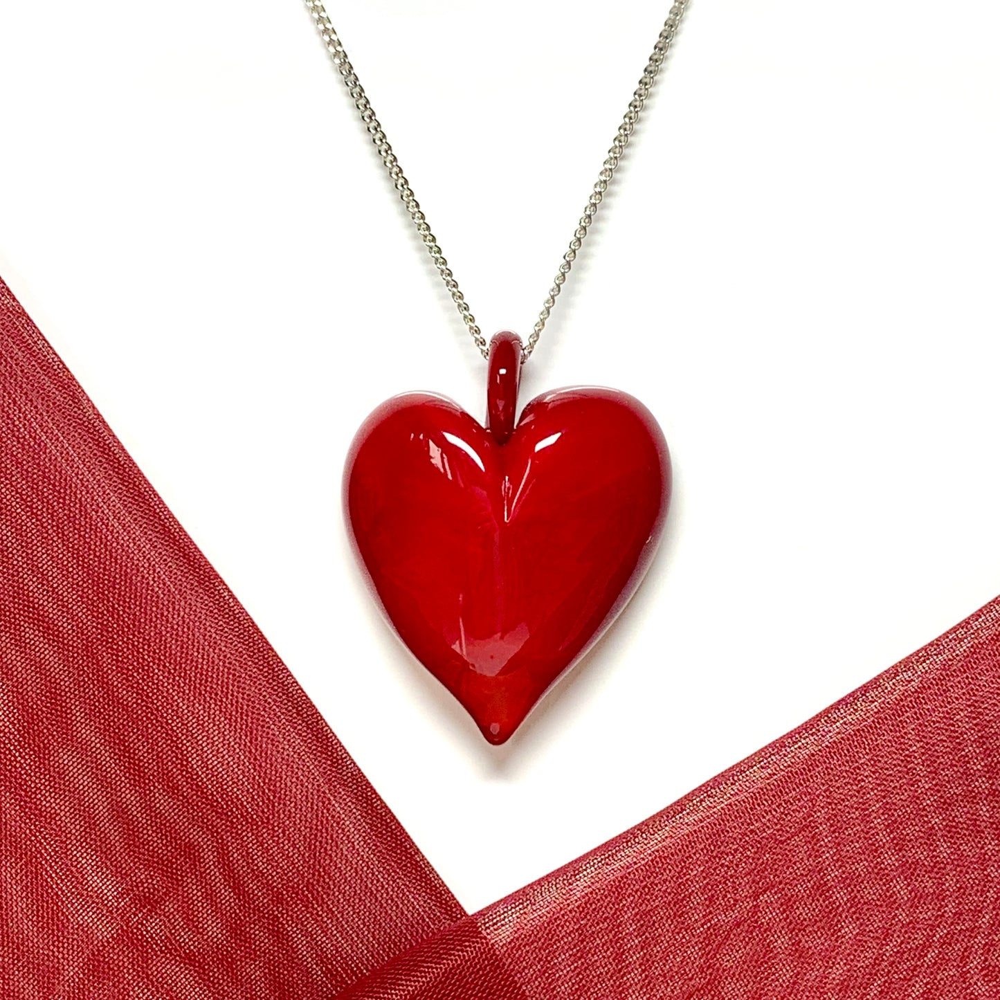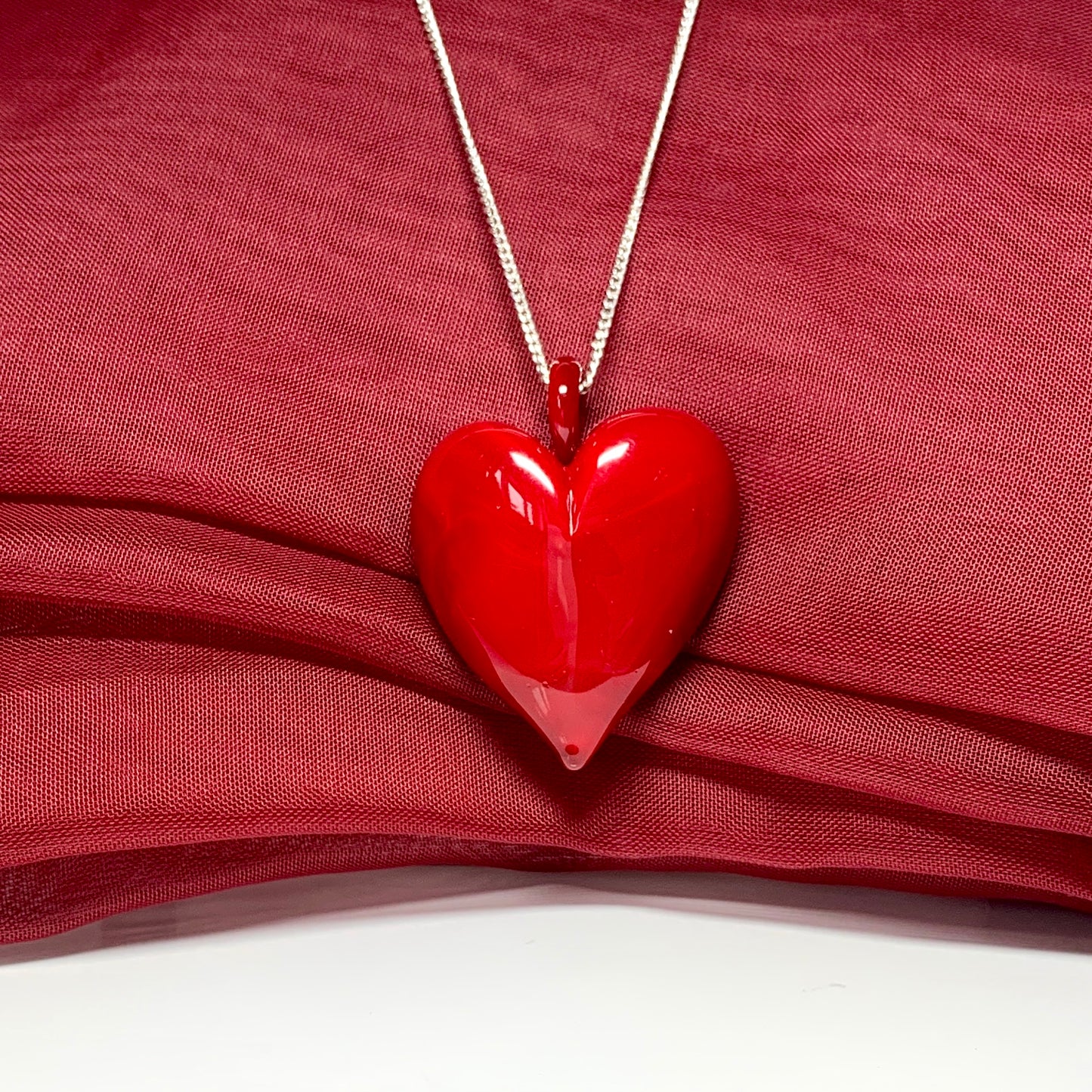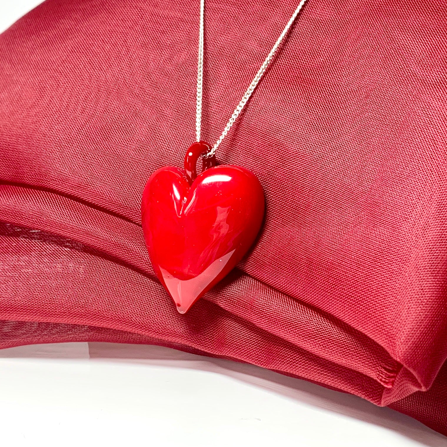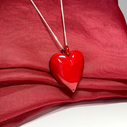A beautiful handmade heart shaped bright red real Murano glass necklace, that has been created using Genuine Murano glass, on a solid sterling silver chain