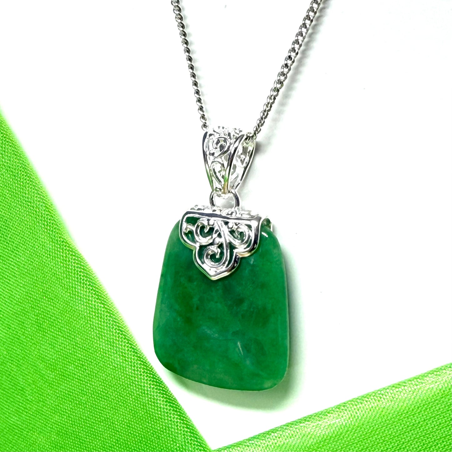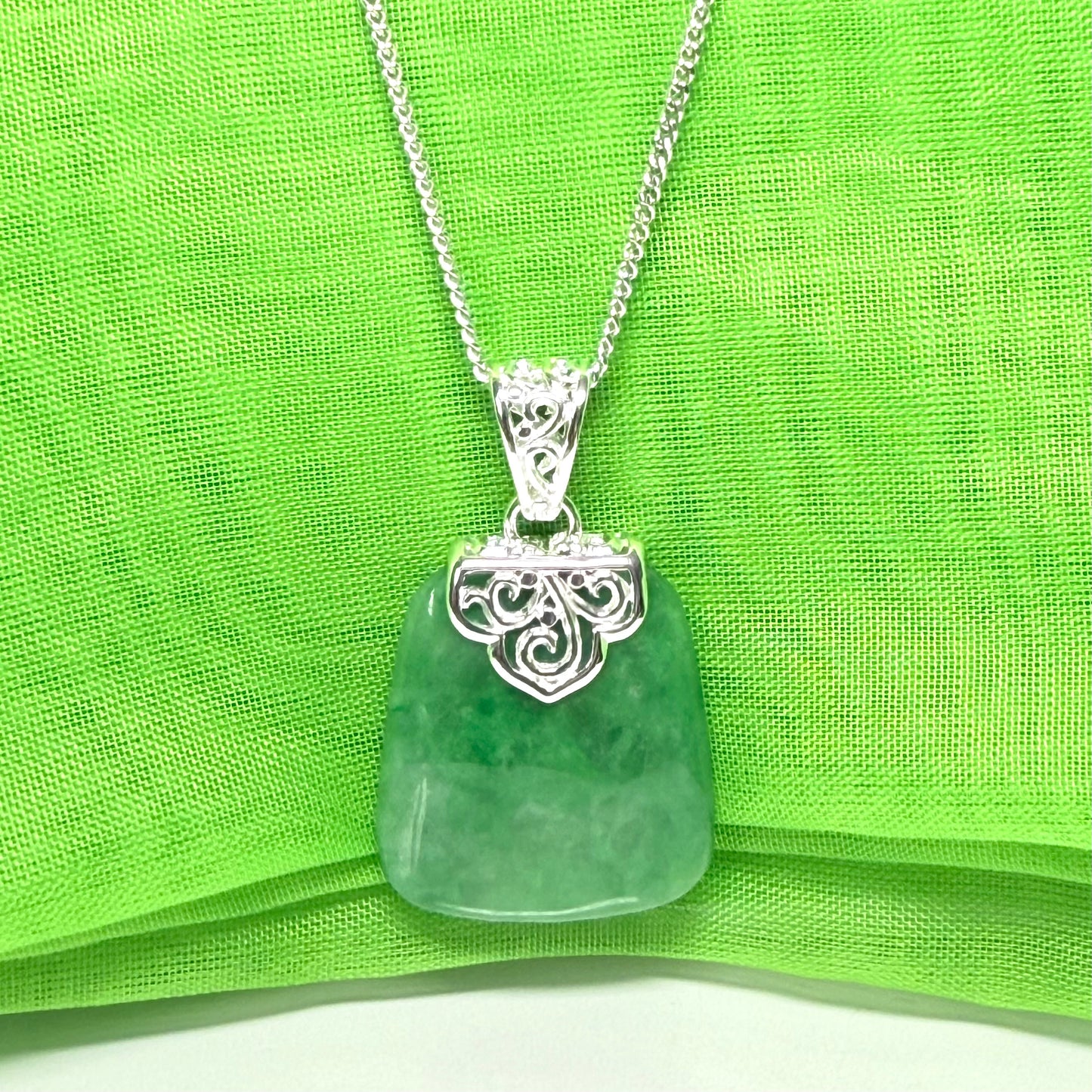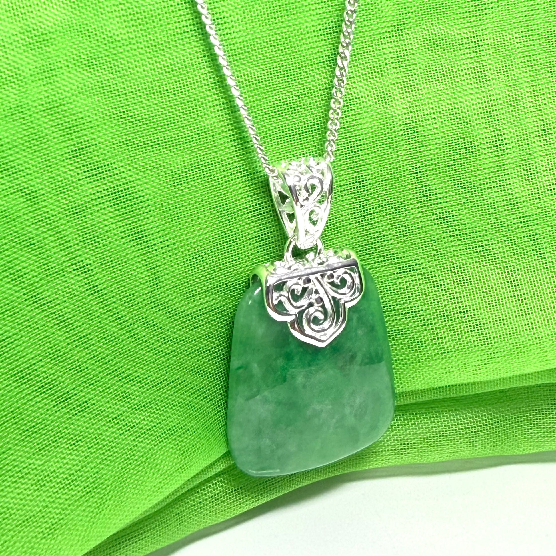 A timeless, elegance with this beautifully handcrafted real green jade pendant necklace, featuring a richly coloured, cushion-cut green real jade stone set in a fancy sterling silver patterned frame. A striking combination of traditional craftsmanship and natural beauty, this pendant captures your attention with its deep green hue and shimmering sterling silver setting