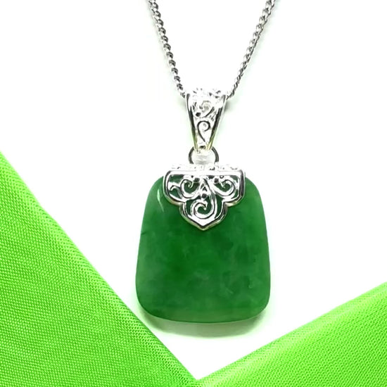 A beautiful cushion shaped real green jade necklace in sterling silver, with a single cushion shaped real dark green jade stone in a fancy patterned setting