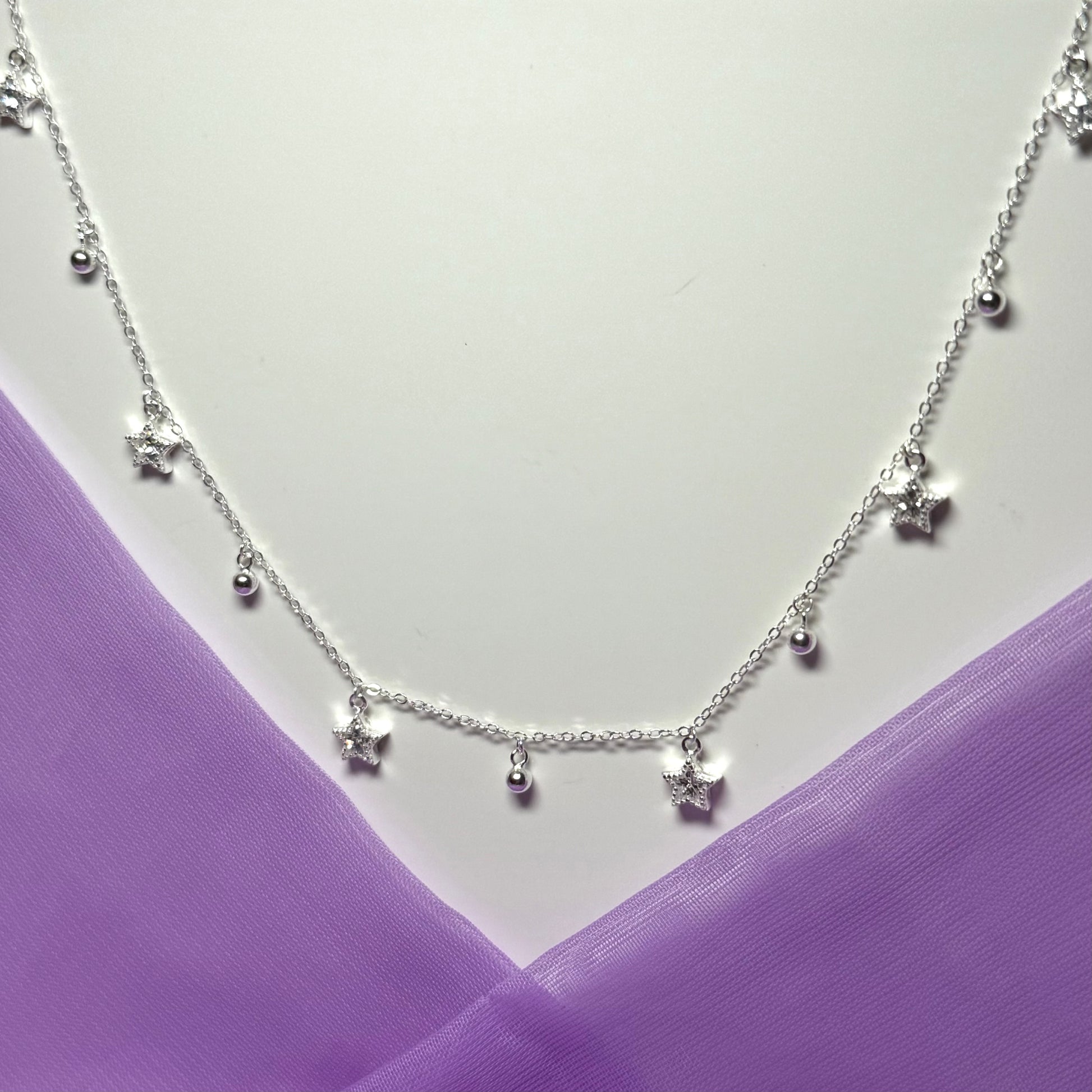With a star and ball shaped link design, made in shimmering sterling silver, it will look beautiful on the neck, catching the light as it twist and turns