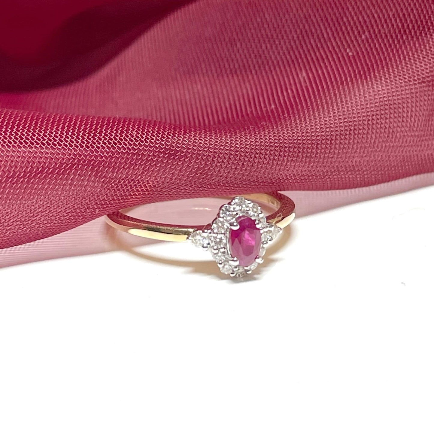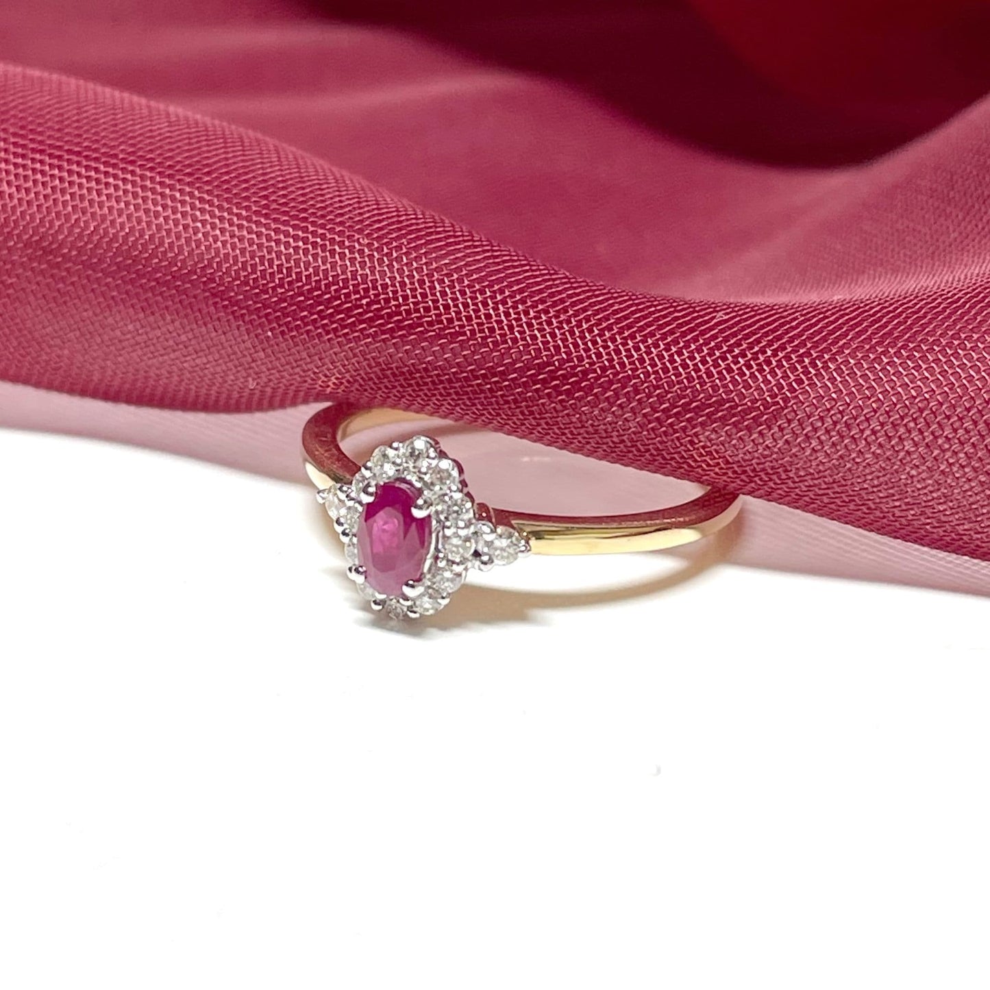 One 34 point oval cut red ruby stone surrounded by 14 round cut diamonds weighing 15 points in total, in a claw setting, and can be given as the perfect gift for a birthday, a ruby anniversary present or simply a treat for yourself, coming complete with a lovely presentation box and with free delivery