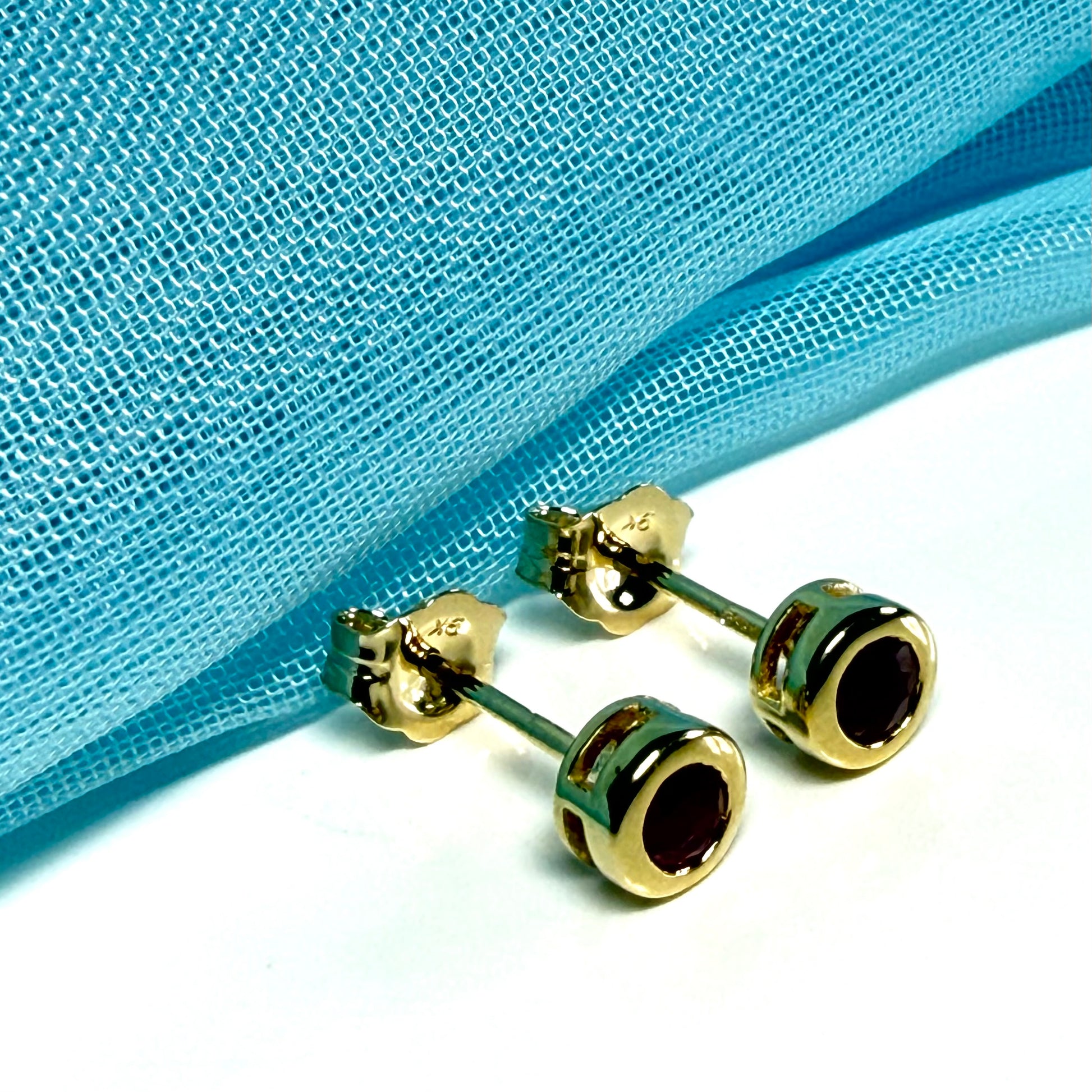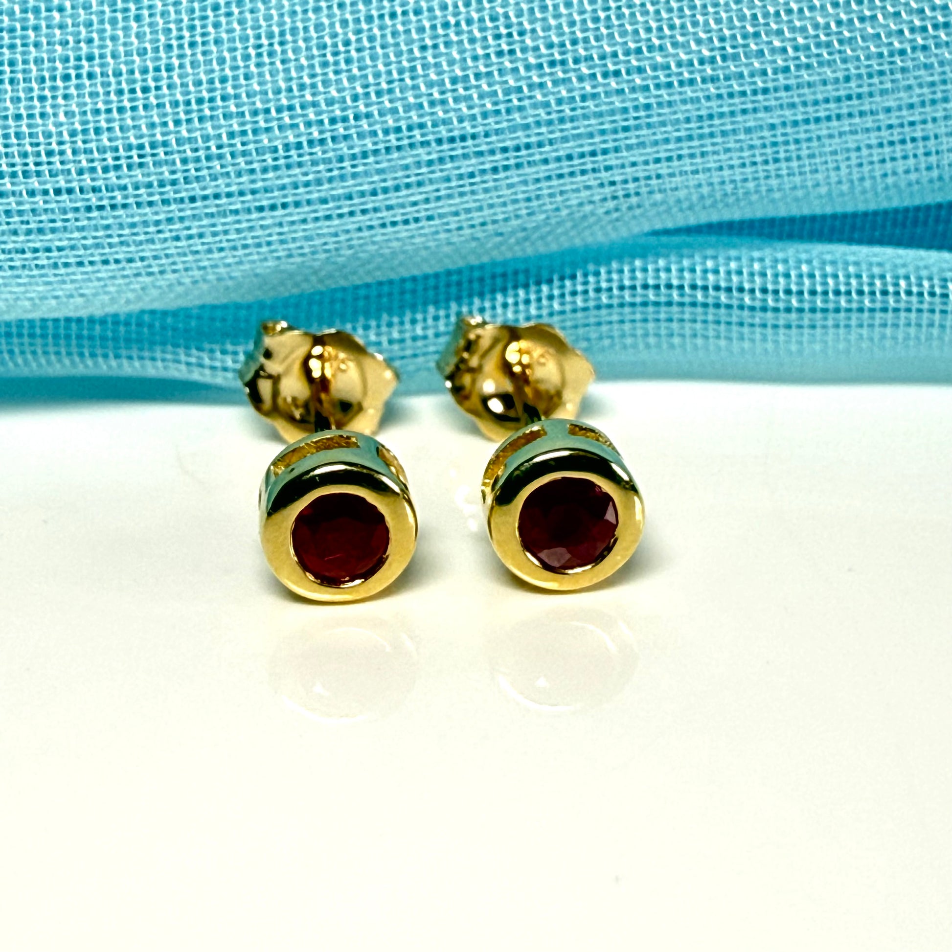 Pair of real red ruby earrings round yellow gold stud smooth rubbed over setting
