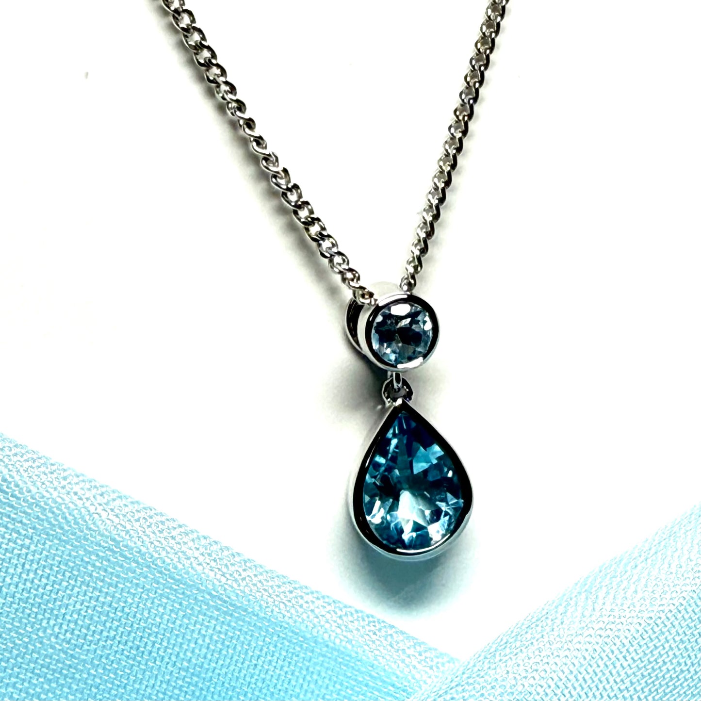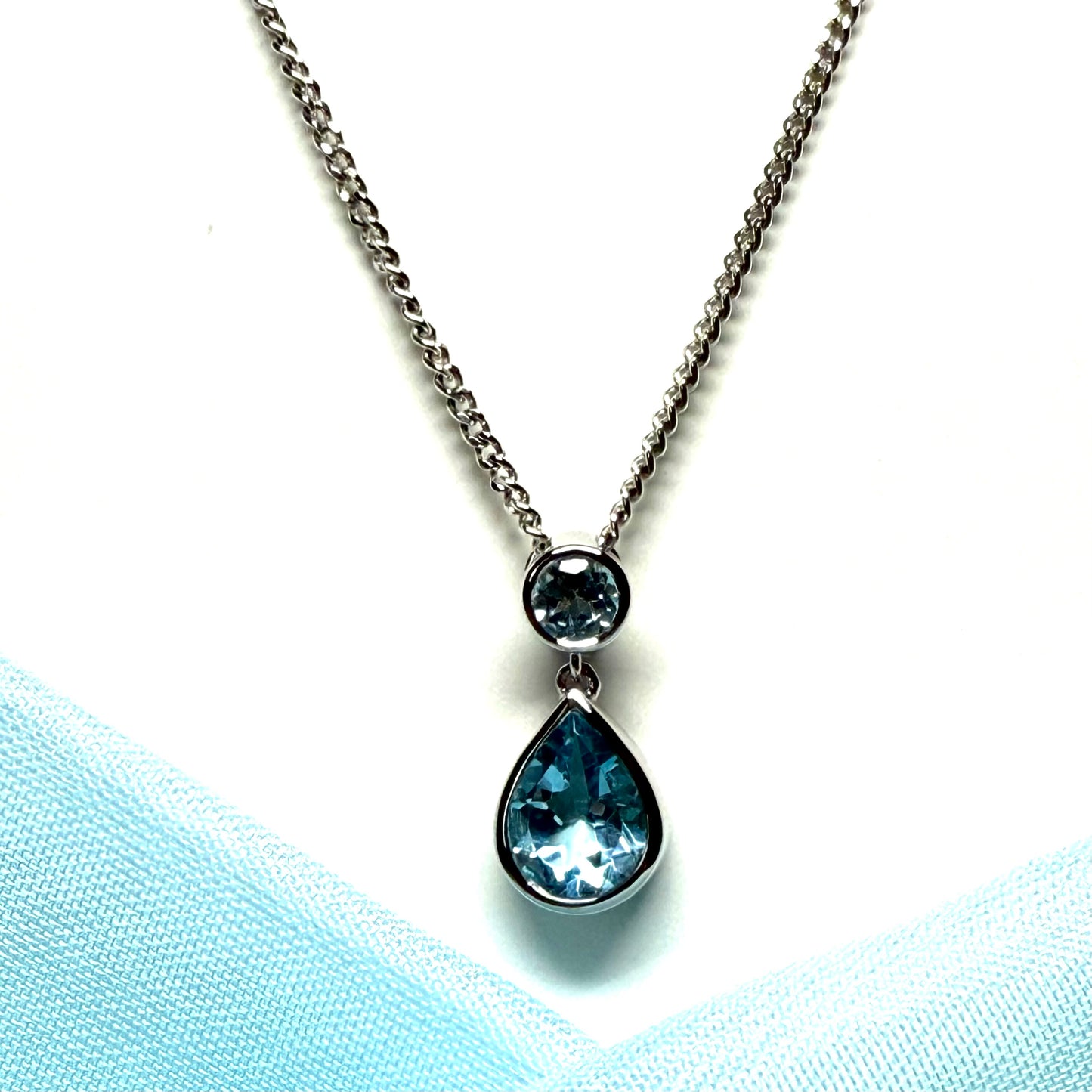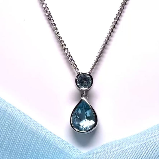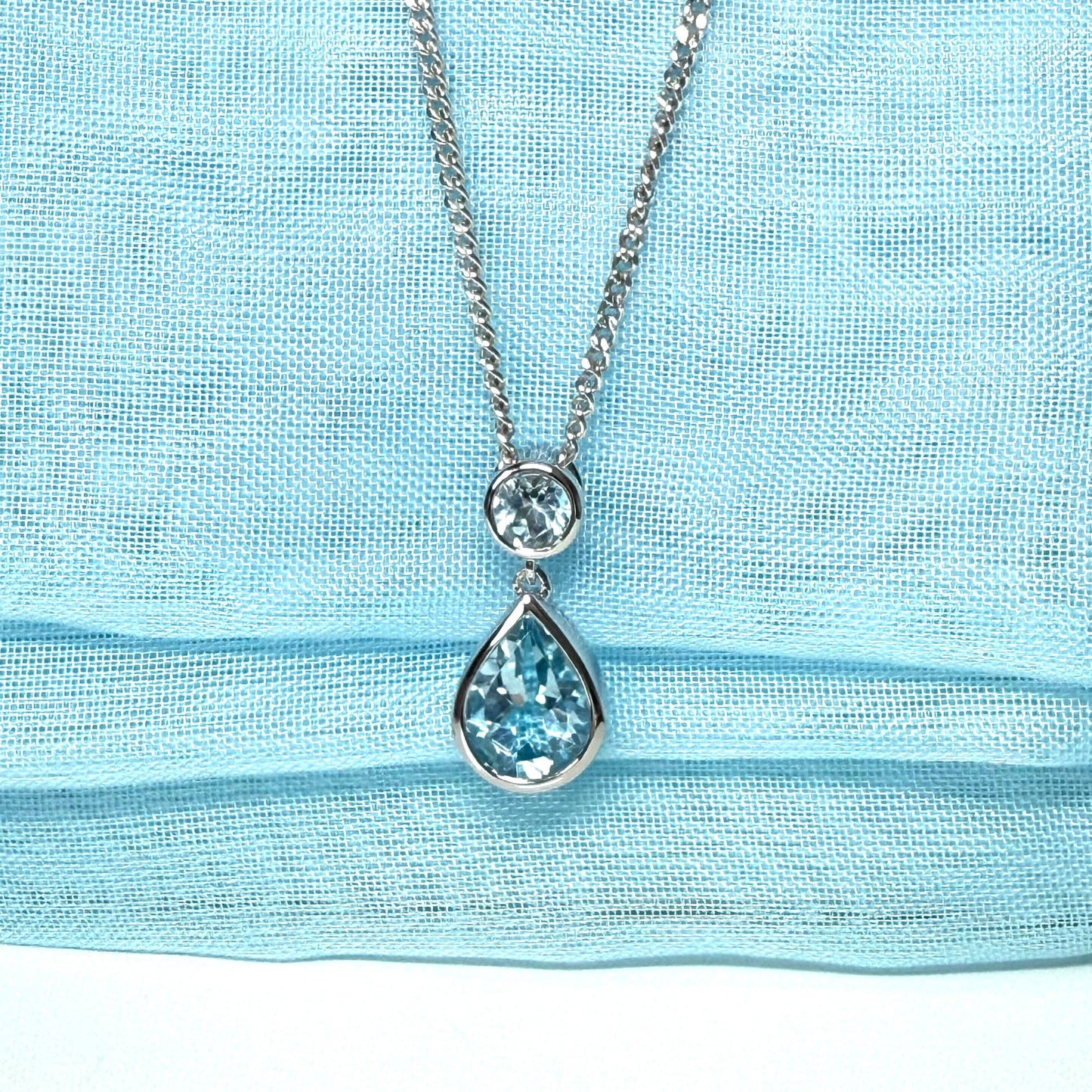 An absolutely stunning and beautiful pear and round shaped real blue topaz necklace, having a single pear cut real blue topaz and a single round shaped real blue topaz stone set above it, inside a smooth rubbed over design setting