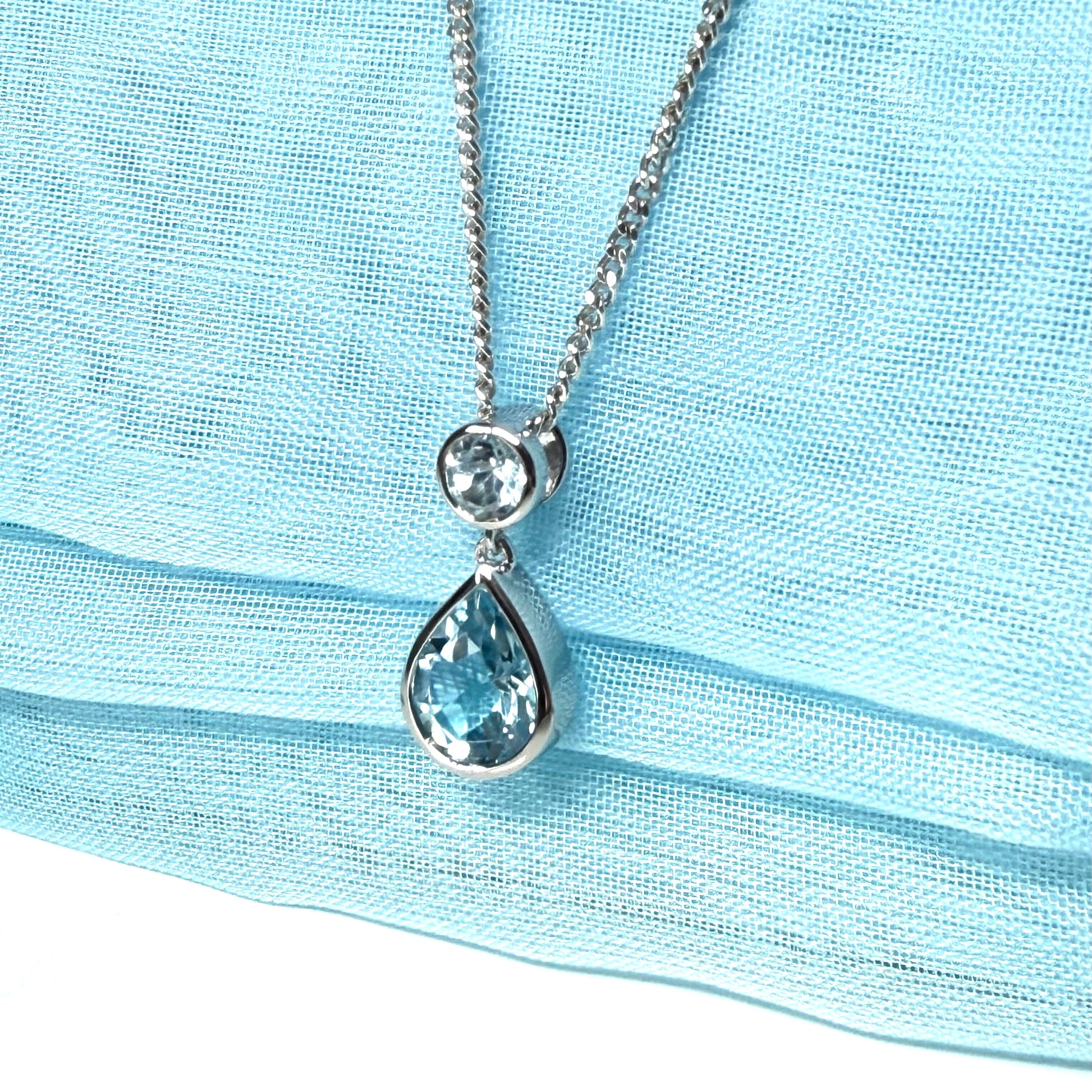 Real blue topaz silver double pendant necklace, fancy design with a pear cut and a round cut stone in a smooth rubbed over setting