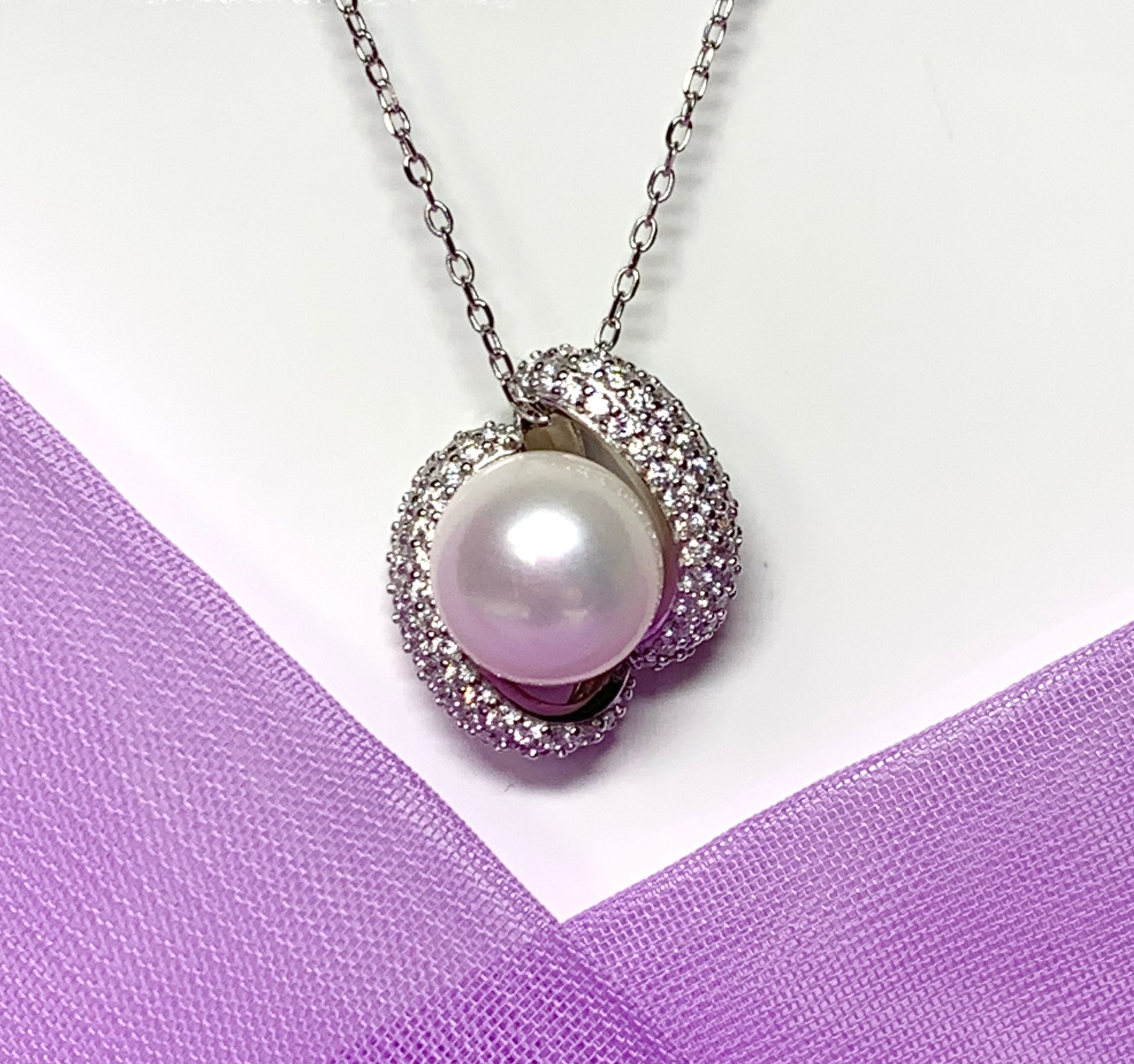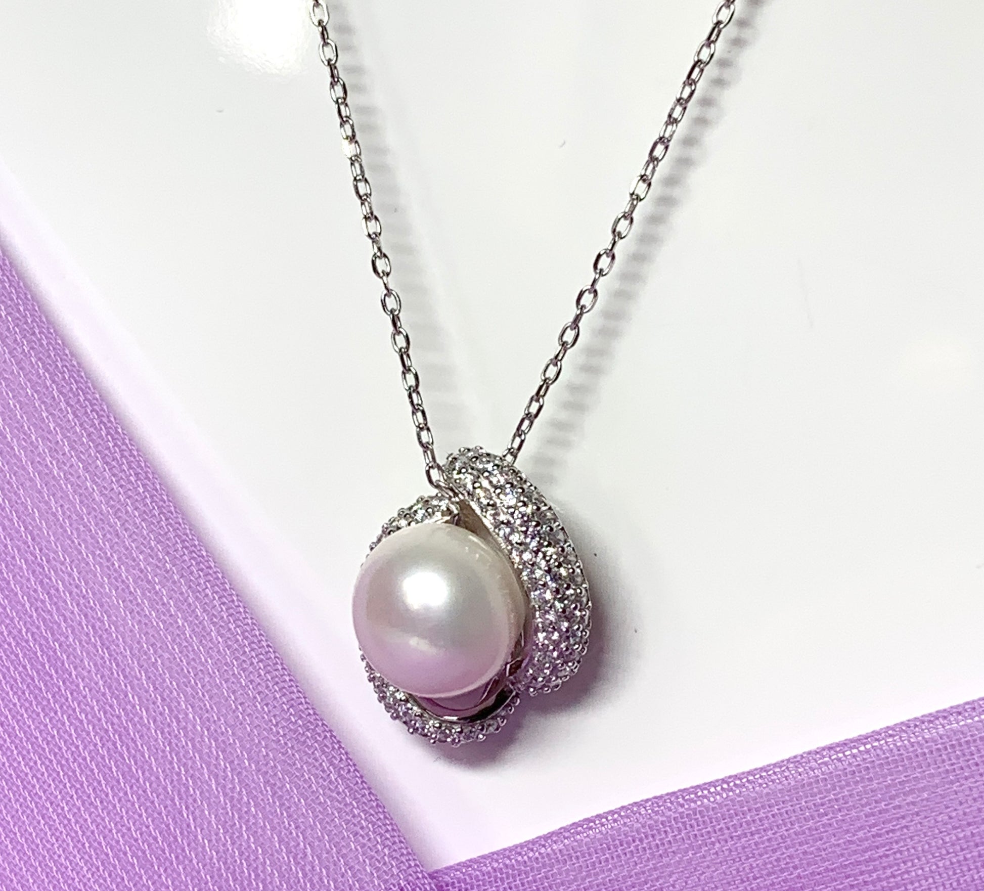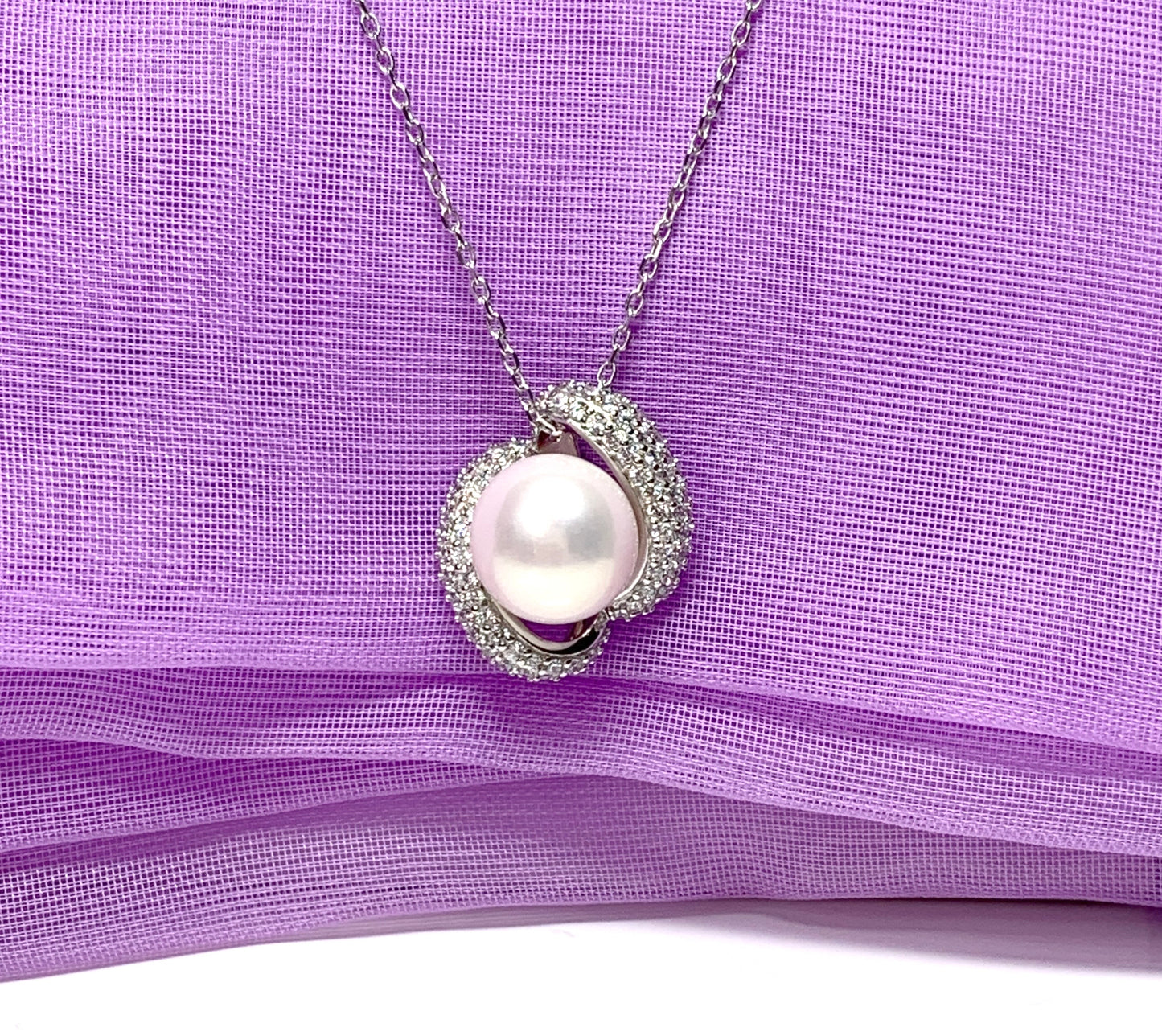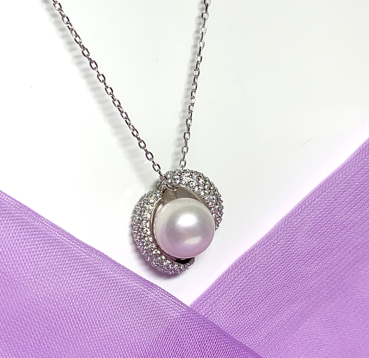 A gorgeous round shaped sterling silver real freshwater cultured large pearl necklace with round cut cubic zirconia stones either side of it in a double swirl designed pendant