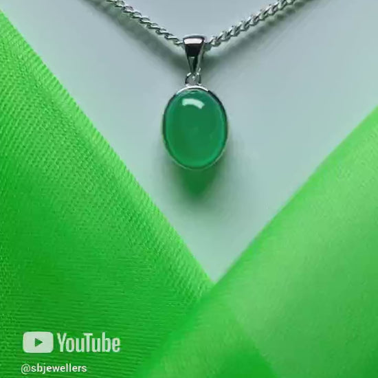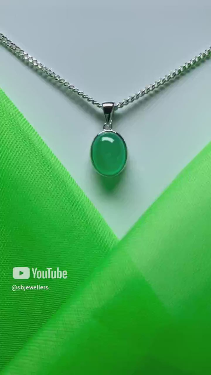 A beautiful white gold oval green jade necklace, having a single oval shaped jade stone within a 9 carat white gold smooth rubbed over setting, a stunning necklace to add to anyone's jewellery collection, including a solid white gold chain