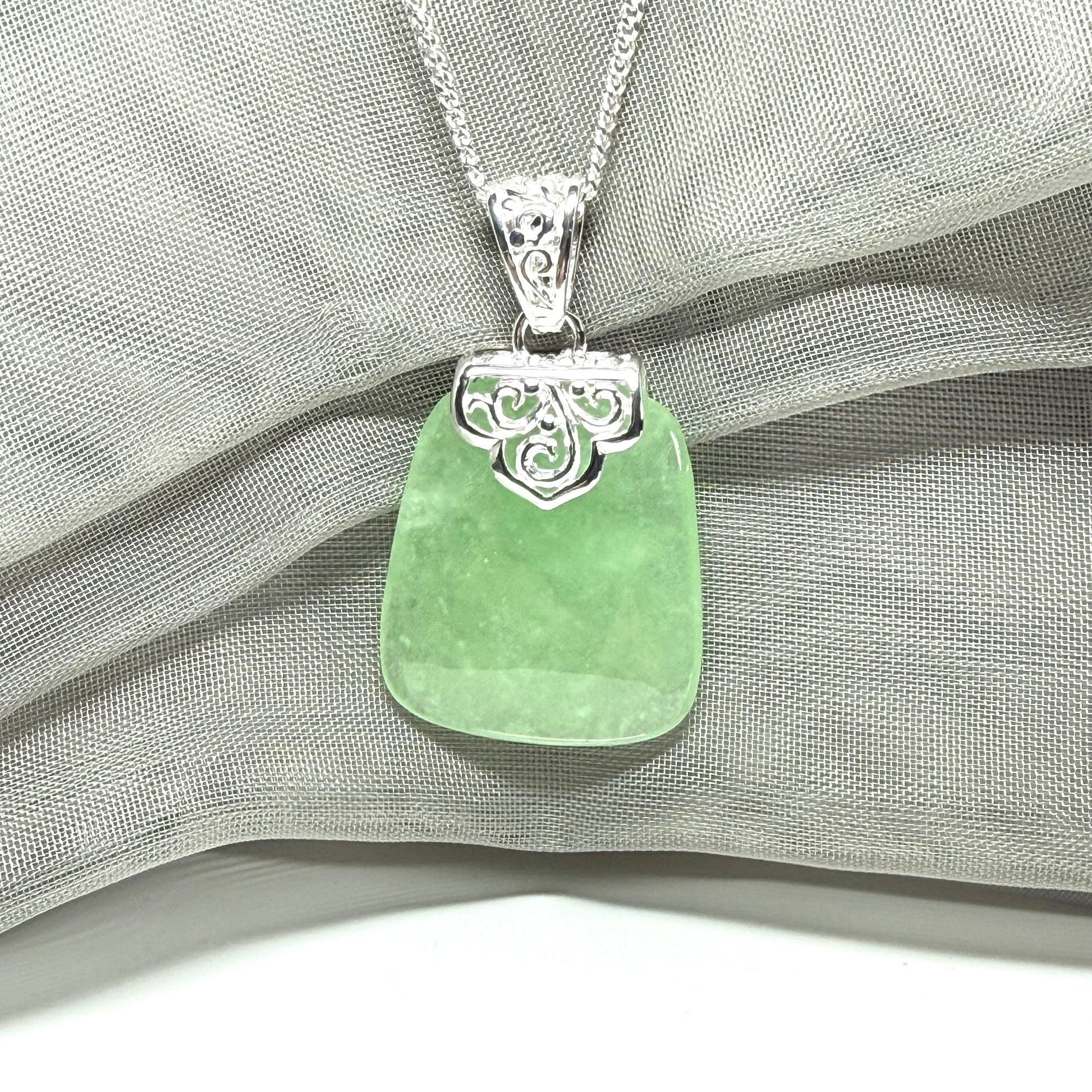 The pendant measures 38mm in height and 23mm in width, making it a substantial and eye-catching centrepiece that is ideal for those who appreciate bold, elegant jewellery with meaning and presence. Crafted in solid 925 sterling silver, the detailed setting has a vintage-style pattern that adds texture and depth, perfectly complementing the natural lustre of the jade