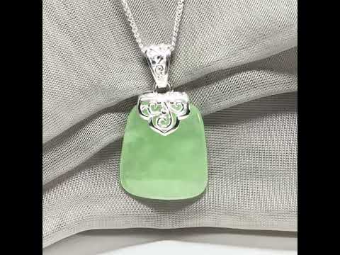 This stunning necklace features a real dark green jade stone, cushion-shaped and set in a fancy patterned sterling silver setting