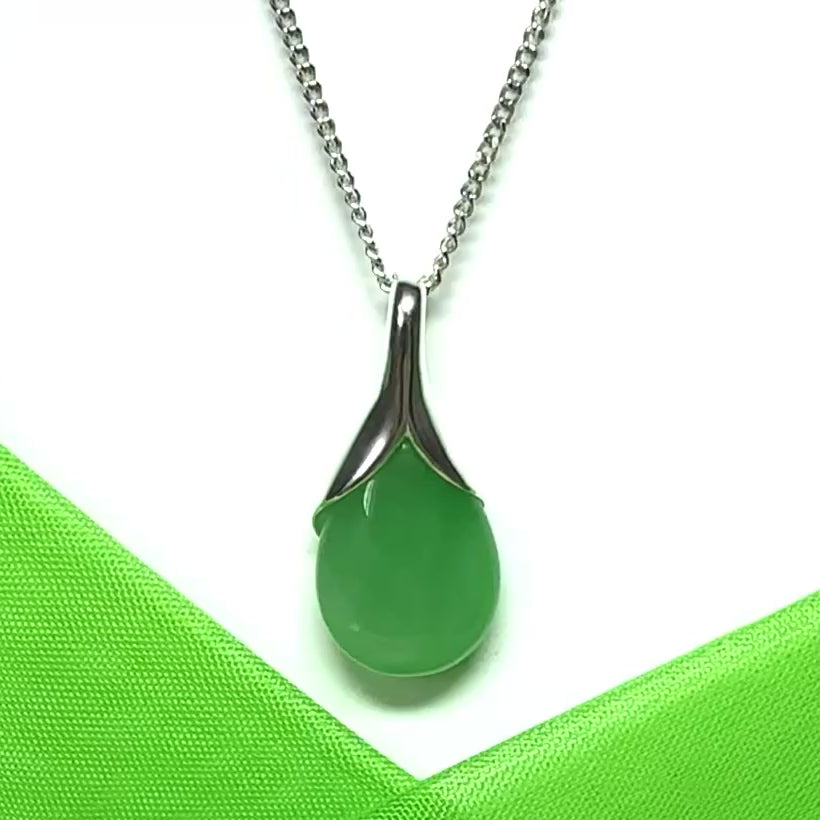 Real green jade tear drop sterling silver pear teardrop shape pendant, including a chain