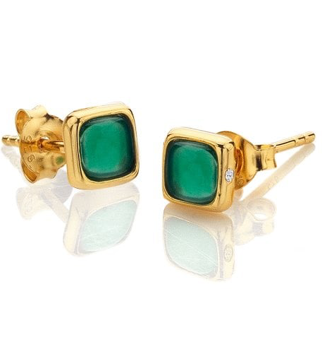 A stunning pair of squared stud earrings with a cushion shaped real green agate stone inside them, that are inside a smooth rubbed over edged setting, yellow gold plated sterling silver stud earrings, from the Hot Diamonds range of jewellery