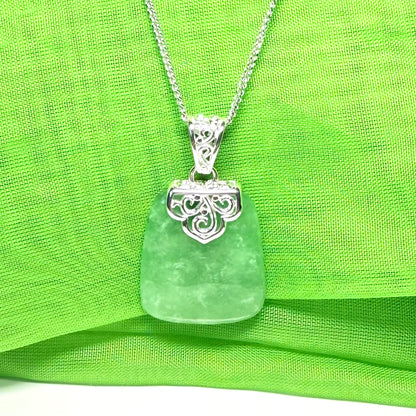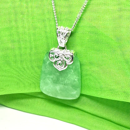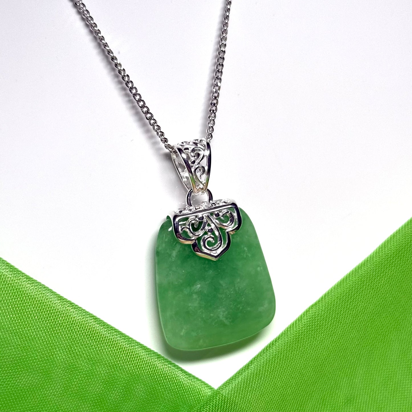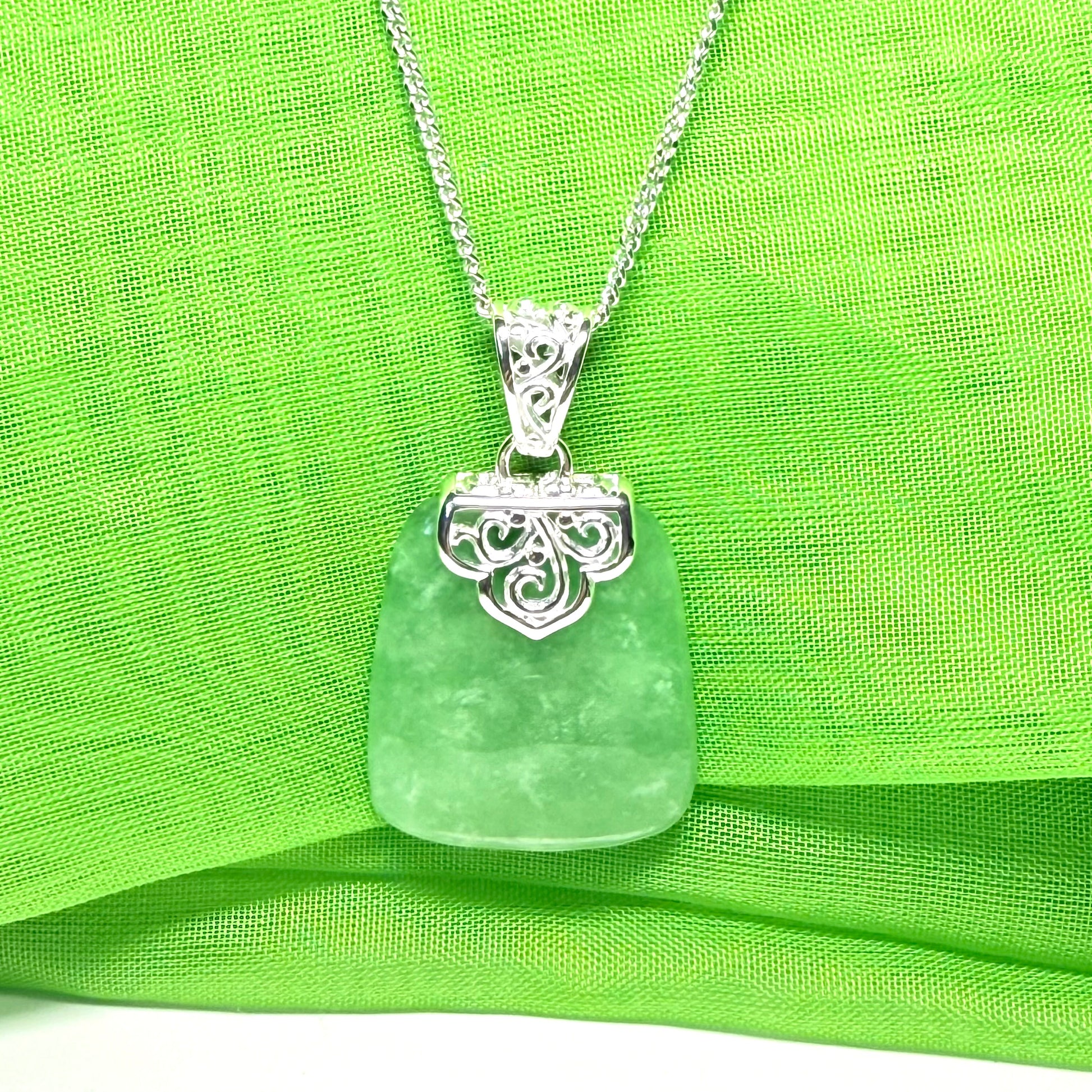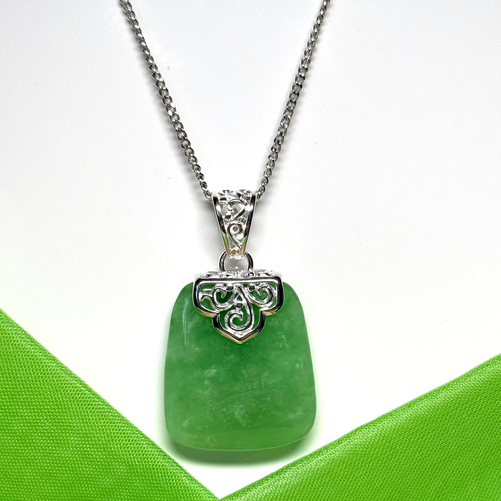 A beautiful cushion shaped real green jade necklace in sterling silver, with a single cushion shaped real green jade stone in a fancy patterned setting