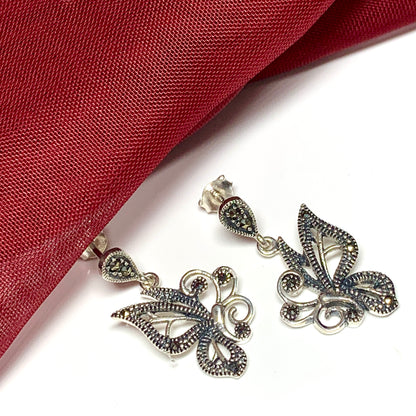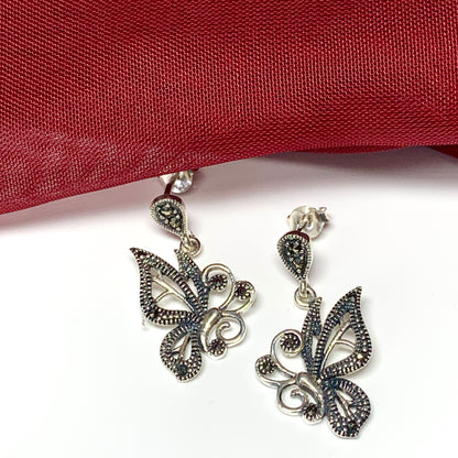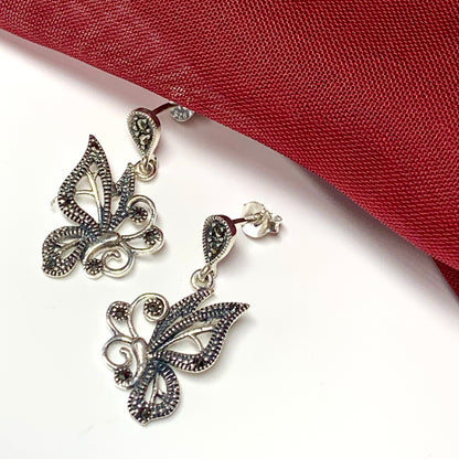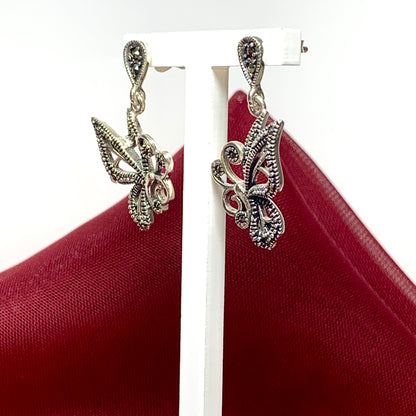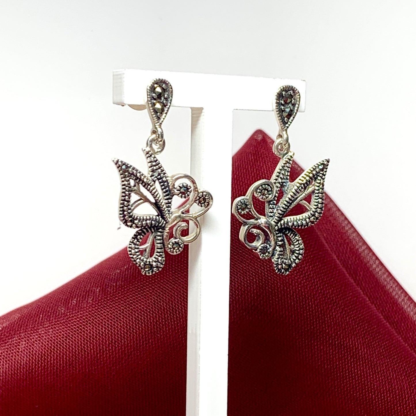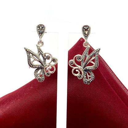 A beautiful pair of butterfly shaped marcasite drop earrings, having a pierced butterfly shaped design setting made in solid sterling silver