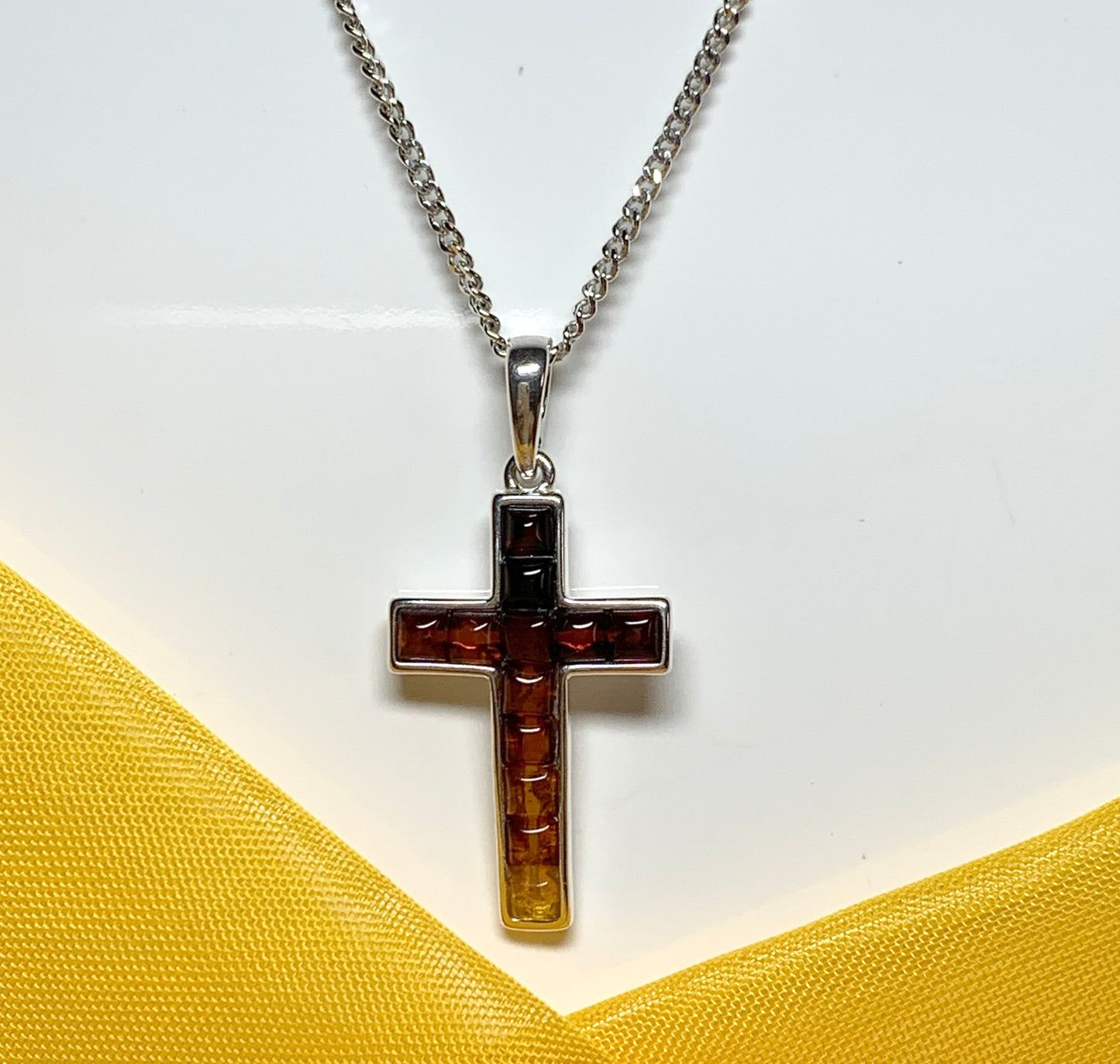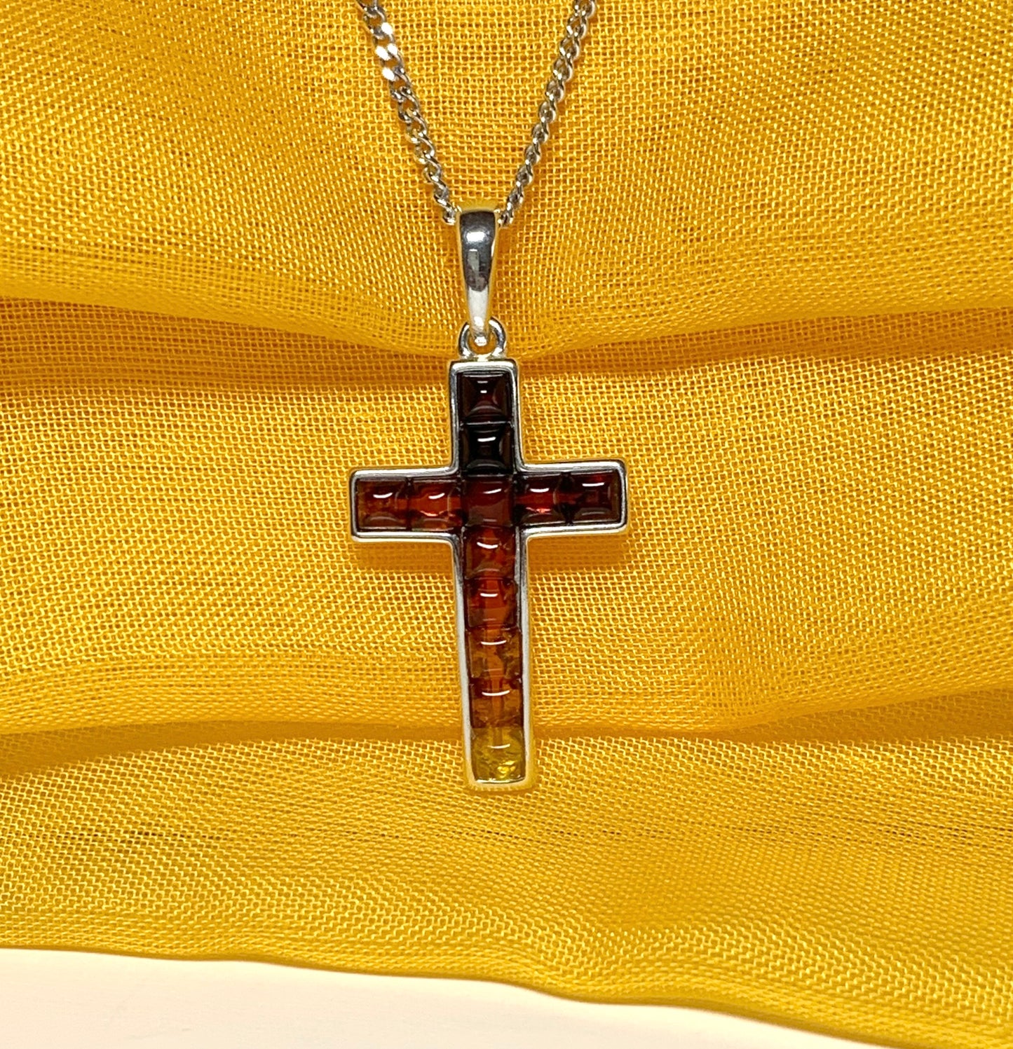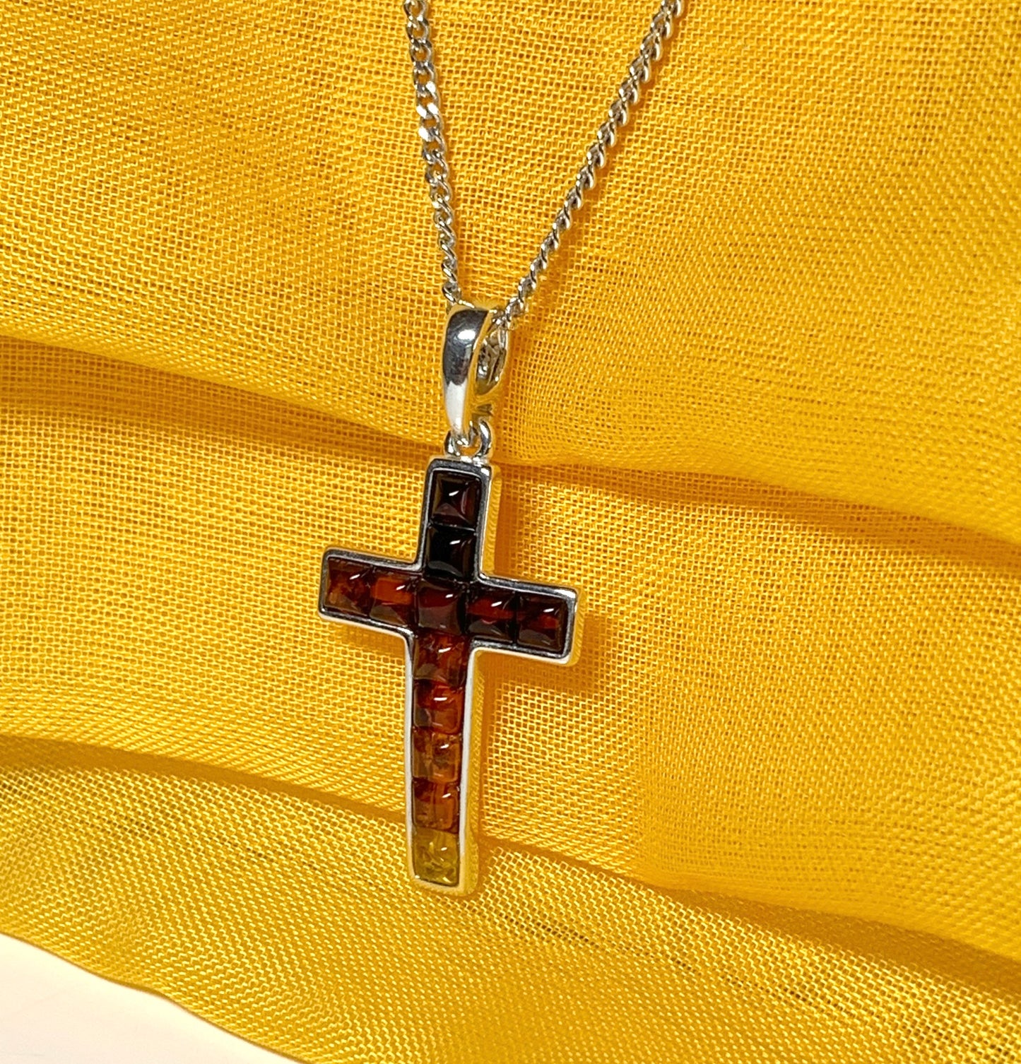 A stunningly beautiful real amber cross shaped design sterling silver necklace, with a simple cross design having smooth edges to the setting, coming on a solid sterling silver curb chain