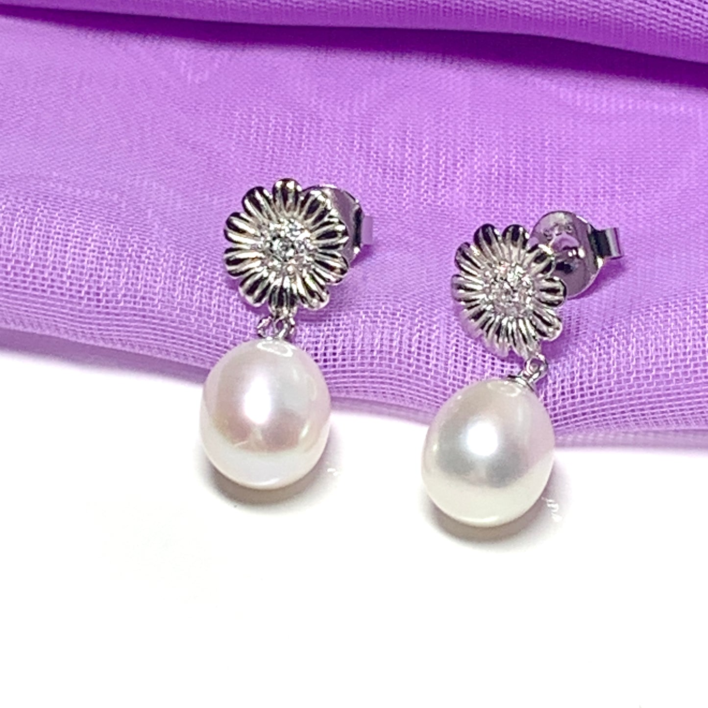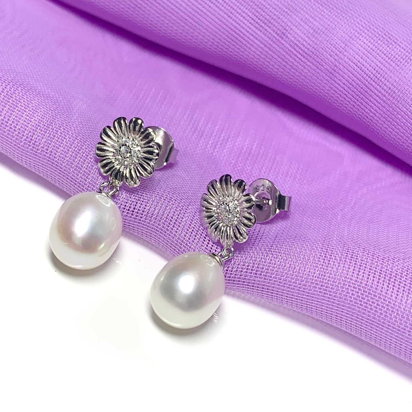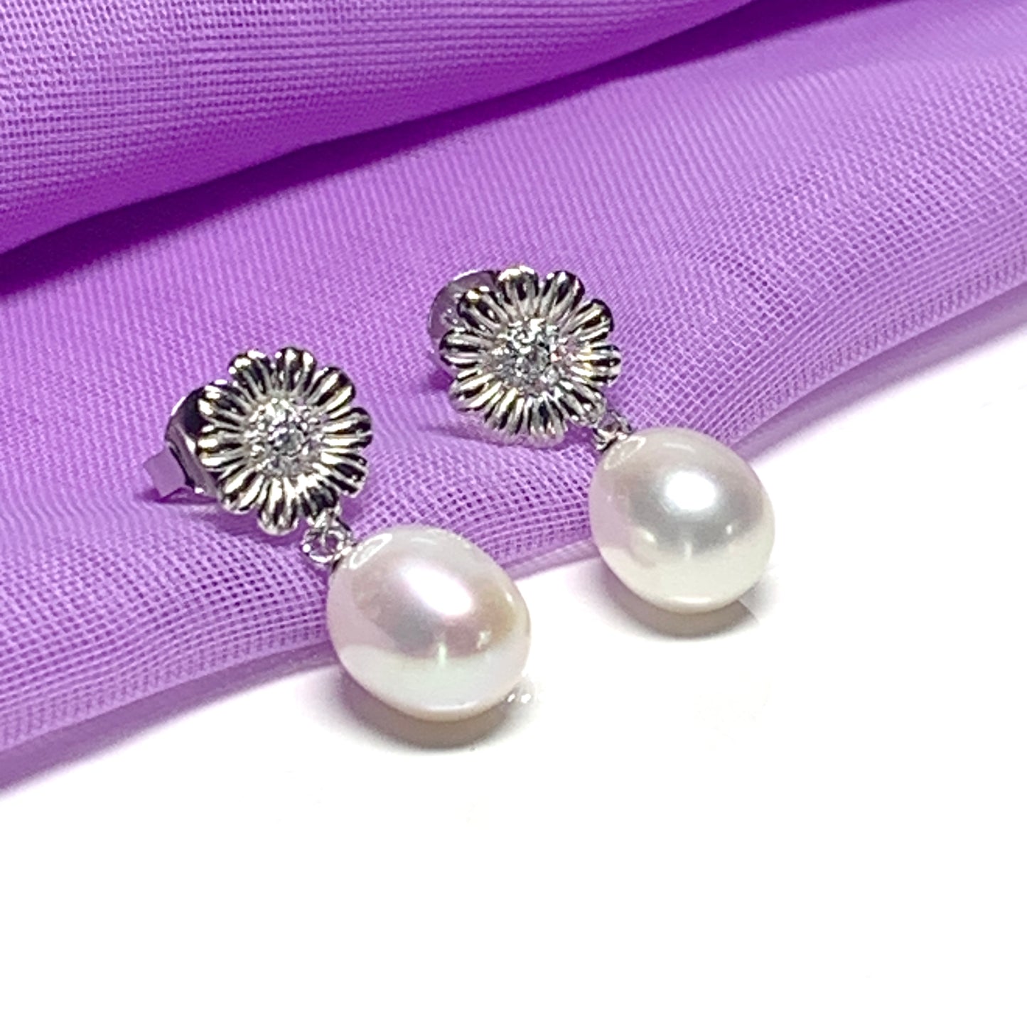 Made in shimmering solid 925 sterling silver that will shine and sparkle in the light as it reflects from the silver metal, the real freshwater pearl stones and the real sparkling cubic zirconia stones in the ears
