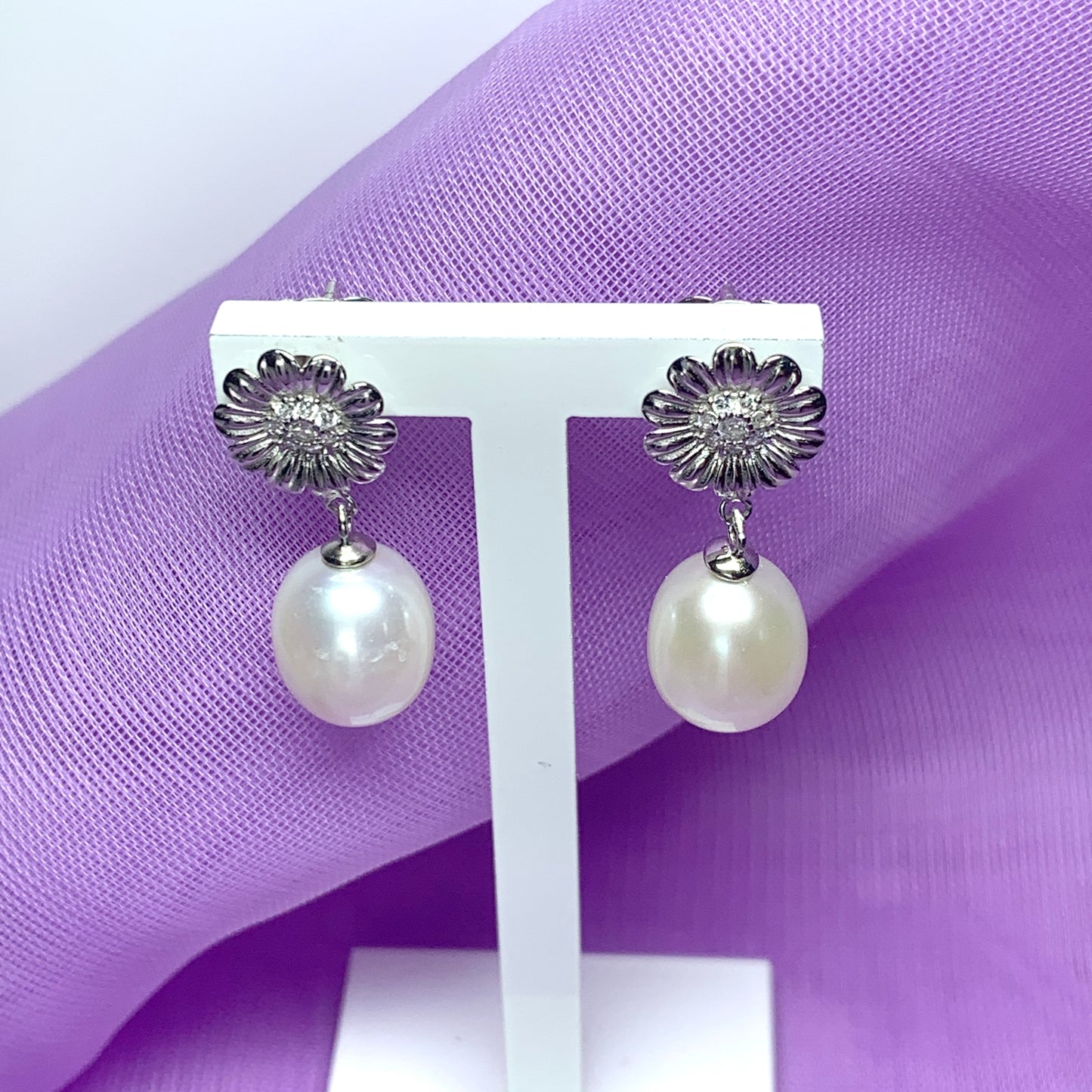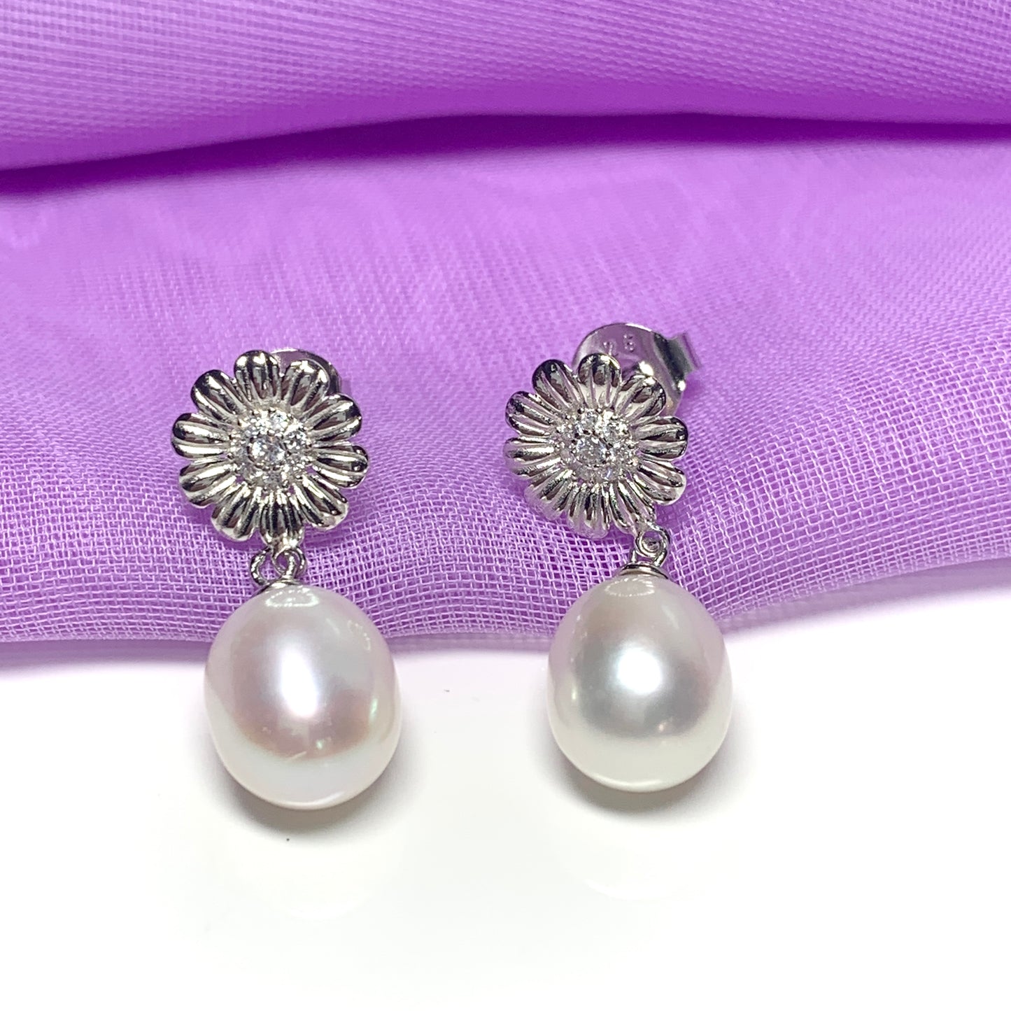 A beautiful pair of pearl drop earrings with a sparkling flower design