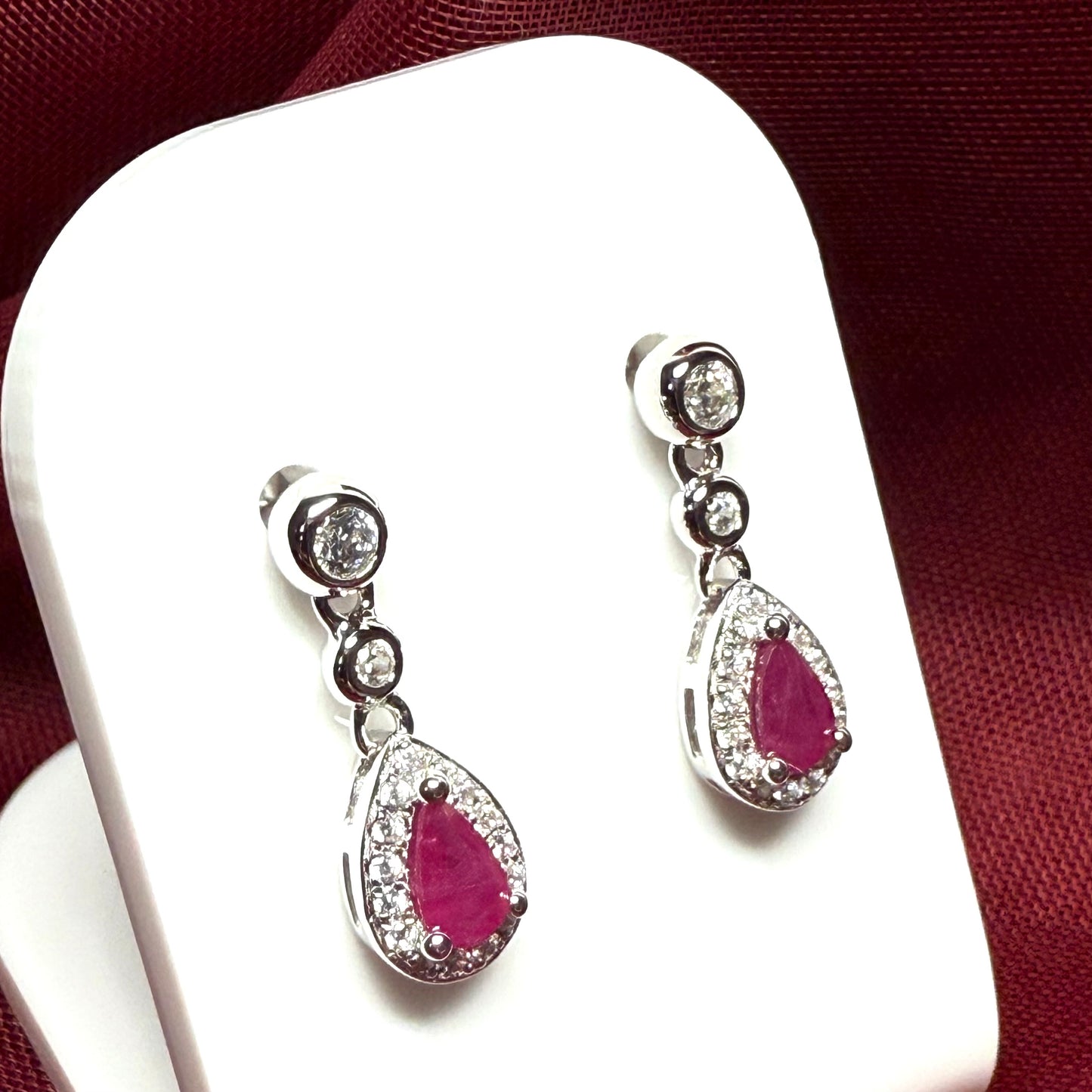 A beautiful pair of timeless sterling silver real red ruby and cubic zirconia teardrop or pear shaped red earrings