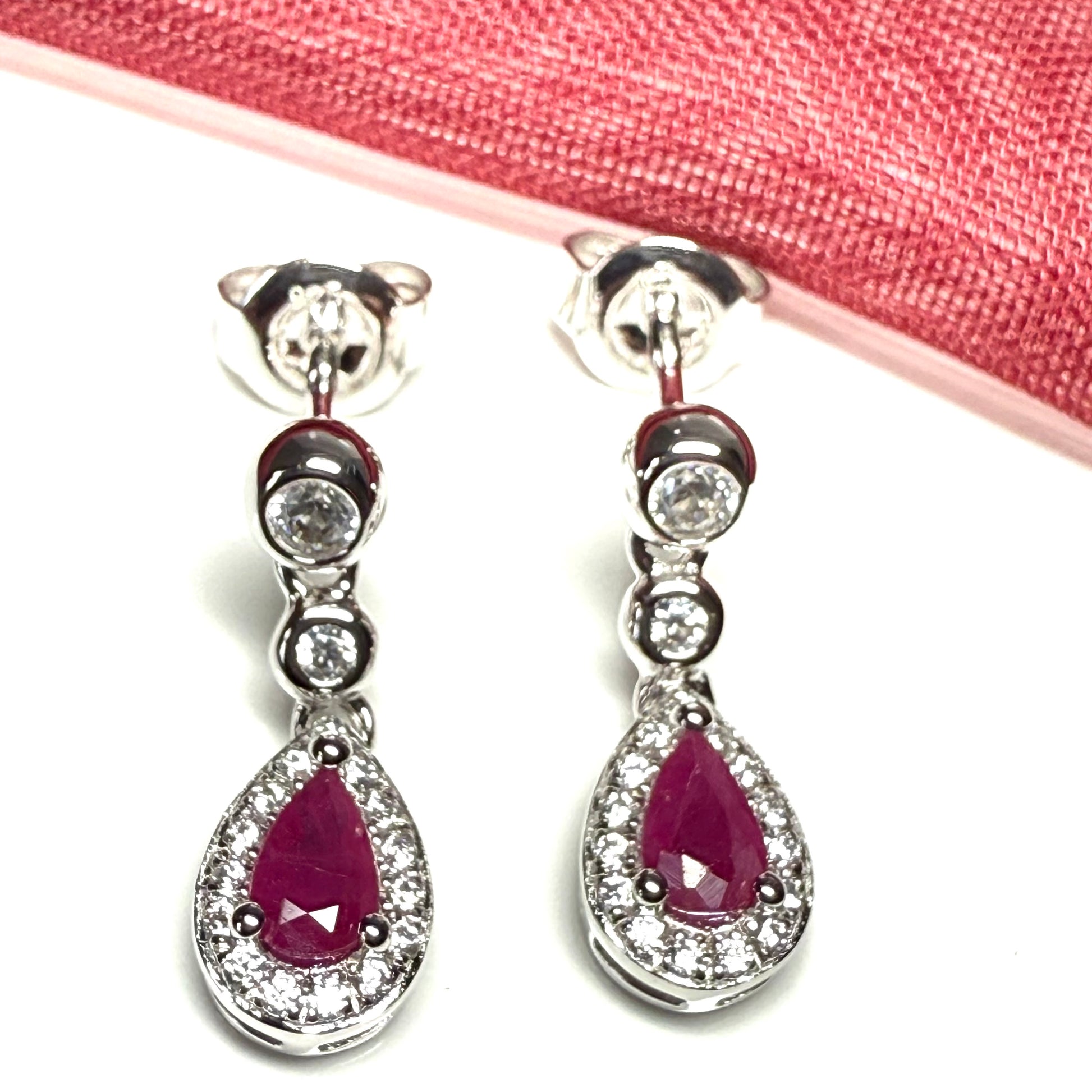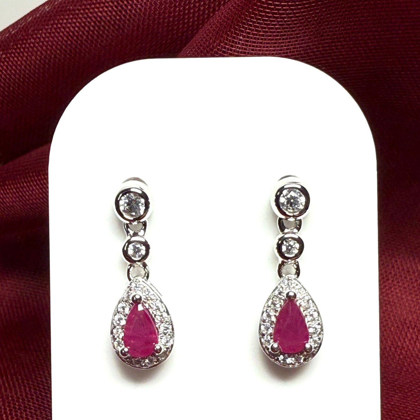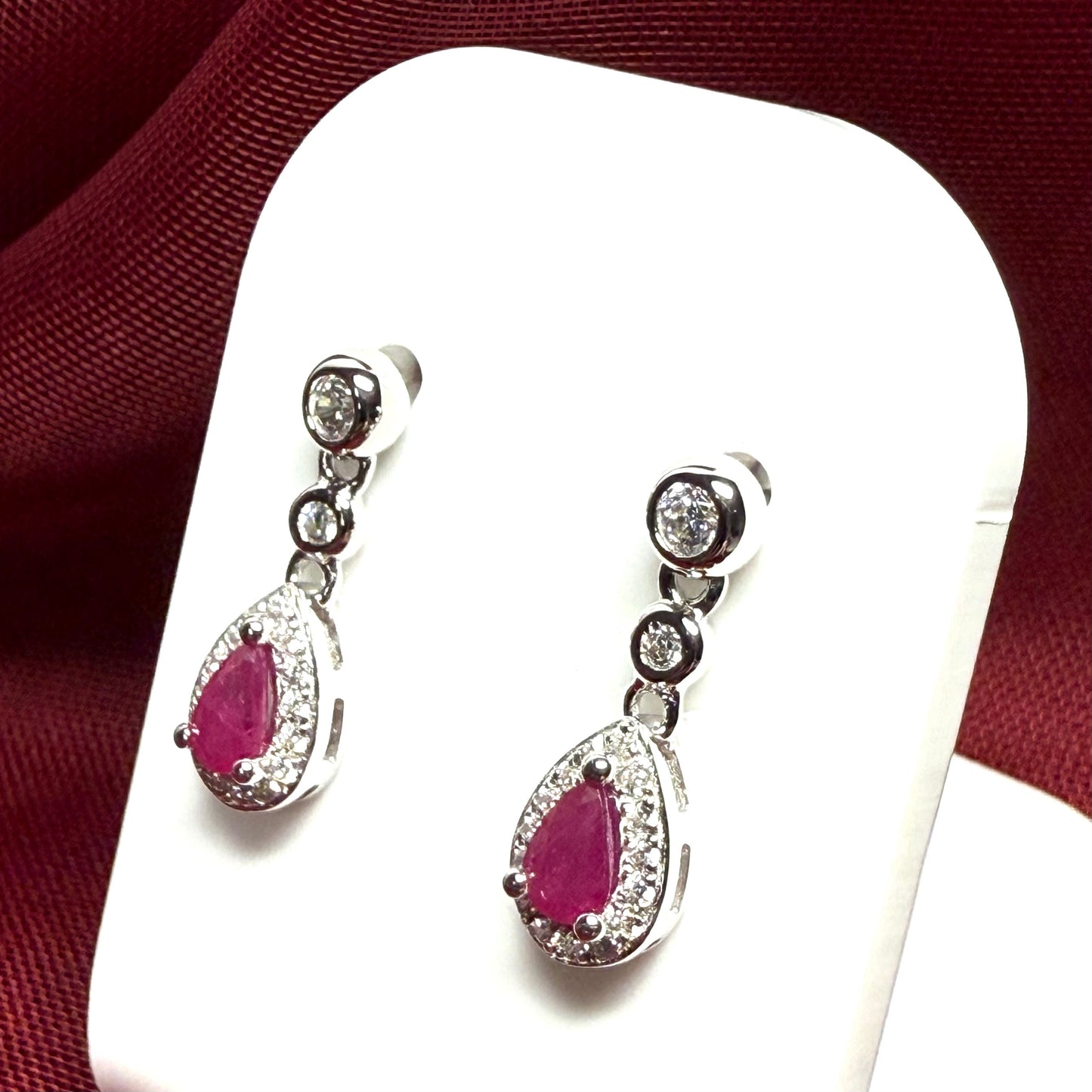 Real red ruby and cubic zirconia sterling silver dropped earrings pear or teardrop shaped