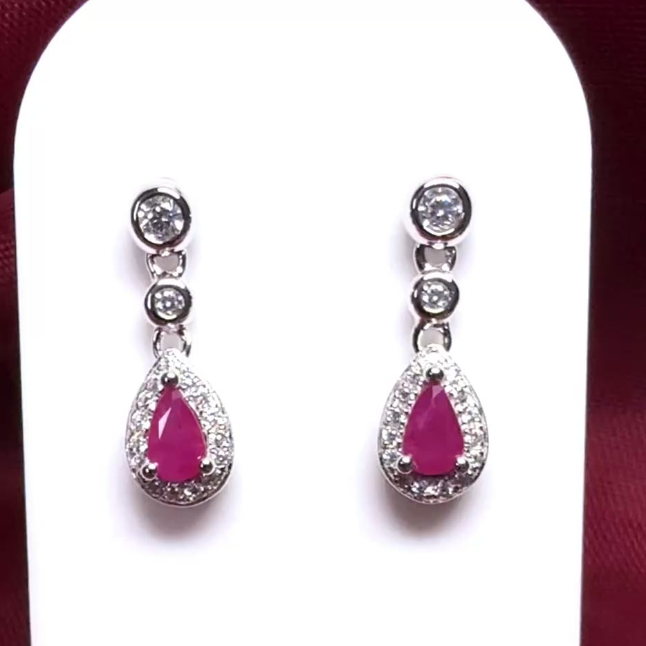 Two pear cut real red ruby stones and seven round cut cubic zirconia stones to complete the look
