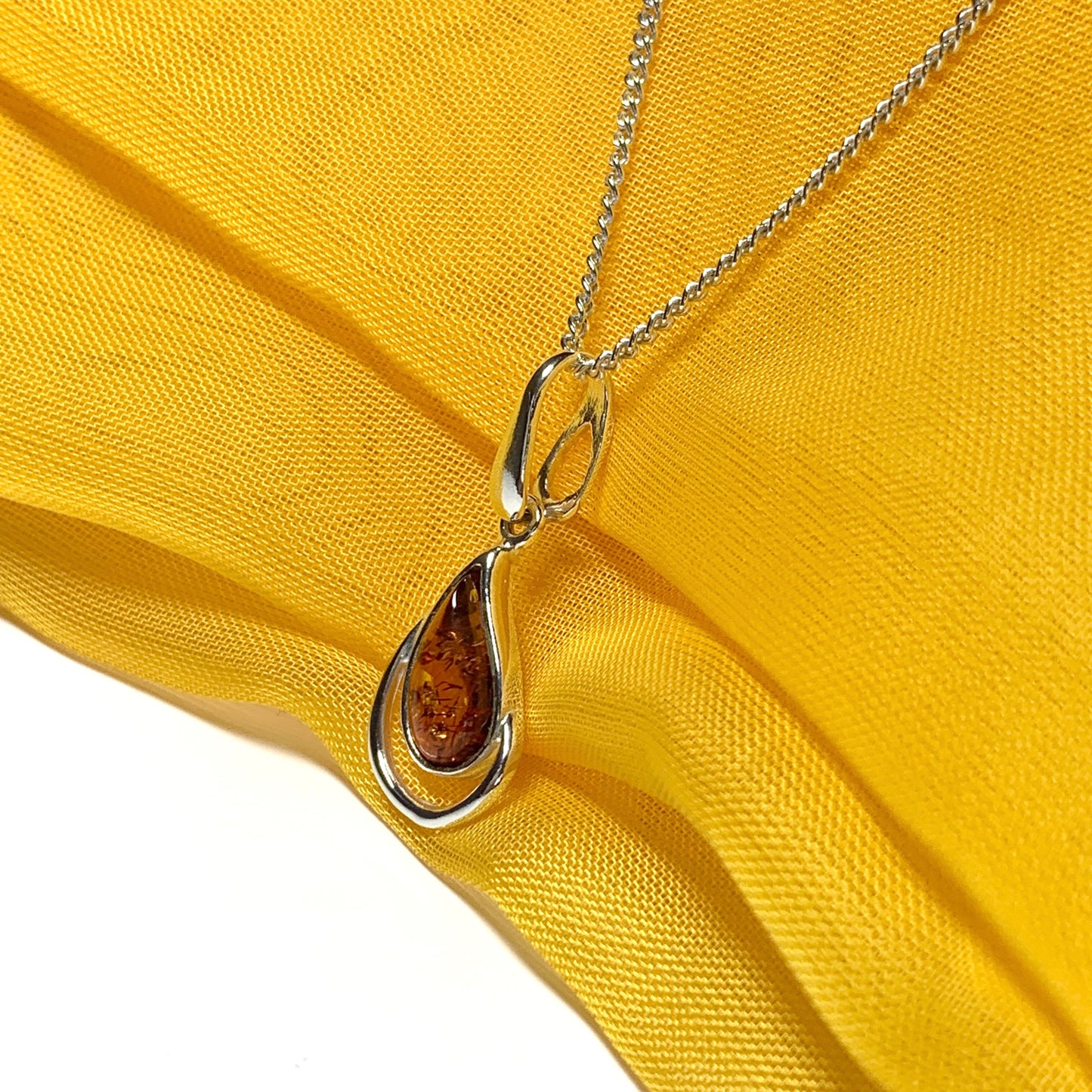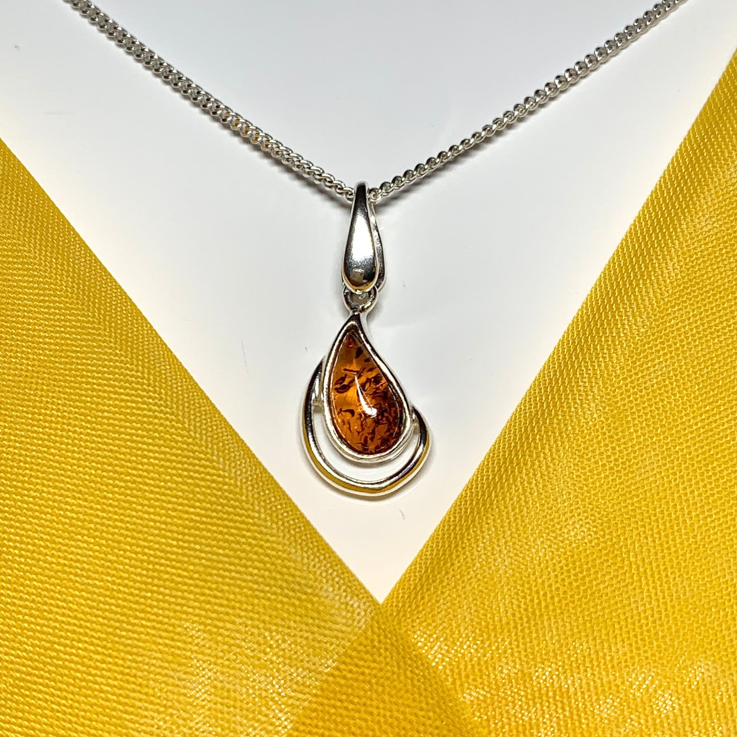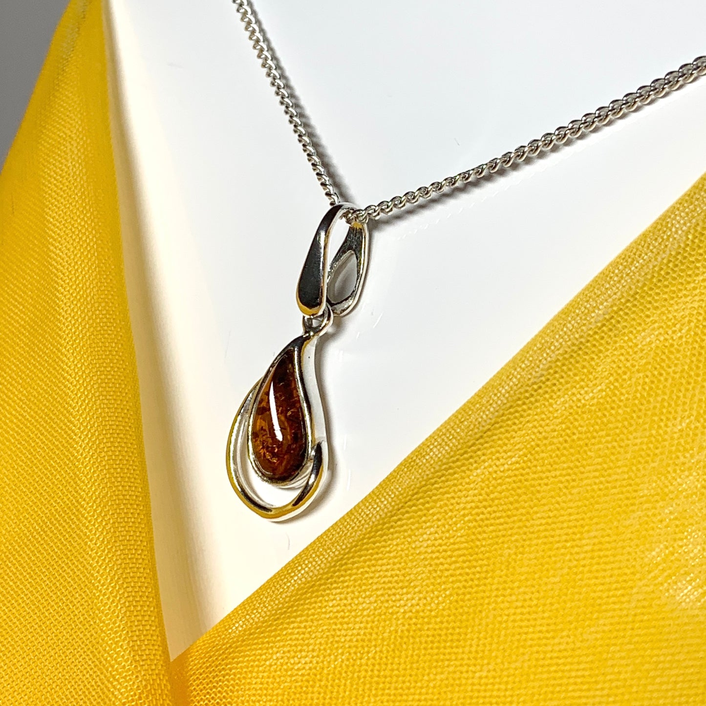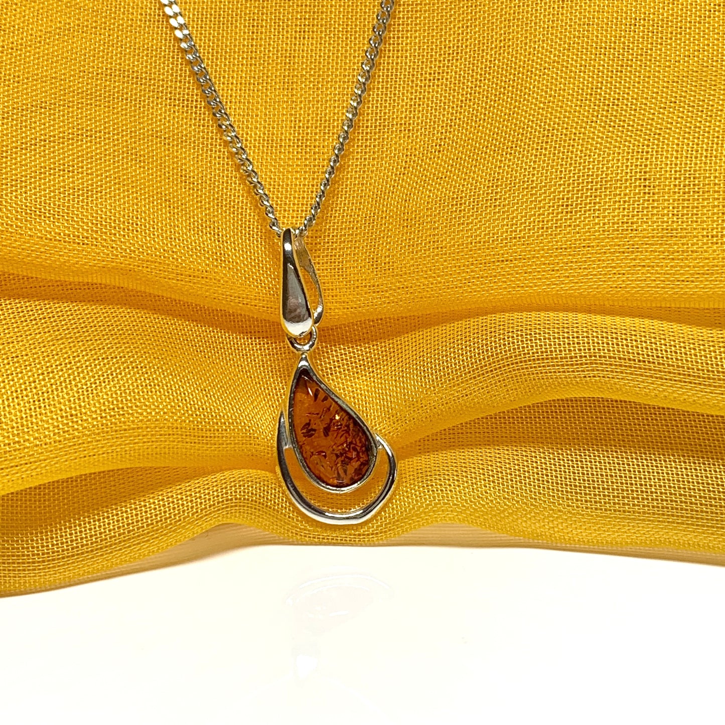 A gorgeous sterling silver pear shaped or tear drop orange real amber necklace pendant, with a smooth rubbed over pierced design to it, on a solid sterling silver curb chain