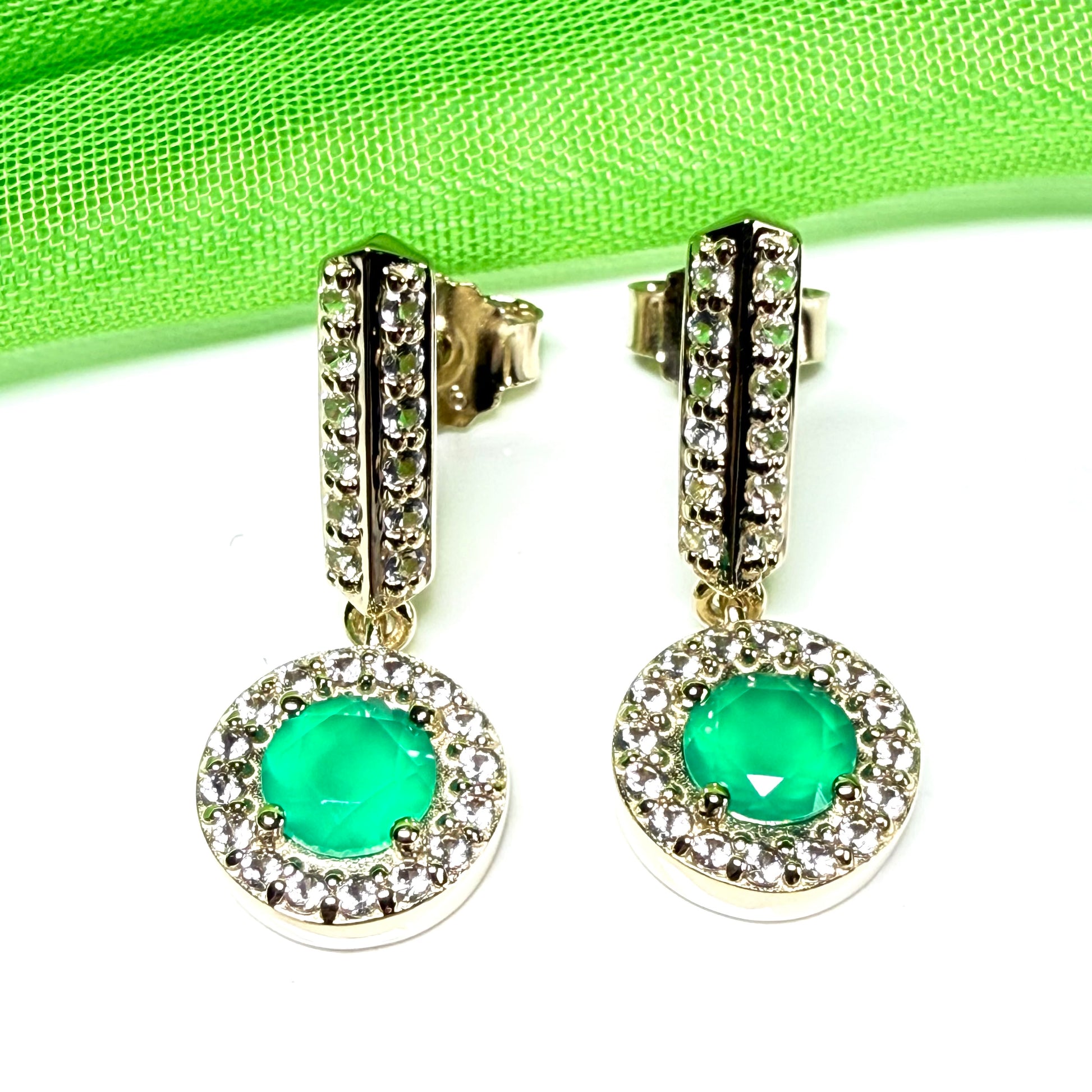 A beautiful pair of real green agate drop earrings, inside a sterling silver setting which are then gold plated, with round shaped real cubic zirconia stones set around it