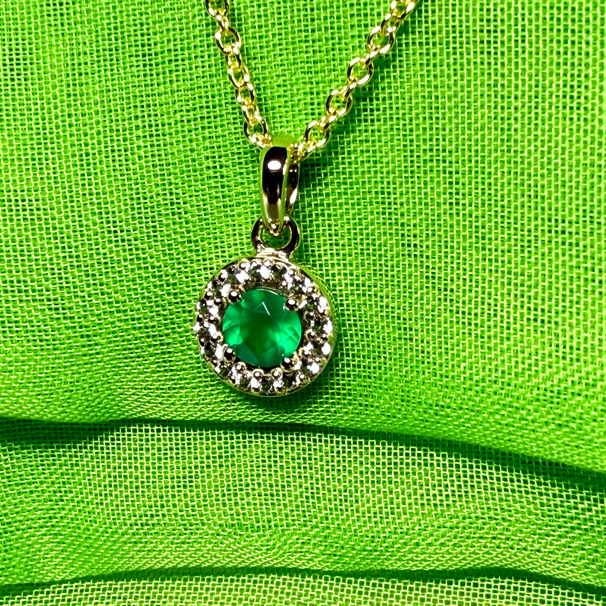 A beautiful real green agate round shaped stone set in a sterling silver necklace with a solid sterling silver chain which is then gold plated, with round shaped real cubic zirconia stones set around it