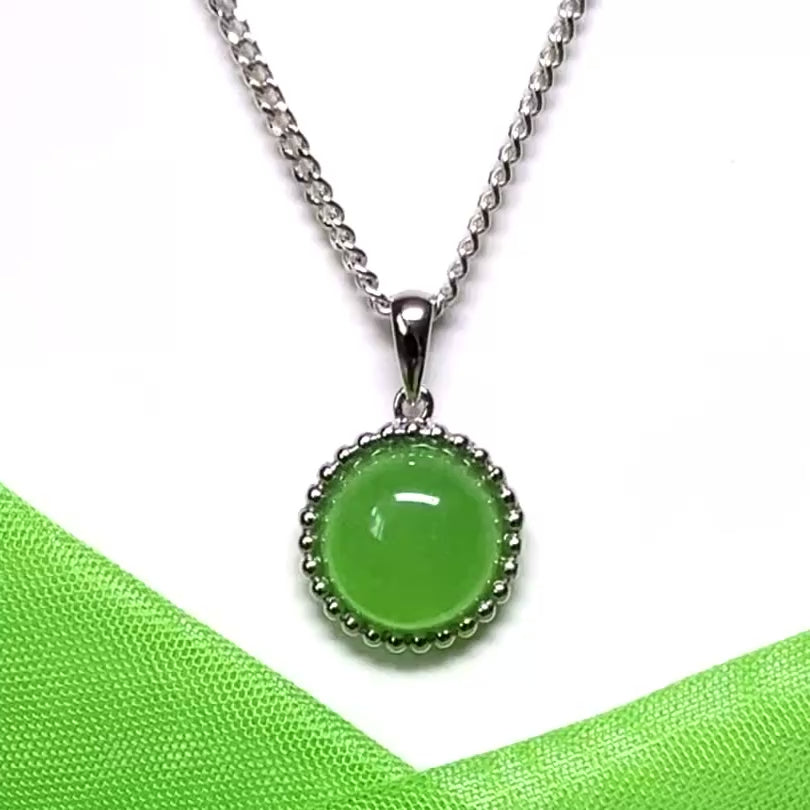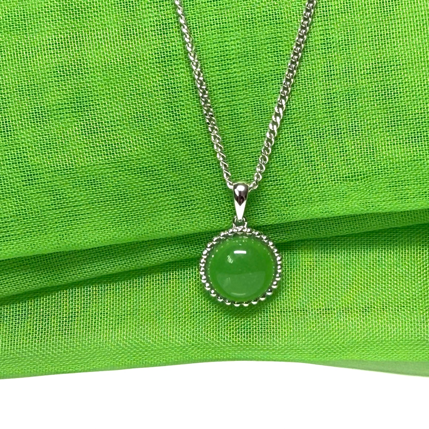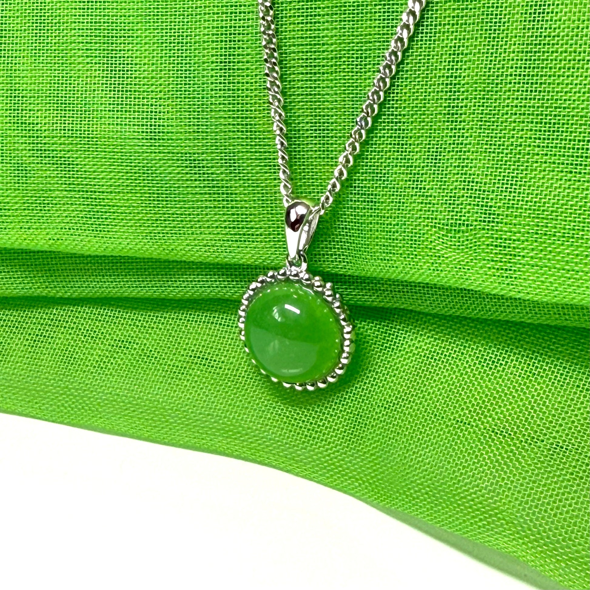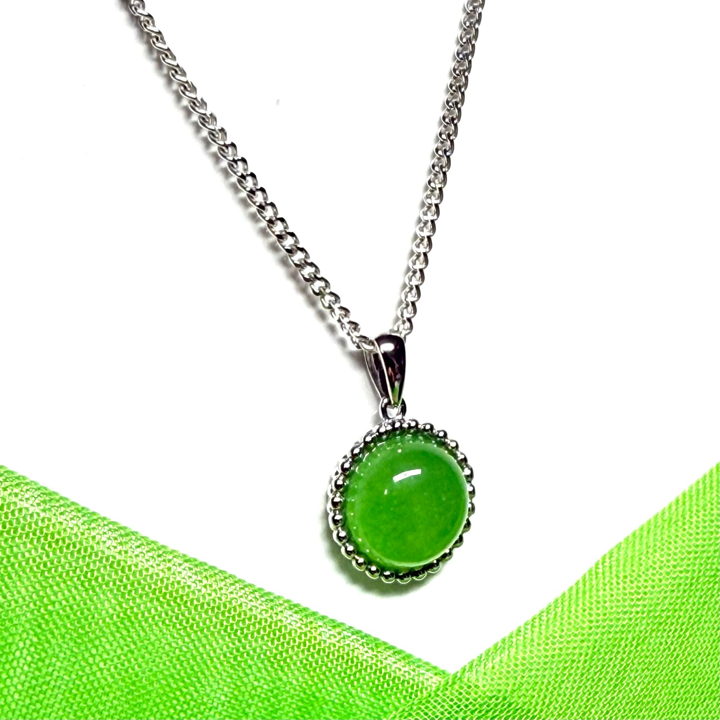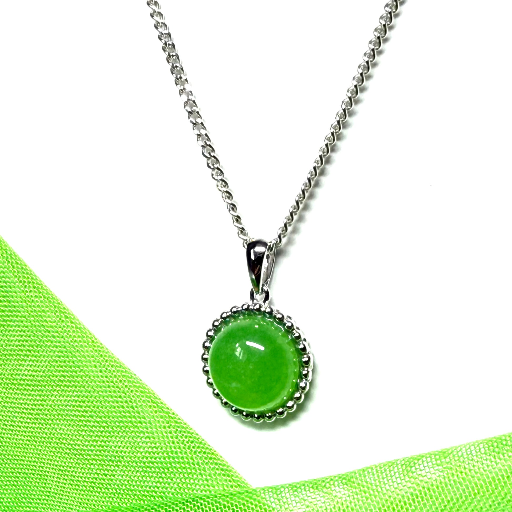 Round green real jade patterned bobbled necklace sterling silver pendant including chain
