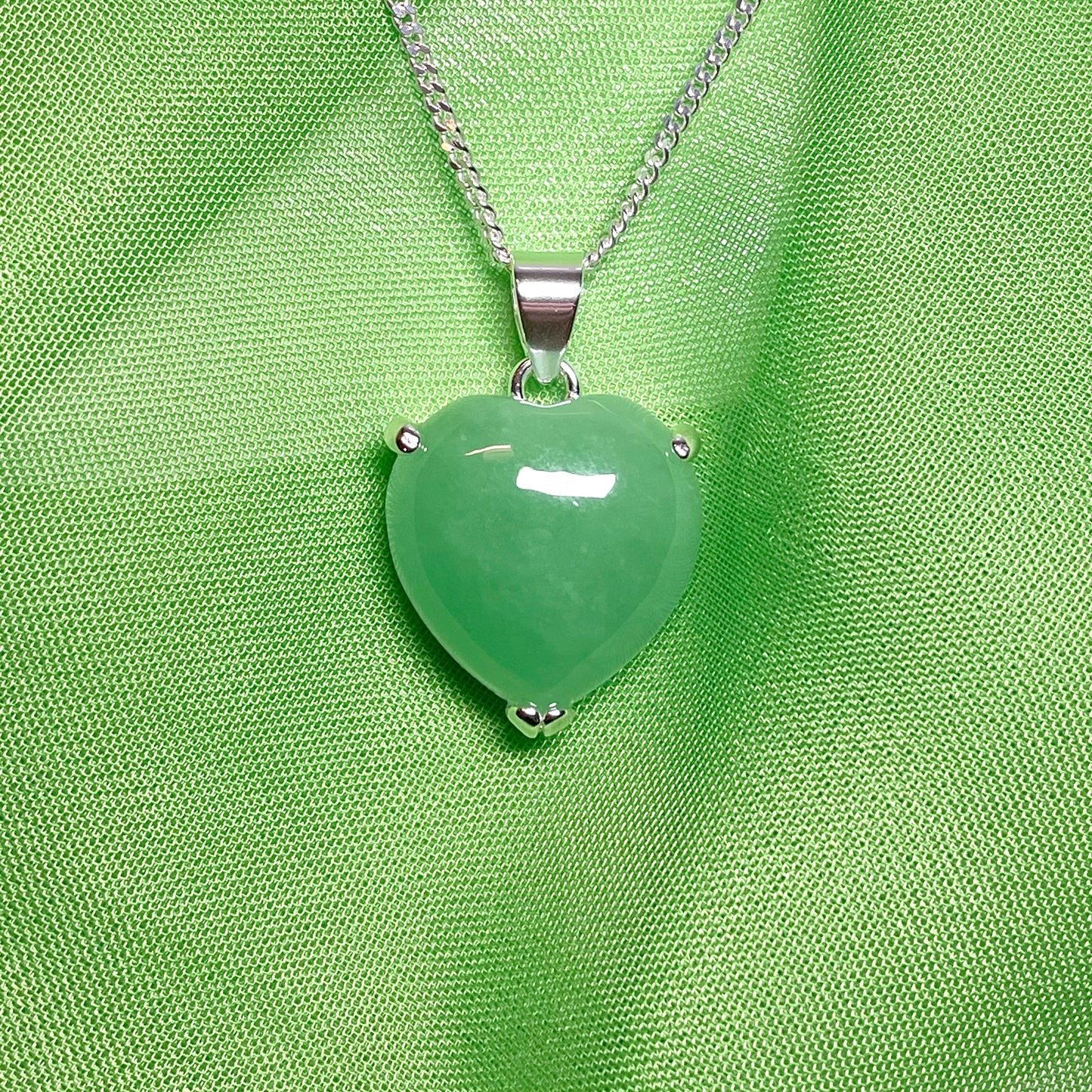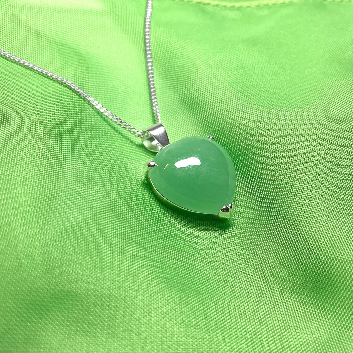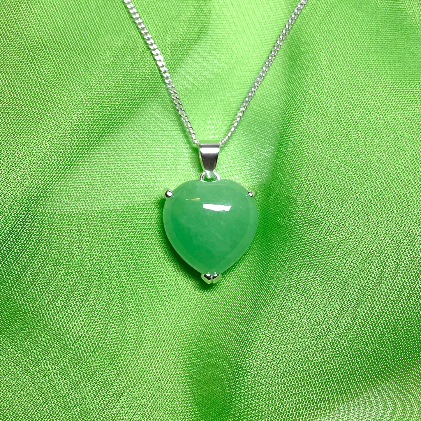 A beautiful heart shaped green jade necklace in sterling silver, with a single heart shaped jade stone in a claw setting, including a solid sterling silver curb chain