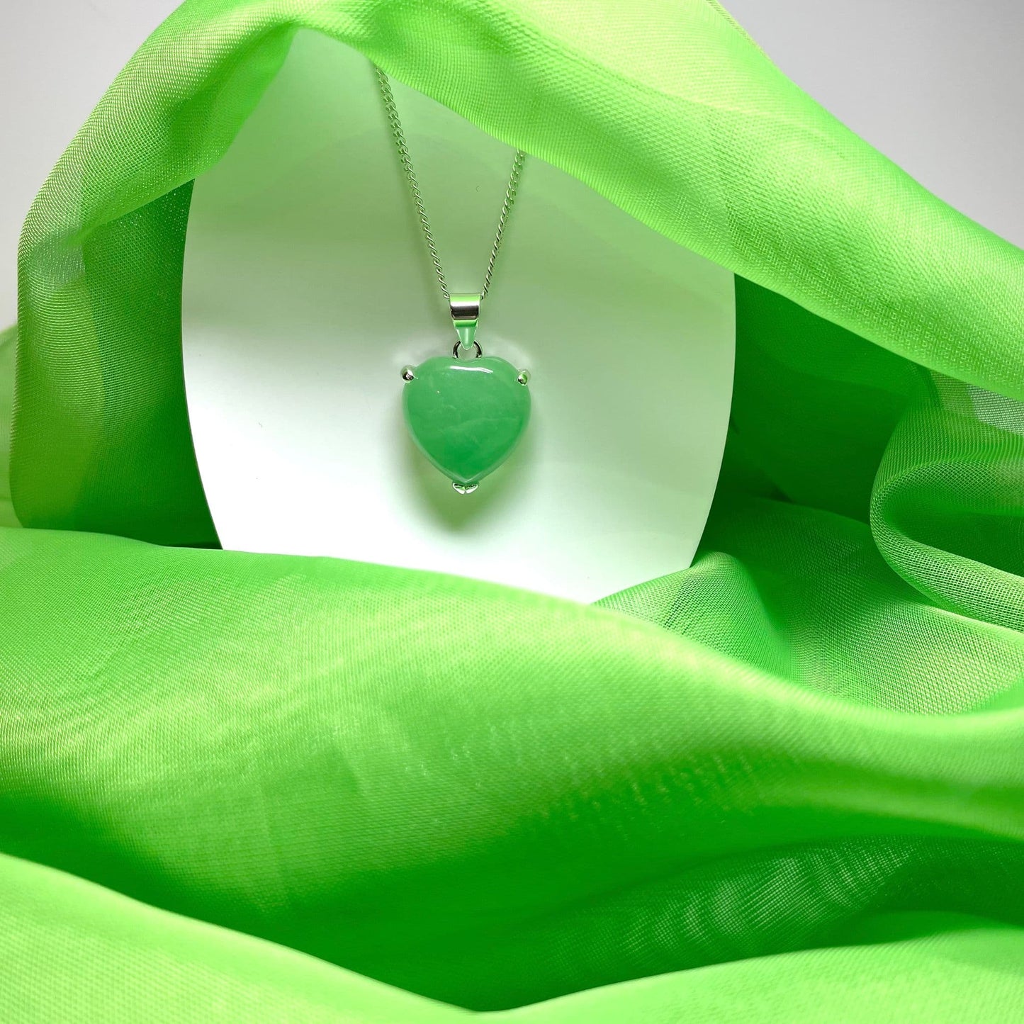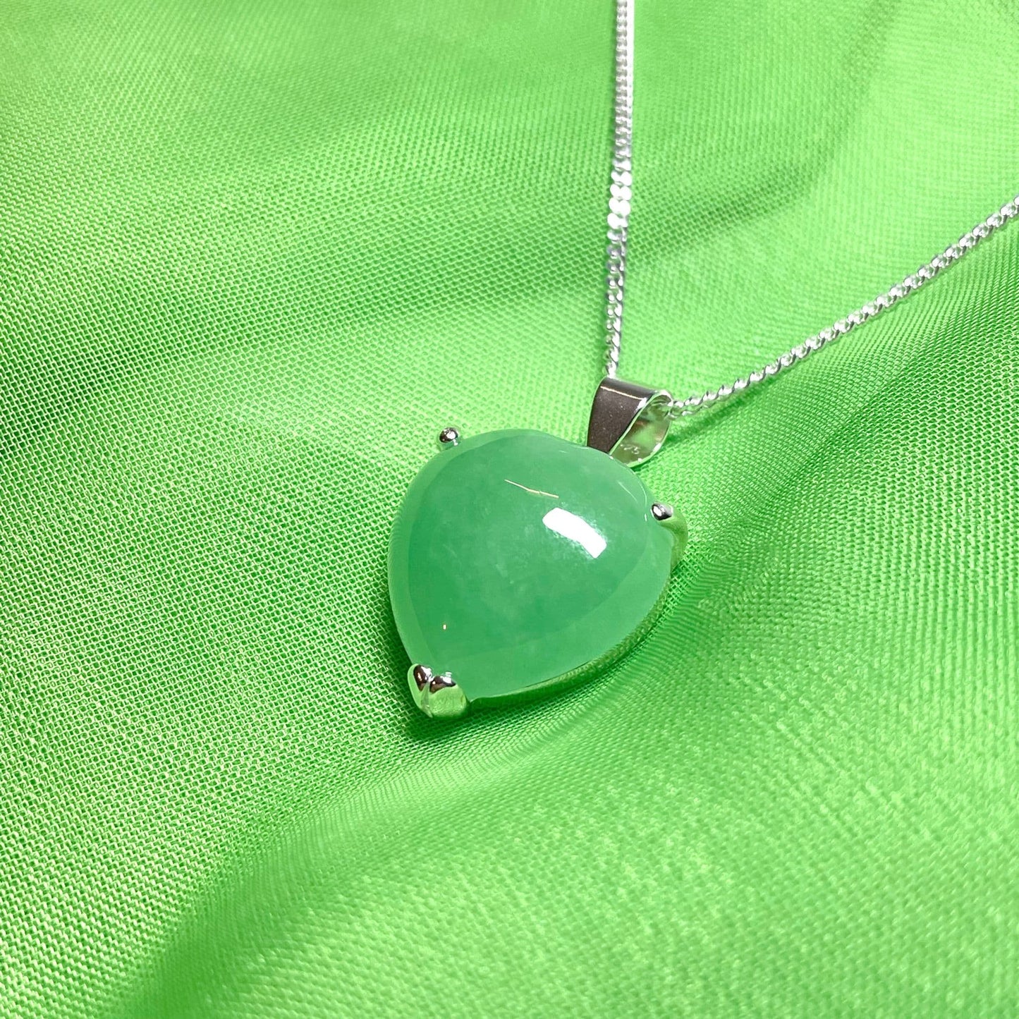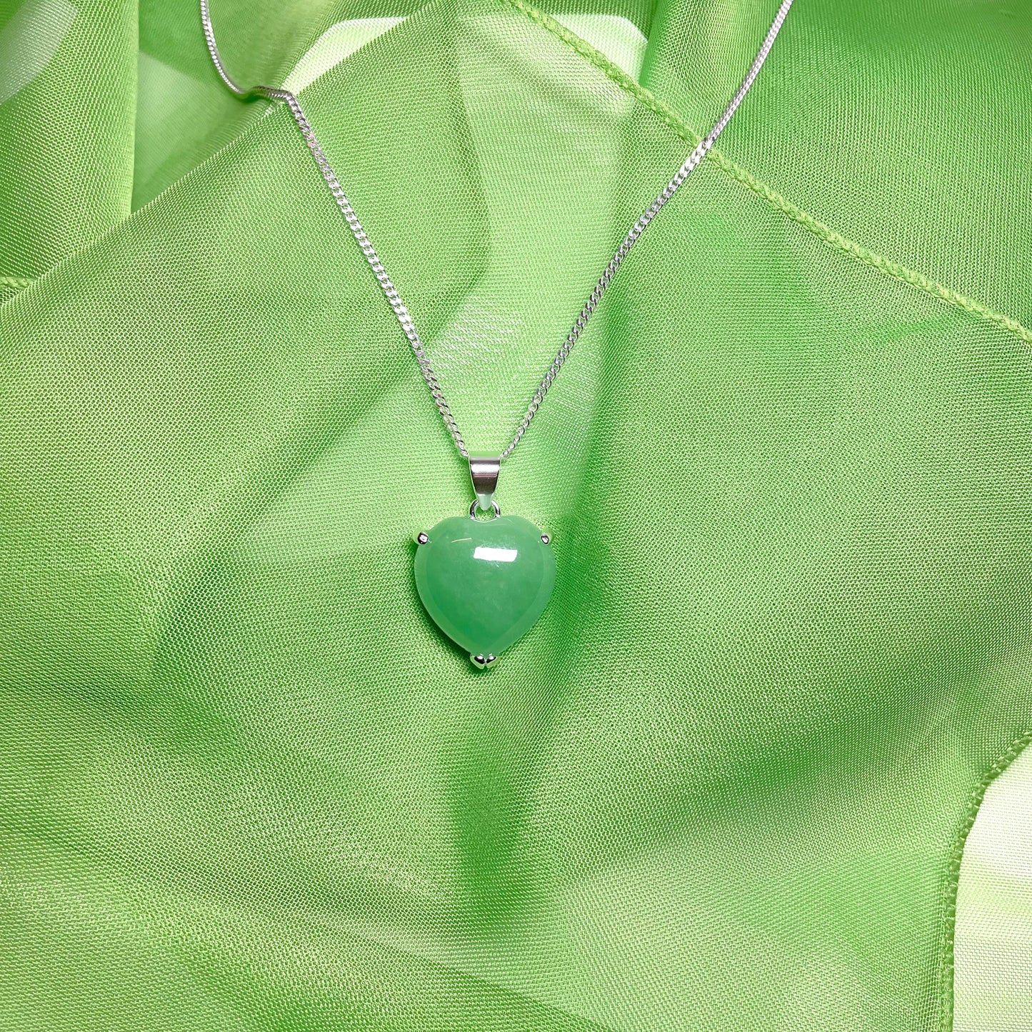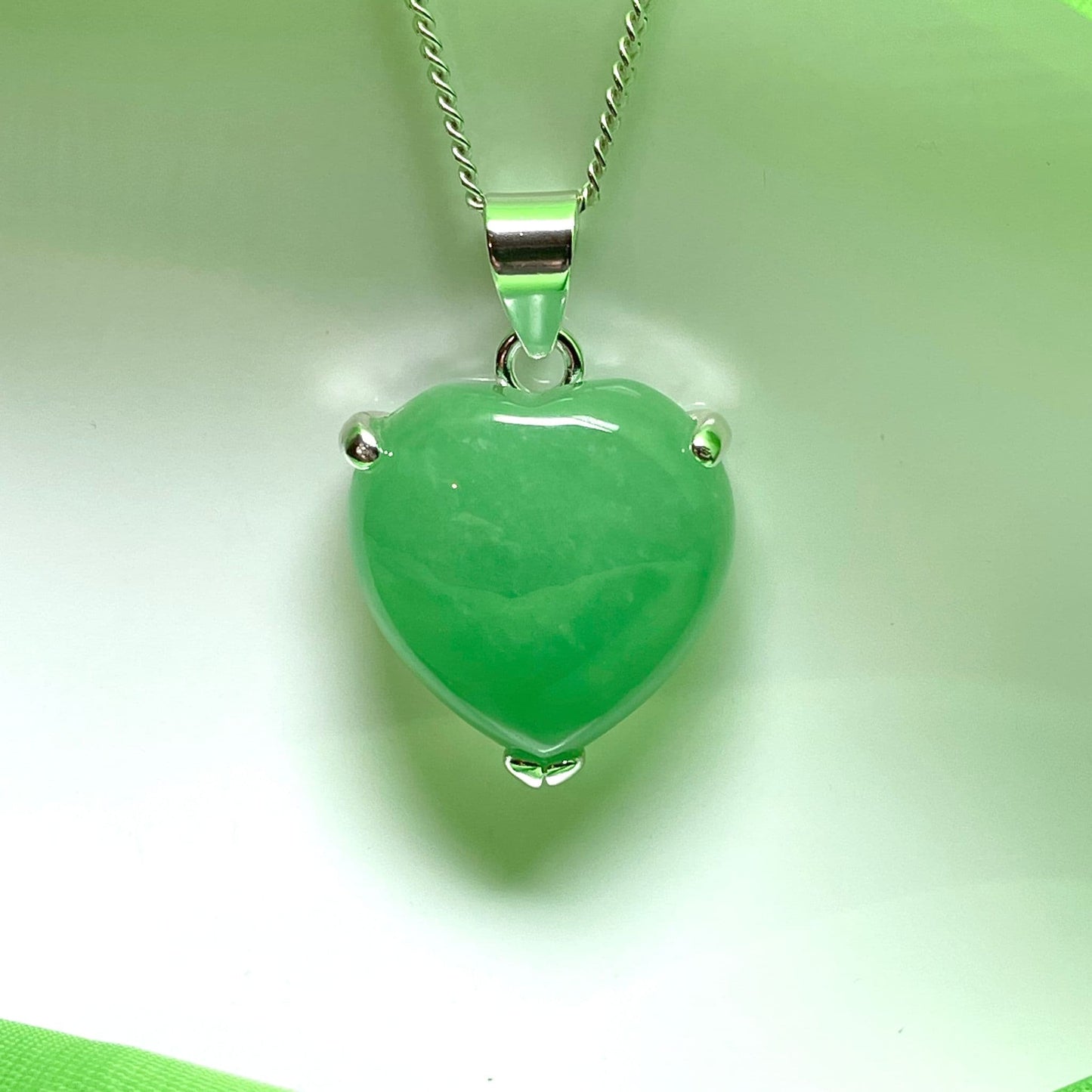 A beautiful heart shaped green jade necklace in sterling silver, with a single heart shaped jade stone in a claw setting, including a solid sterling silver curb chain