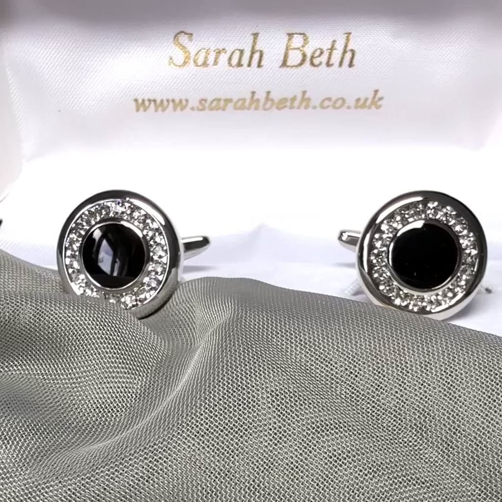 Silver plated crystals with black acrylic centre round cufflinks