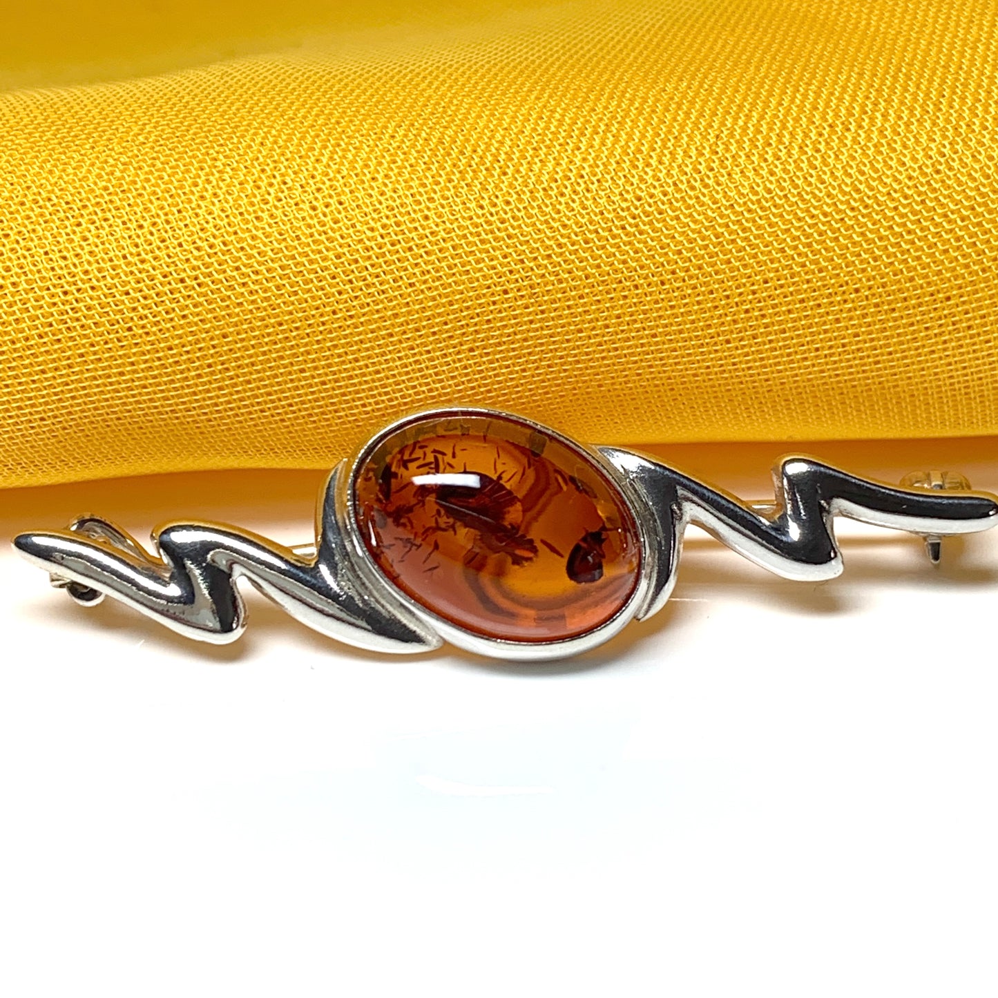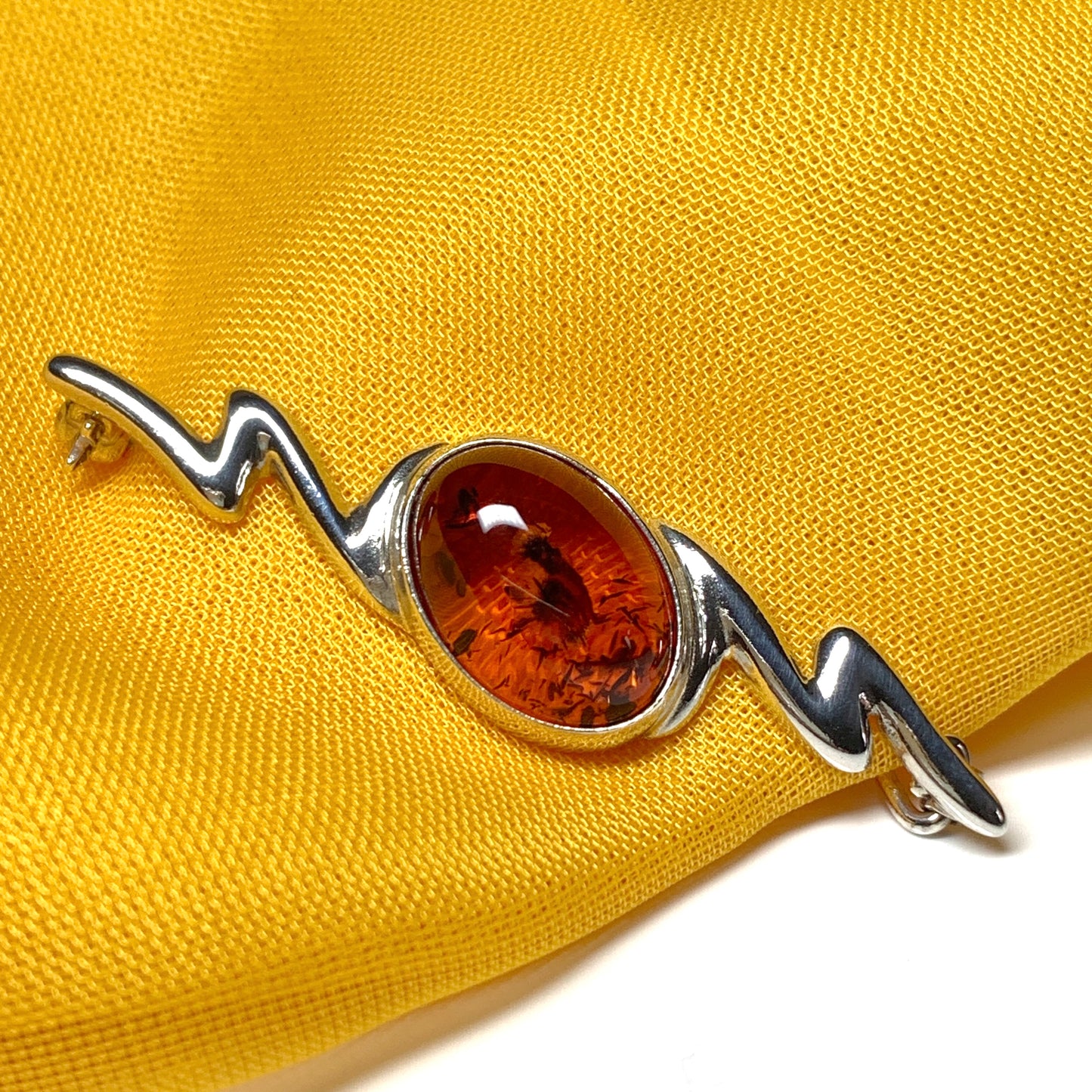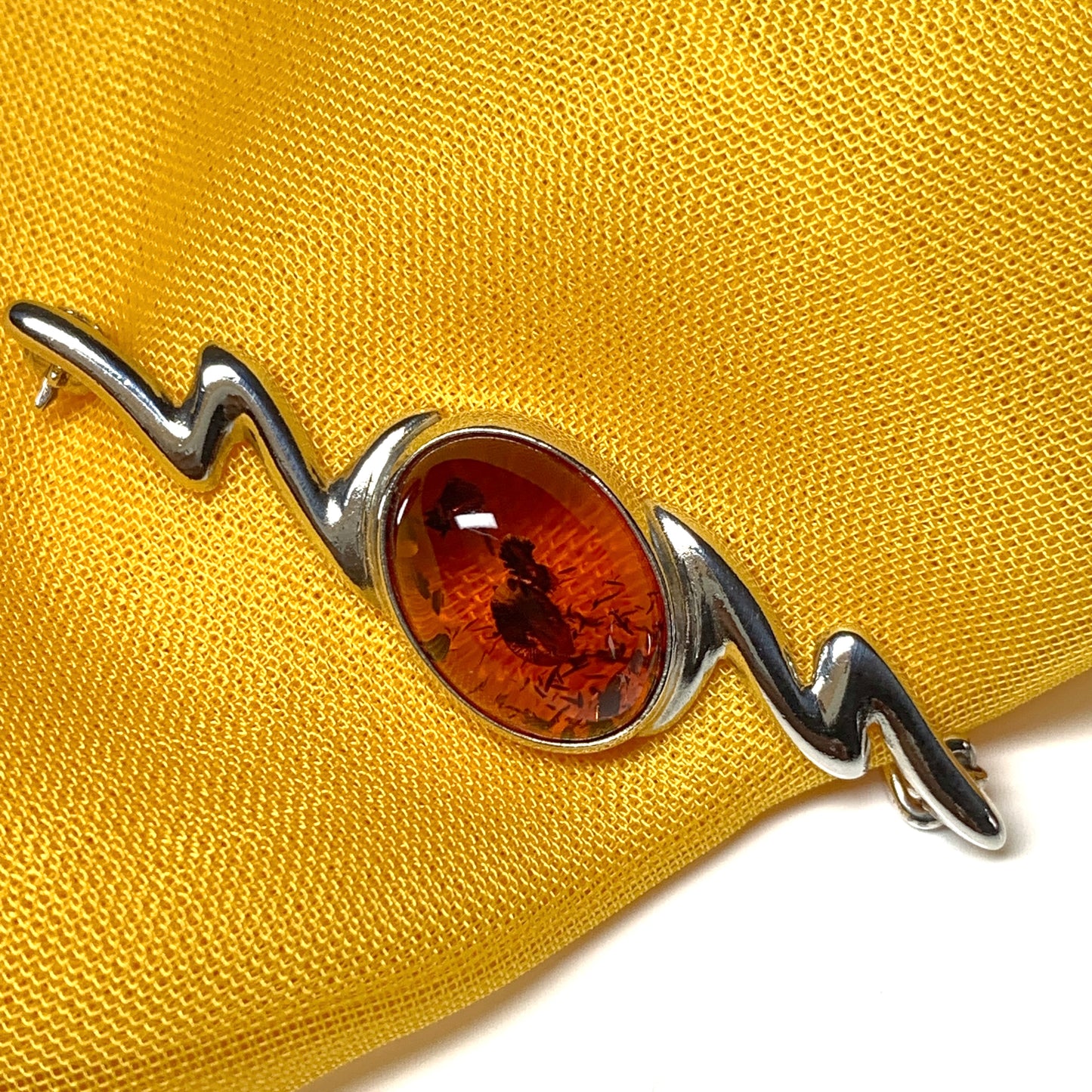 A beautiful zig zag sterling silver bar brooch with an amber stone at it centre. An oval orange amber stone in a rubbed over setting is edging with a zig zag sterling silver design feature either side of it